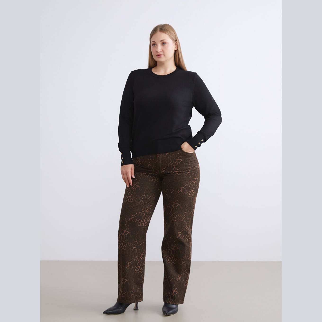 كنزة أنيقة من LCW Classic بلون أسود، مصممة بياقة دائرية (Bisiklet Yaka)، أكمام طويلة، قصة Slim Fit ضيقة، خامة تريكو خفيفة مصنوعة من مزيج الفسكوز والبوليستر بنسبة 72% و28% على التوالي، تمنحك ملمسًا ناعمًا وانسيابية في الحركة. تصميم سادة مخصص لمجموعة المقاسات الكبيرة، مثالي للتنسيق مع بنطال قماشي أو تنورة مستقيمة لإطلالة يومية أنيقة ومريحة.