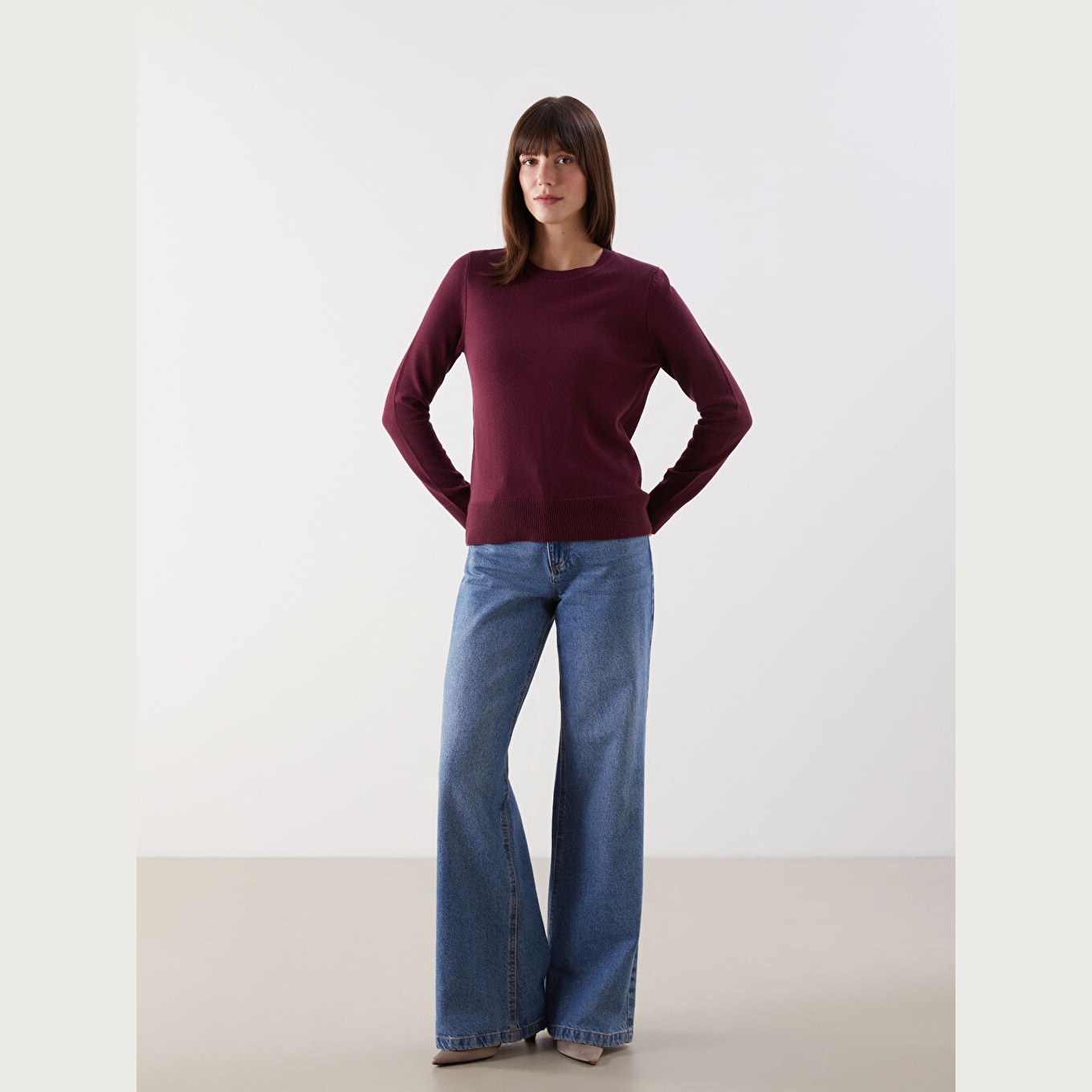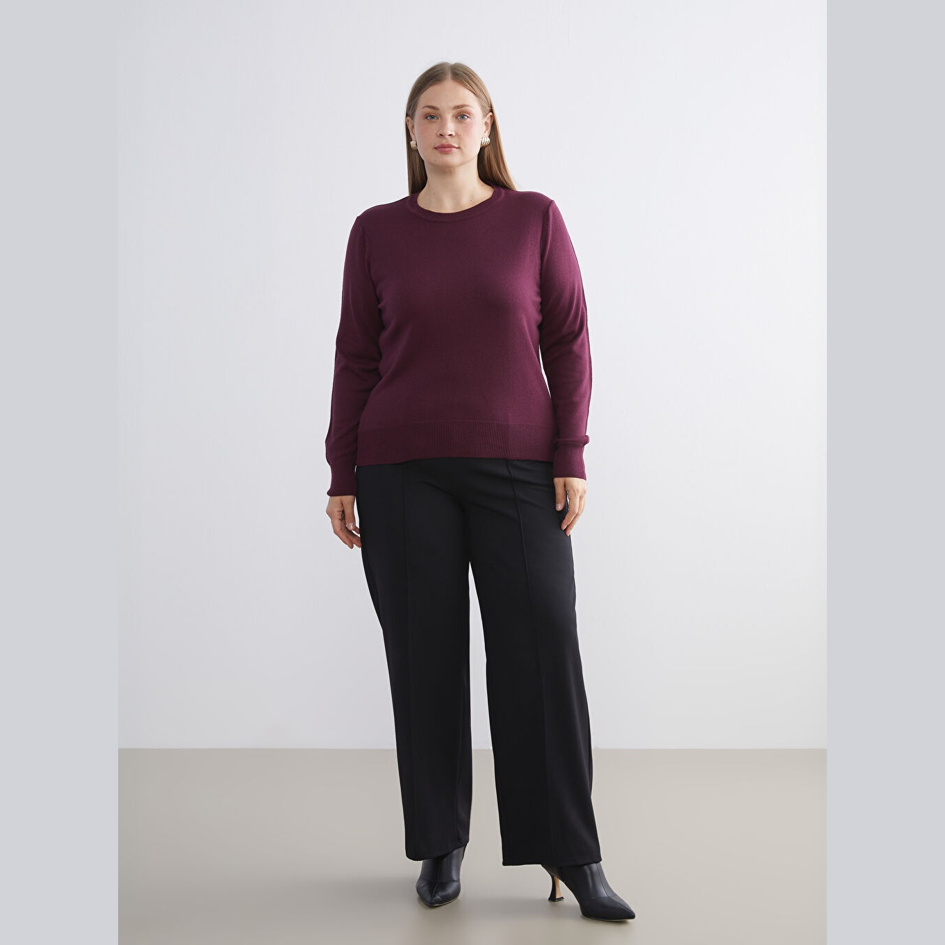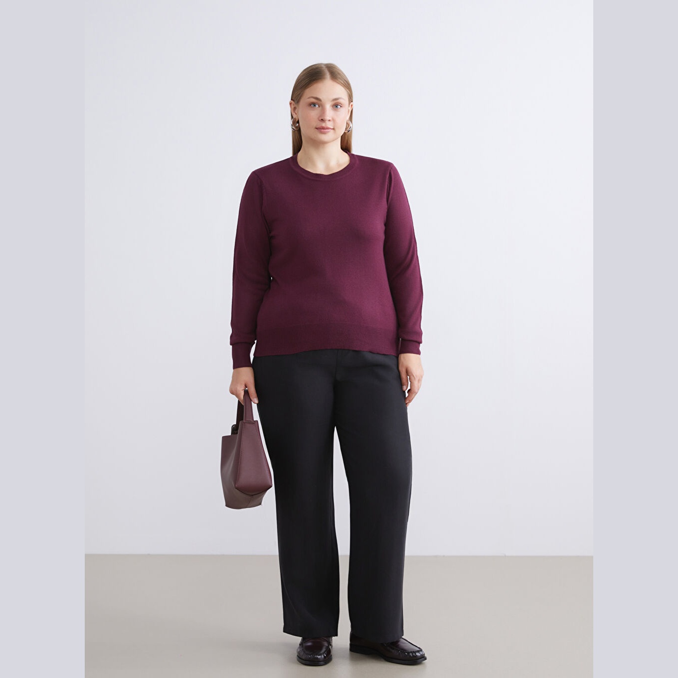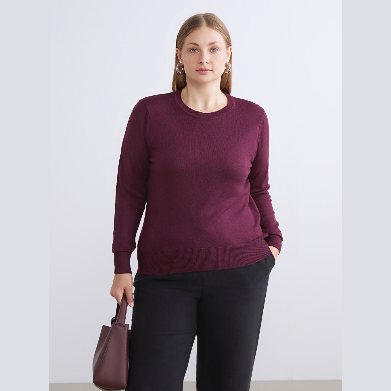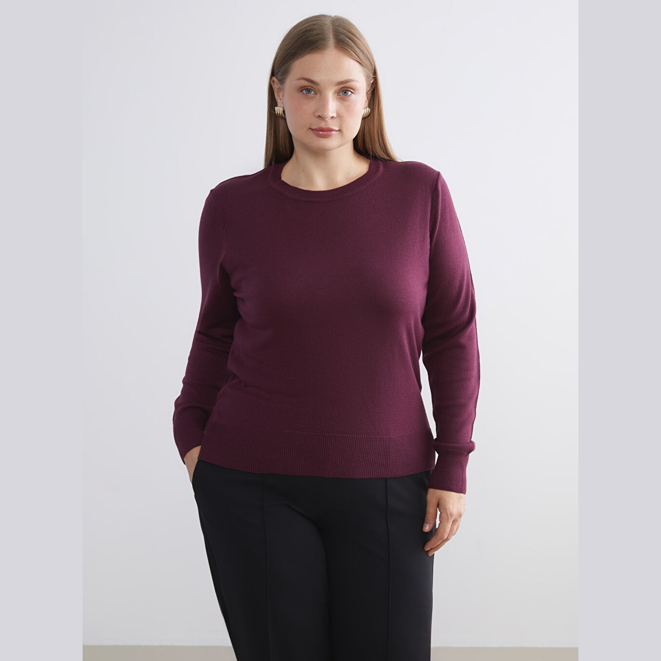 كنزة نسائية بياقة دائرية من LCW Comfort – بوردو (مقاس كبير)