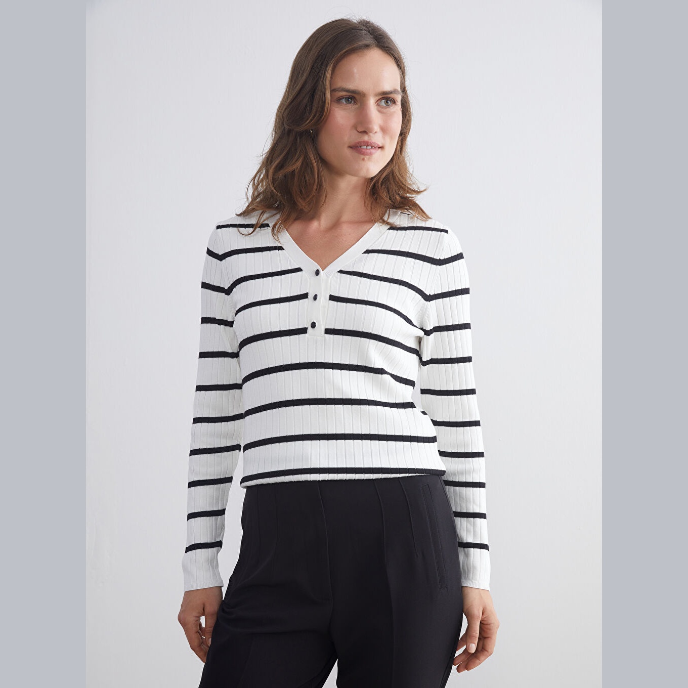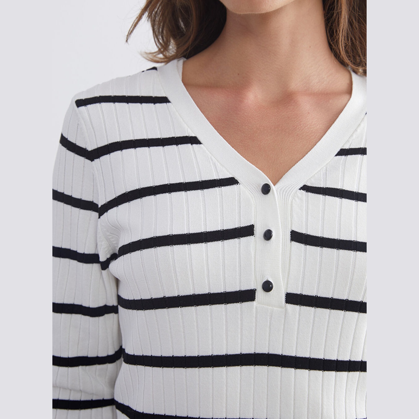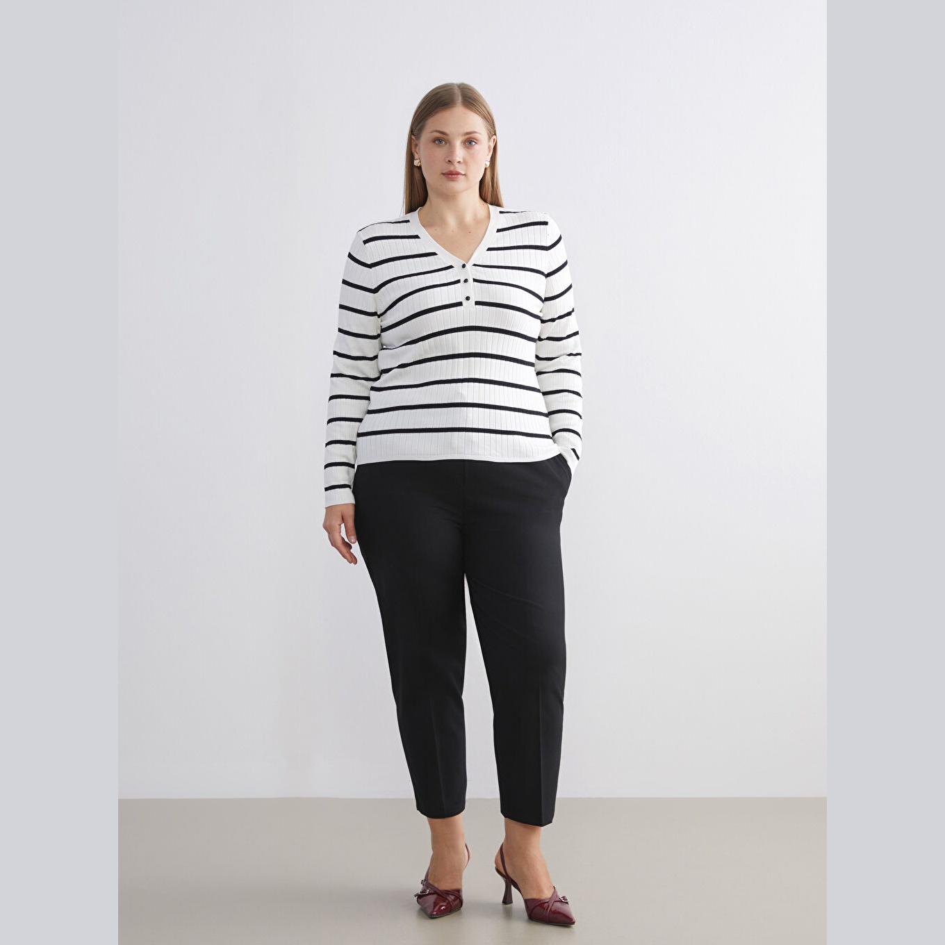 كنزة أنيقة من LCW Classic بلون إكرو هادئ، مصممة بياقة V، أكمام طويلة، قصة Super Skinny ضيقة جدًا تمنحك مظهرًا محددًا وانسيابيًا، خامة تريكو خفيفة بنقشة خطوط أفقية، مصنوعة من مزيج الفسكوز والبوليستر بنسبة 73% و27%، بطول يُقاس من الكتف، ضمن مجموعة المقاسات الكبيرة. مثالية للتنسيق مع بنطال جينز أو تنورة مستقيمة لإطلالة يومية أنيقة وعملية.