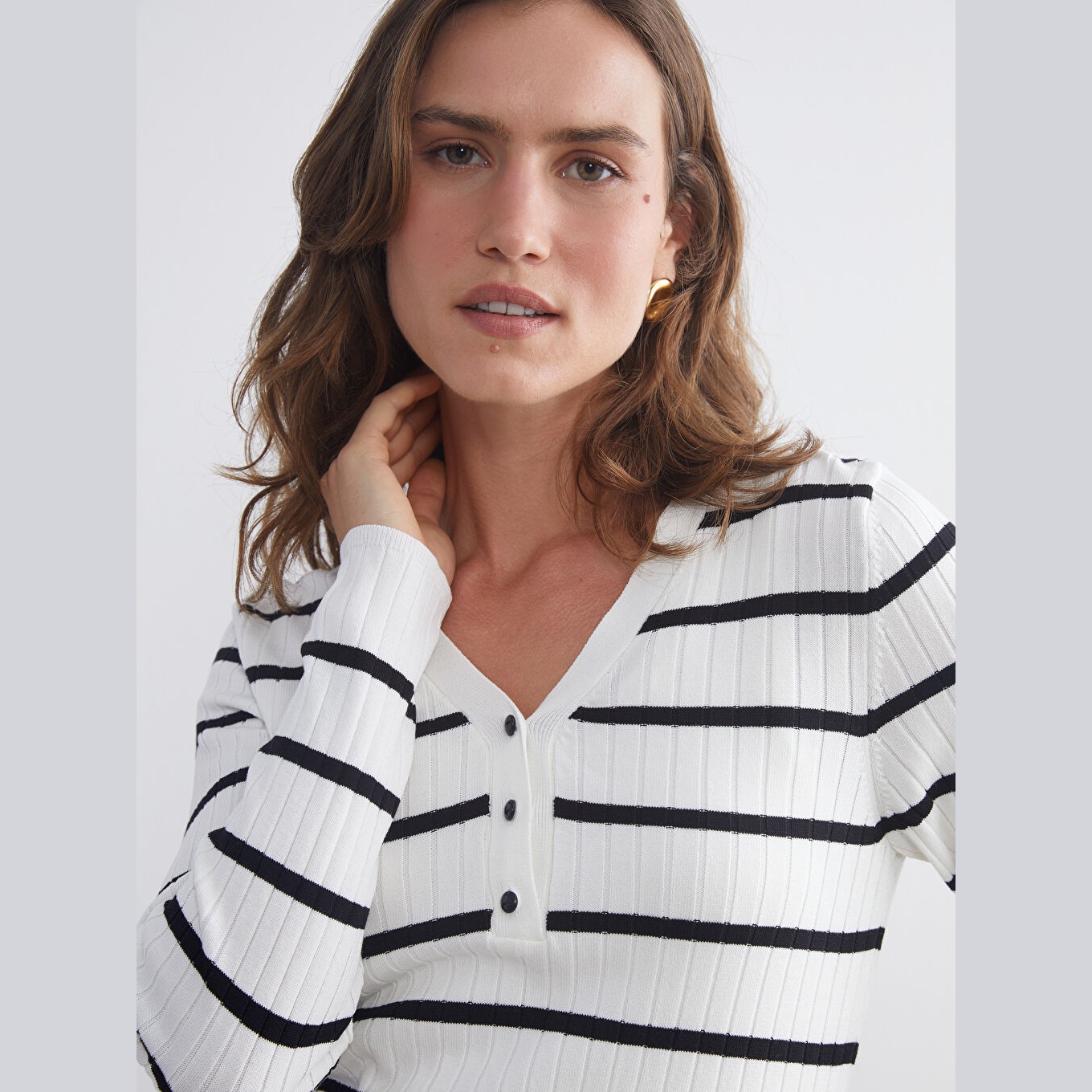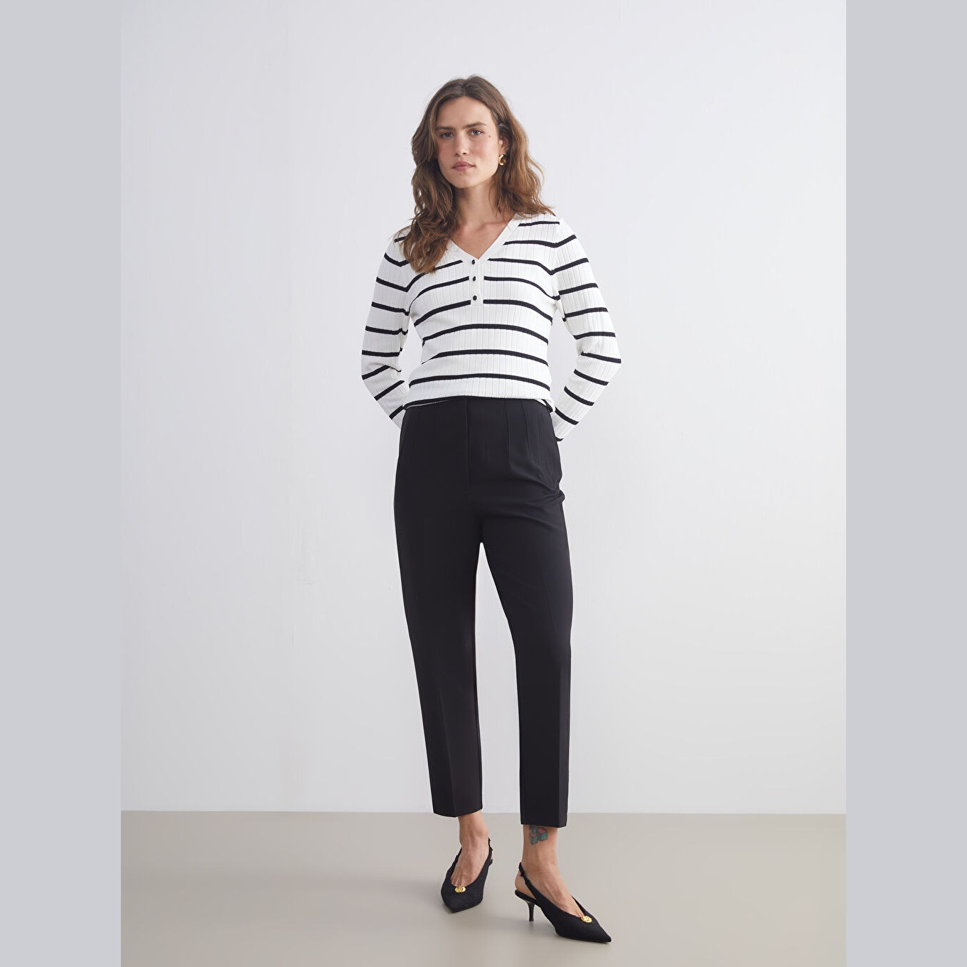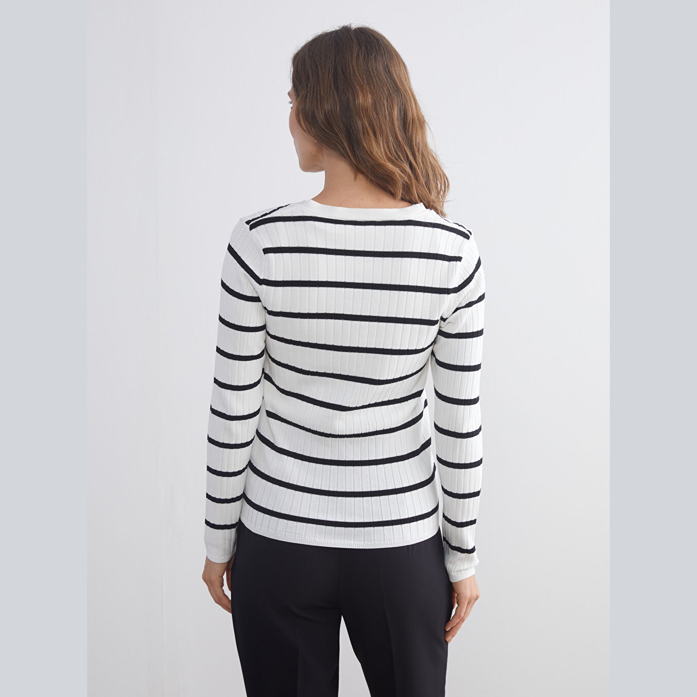كنزة أنيقة من LCW Classic بلون إكرو هادئ، مصممة بياقة V، أكمام طويلة، قصة Super Skinny ضيقة جدًا تمنحك مظهرًا محددًا وانسيابيًا، خامة تريكو خفيفة بنقشة خطوط أفقية، مصنوعة من مزيج الفسكوز والبوليستر بنسبة 73% و27%، بطول يُقاس من الكتف، ضمن مجموعة المقاسات الكبيرة. مثالية للتنسيق مع بنطال جينز أو تنورة مستقيمة لإطلالة يومية أنيقة وعملية.