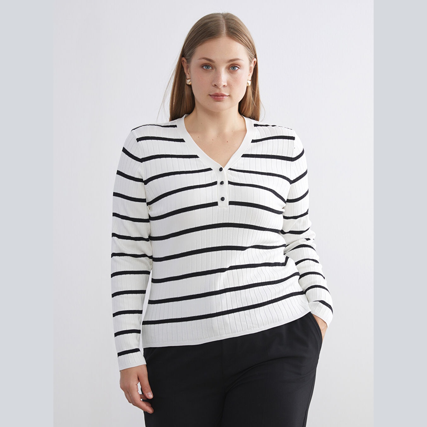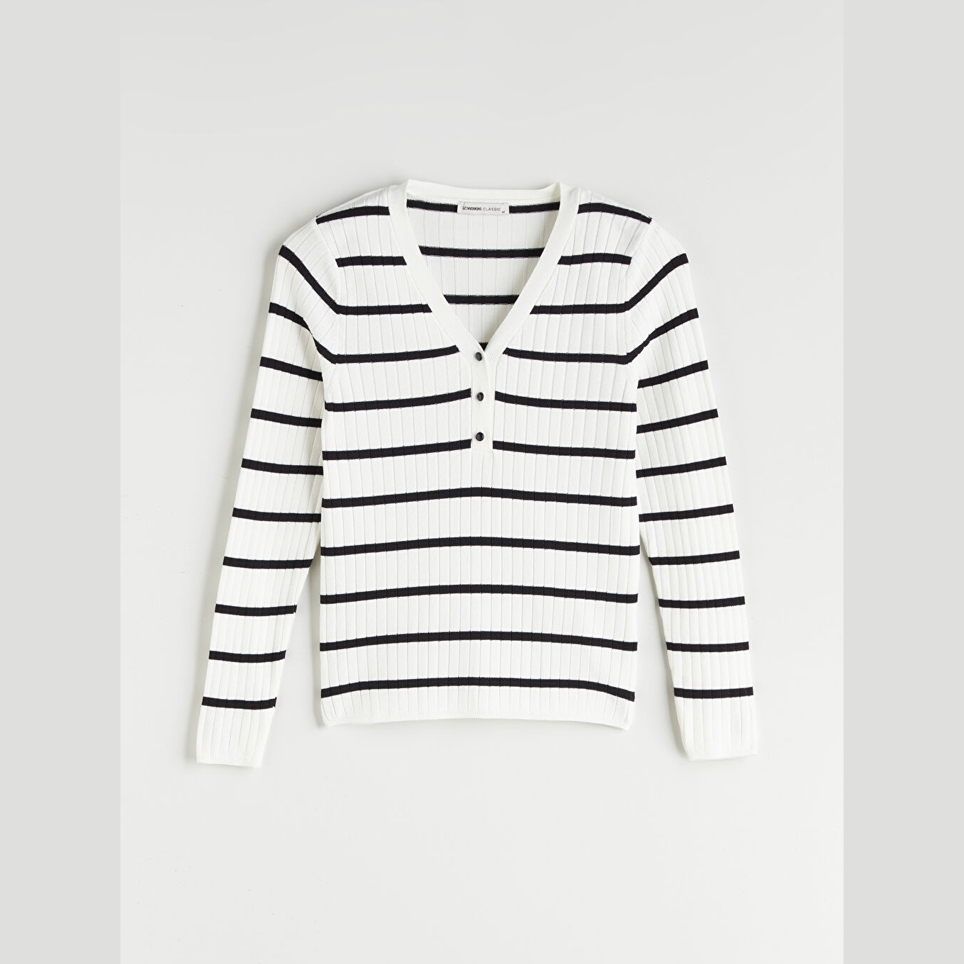 كنزة نسائية بياقة V ونقشة خطوط من LCW Classic – إكرو (مقاس كبير)