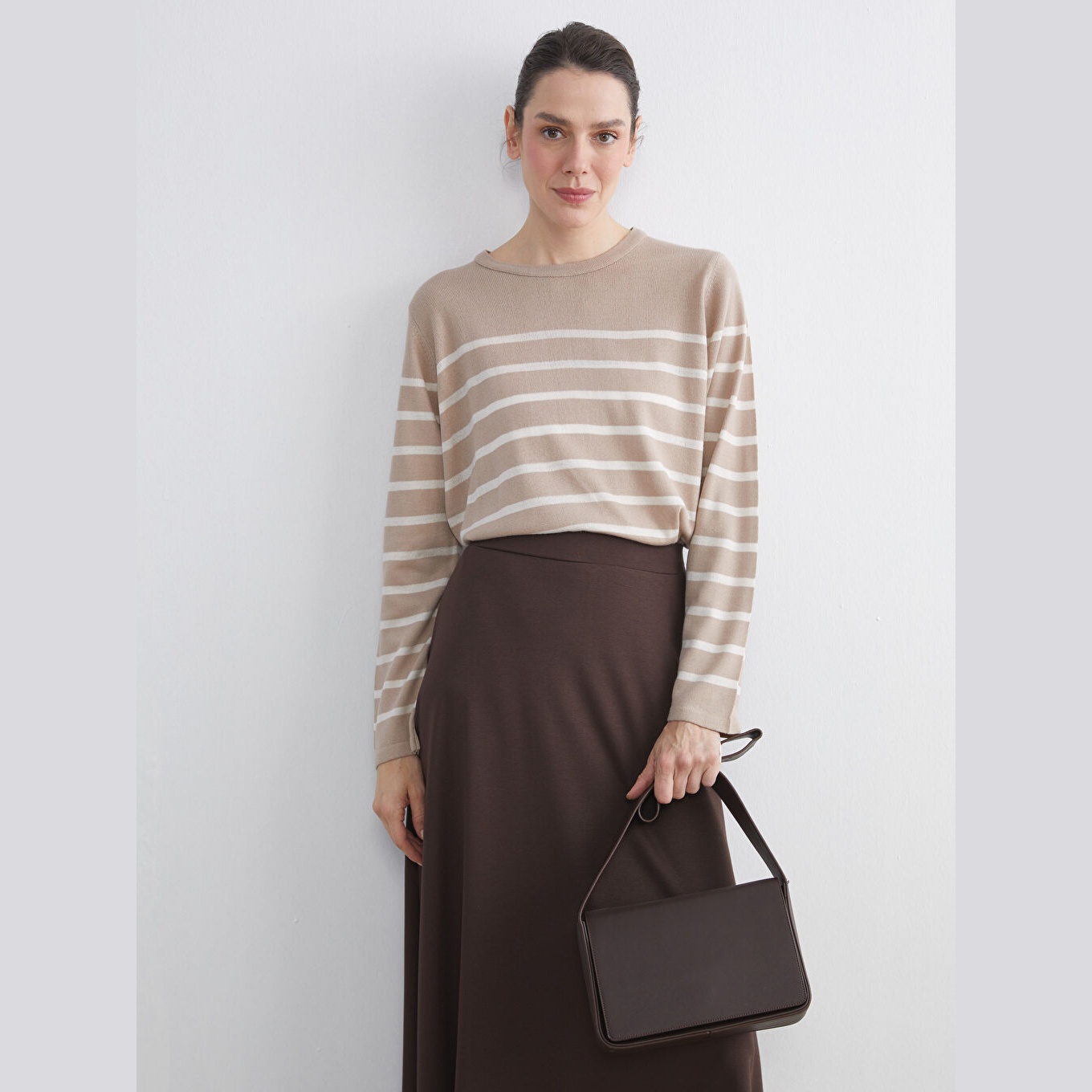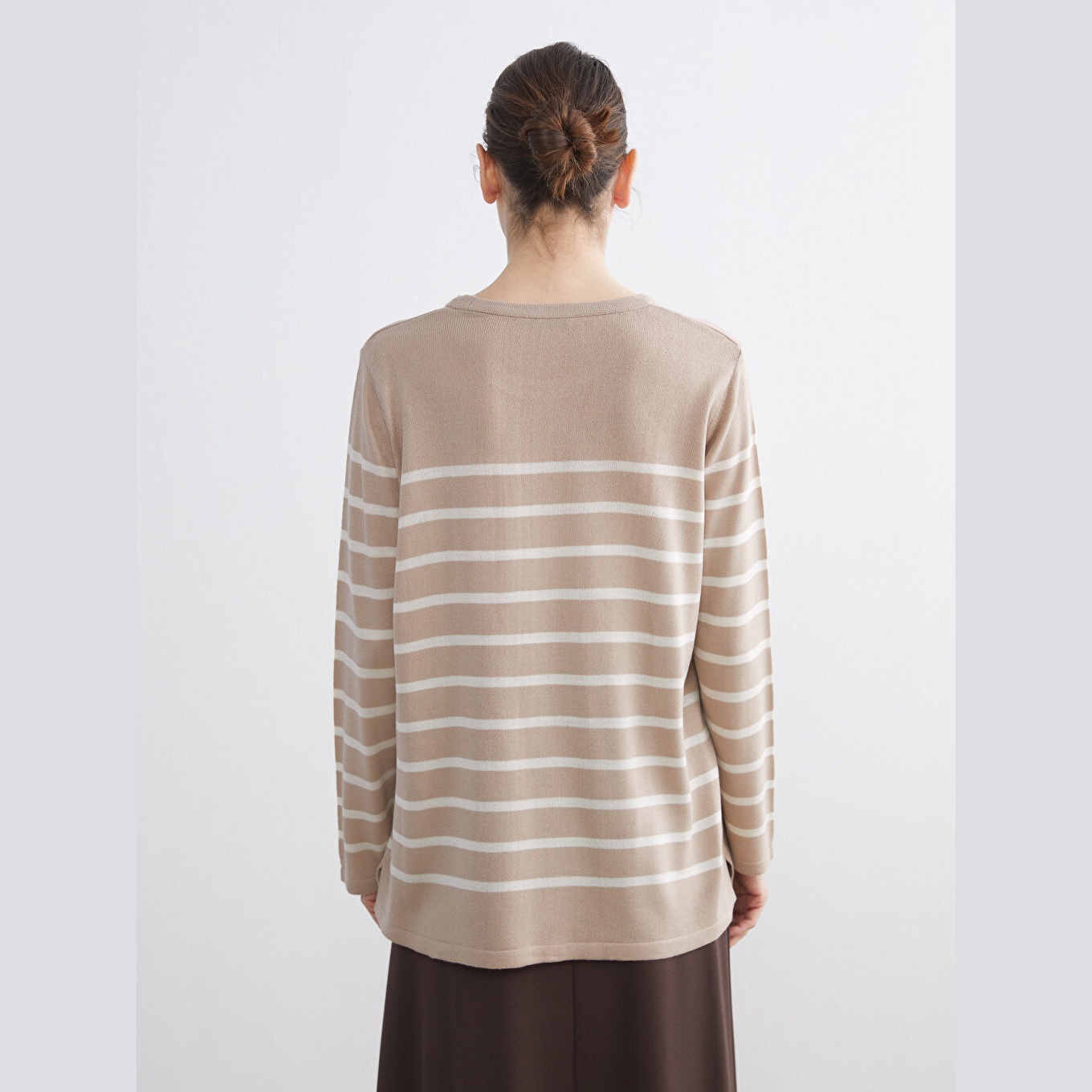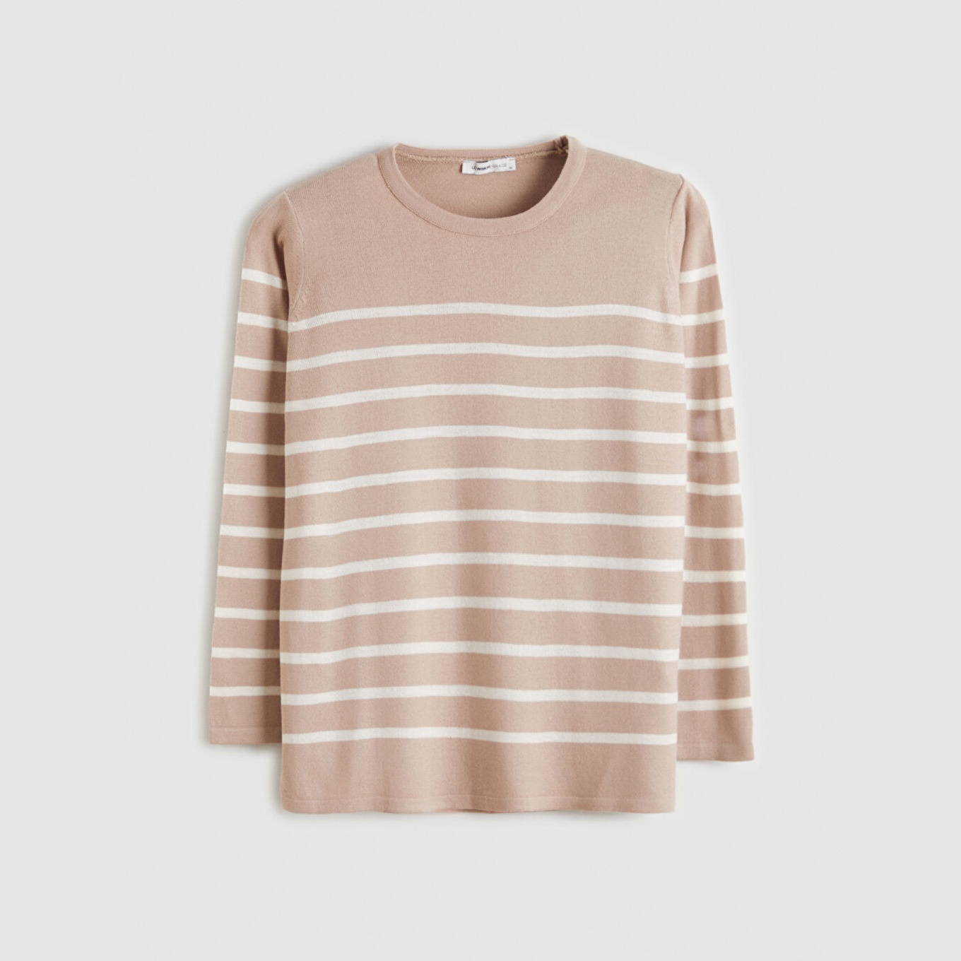 كنزة نسائية بياقة دائرية ونقشة خطوط من LCW Grace – بيج (مقاس كبير)