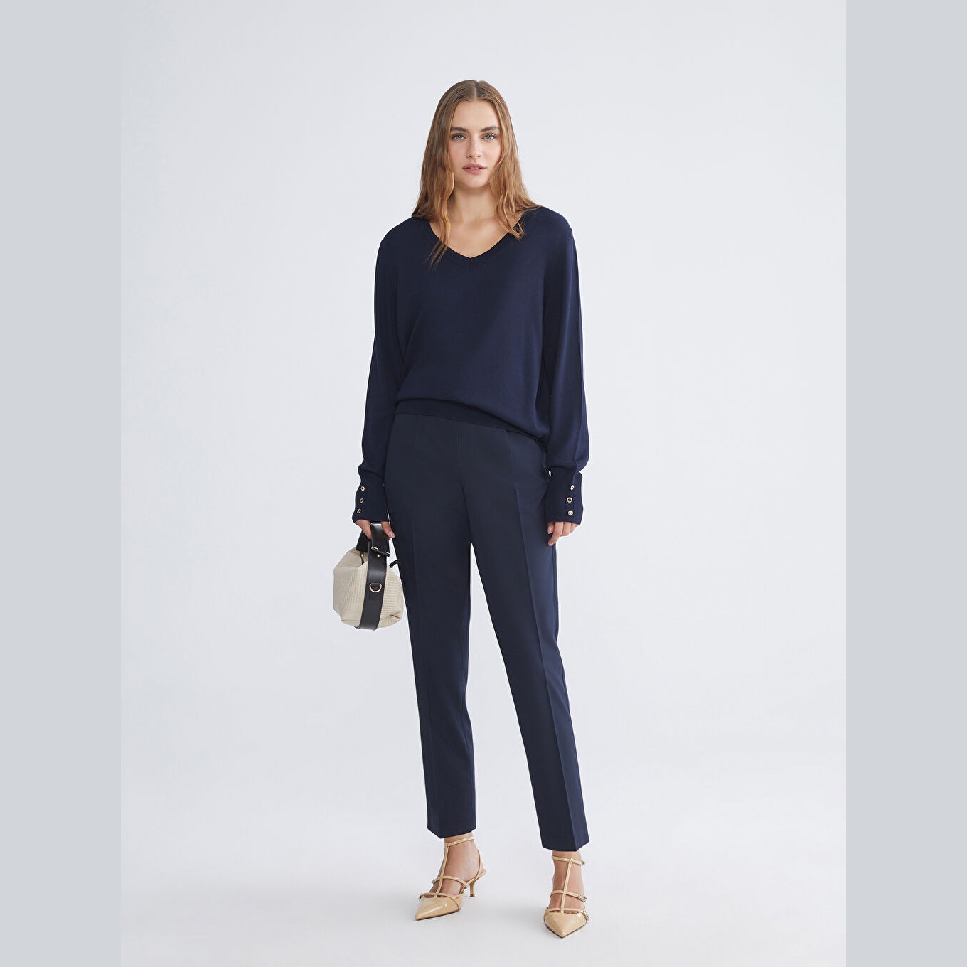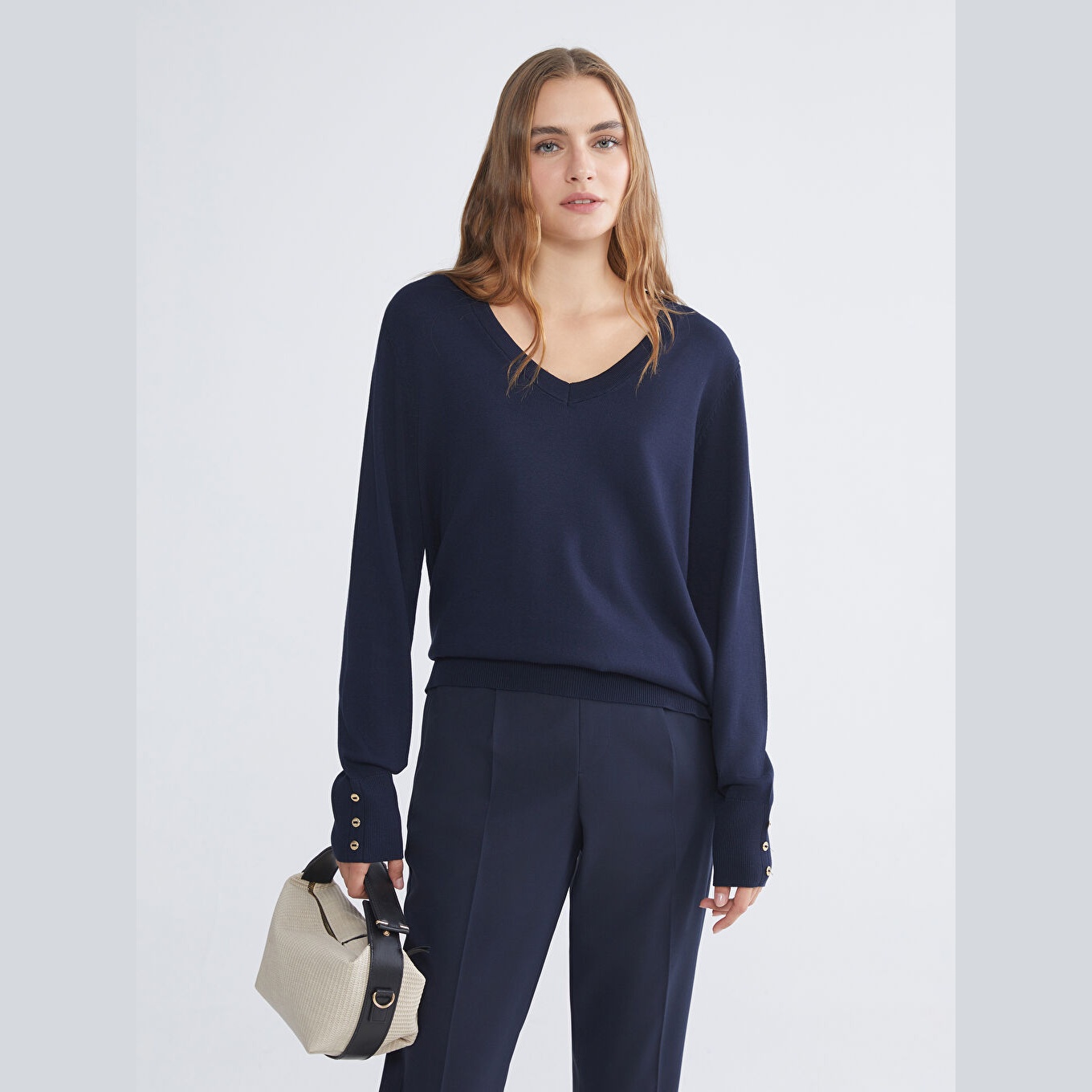 كنزة أنيقة من LCW Classic بلون كحلي جذاب، مصممة بياقة V، أكمام طويلة، قصة Slim Fit ضيقة تمنحك مظهرًا محددًا وانسيابيًا، خامة تريكو خفيفة وناعمة بسطح سادة بدون نقشة. مصنوعة من مزيج الفسكوز والبوليستر بنسبة 73% و27%، بطول يُقاس من الكتف، ضمن مجموعة المقاسات الكبيرة. مثالية للتنسيق مع بنطال جينز أو تنورة مستقيمة لإطلالة يومية أنيقة وعملية.