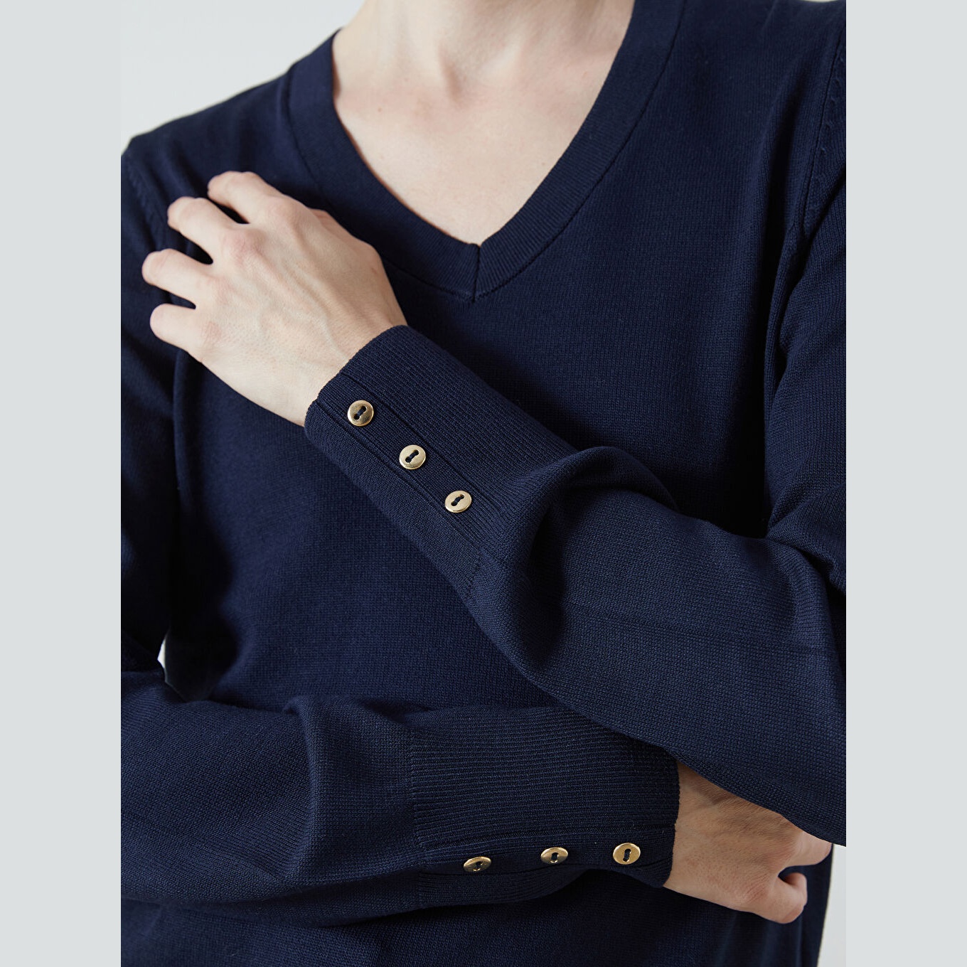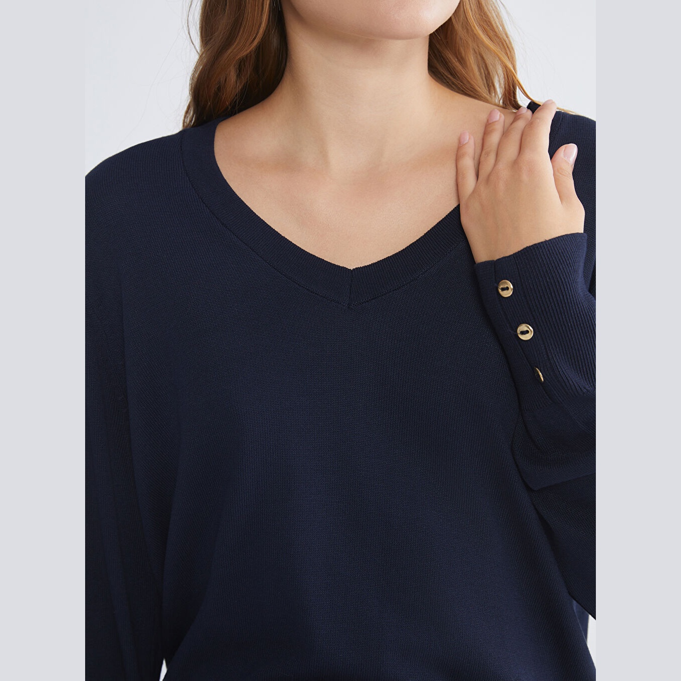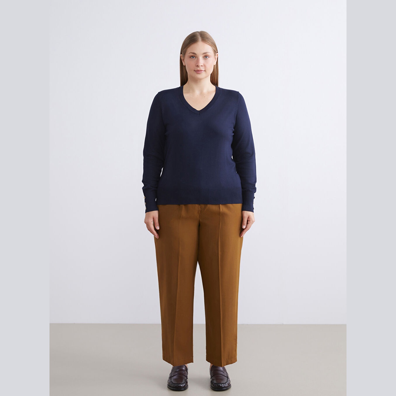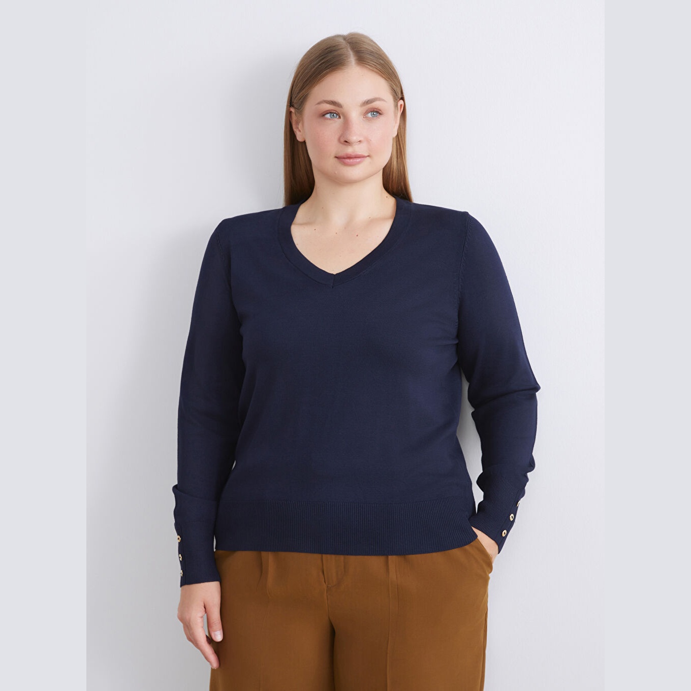 كنزة نسائية بياقة V من LCW Classic – كحلي (مقاس كبير، قصة ضيقة)