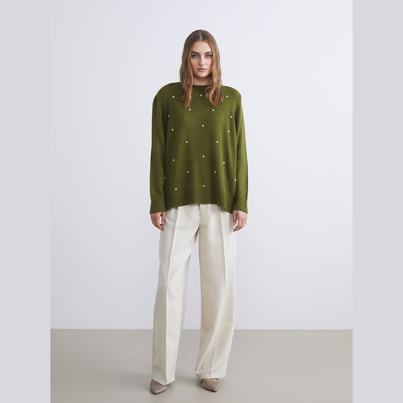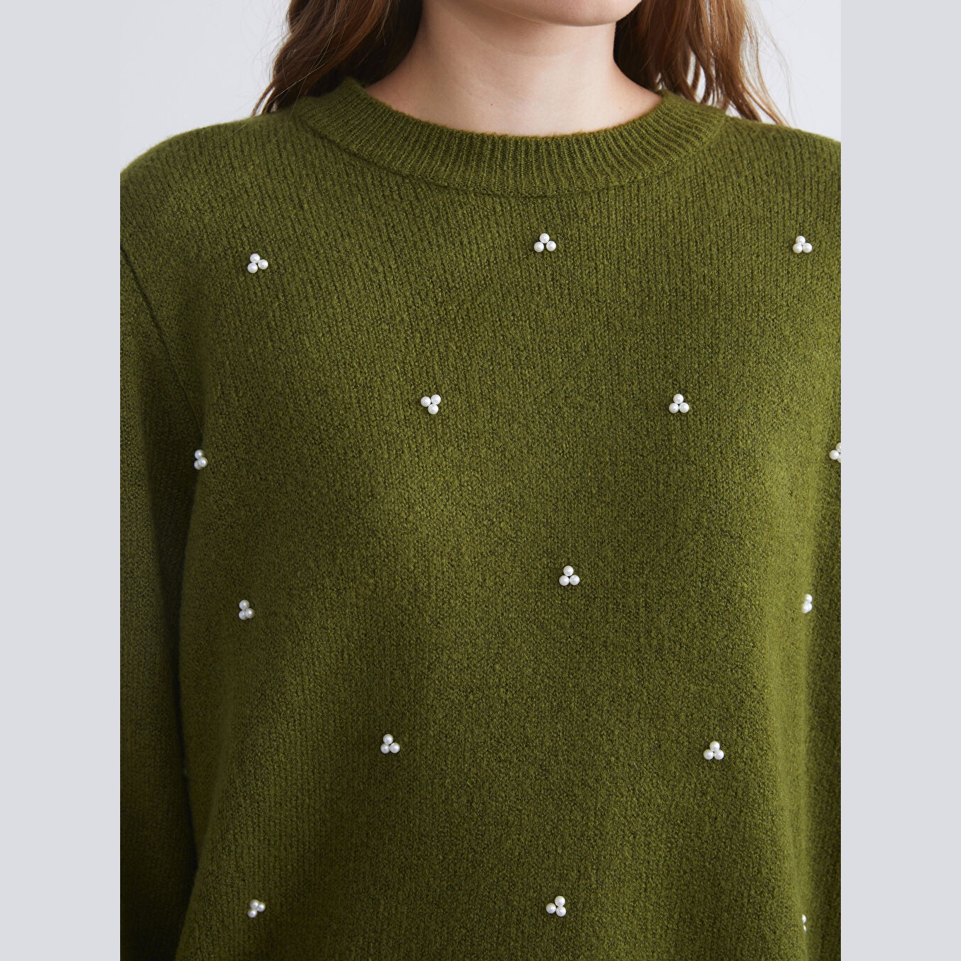 كنزة نسائية بياقة دائرية وتطريز خرز من LCW Classic – أخضر (قصة واسعة، يئة جانبية)
