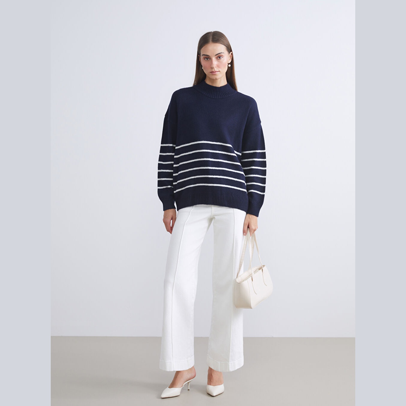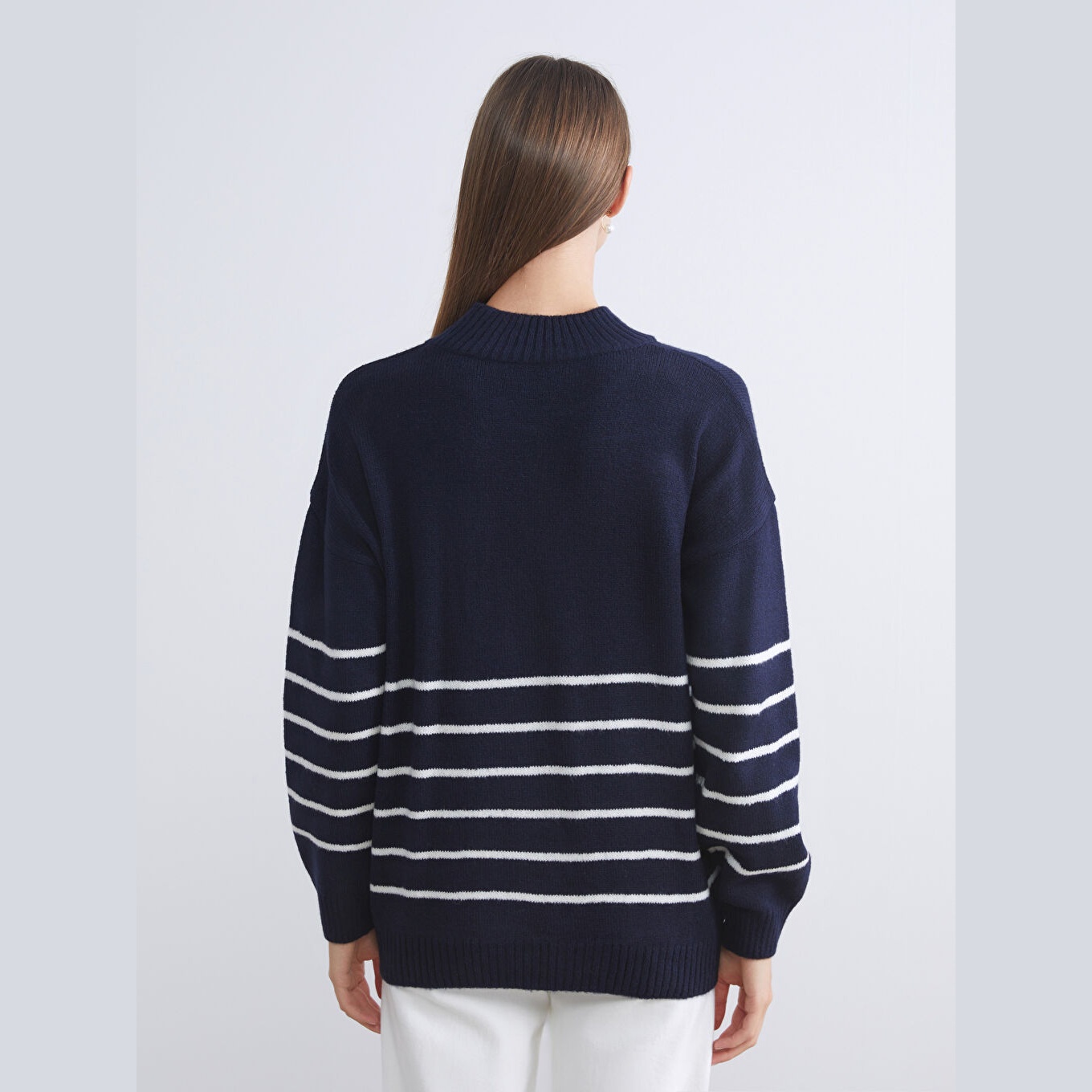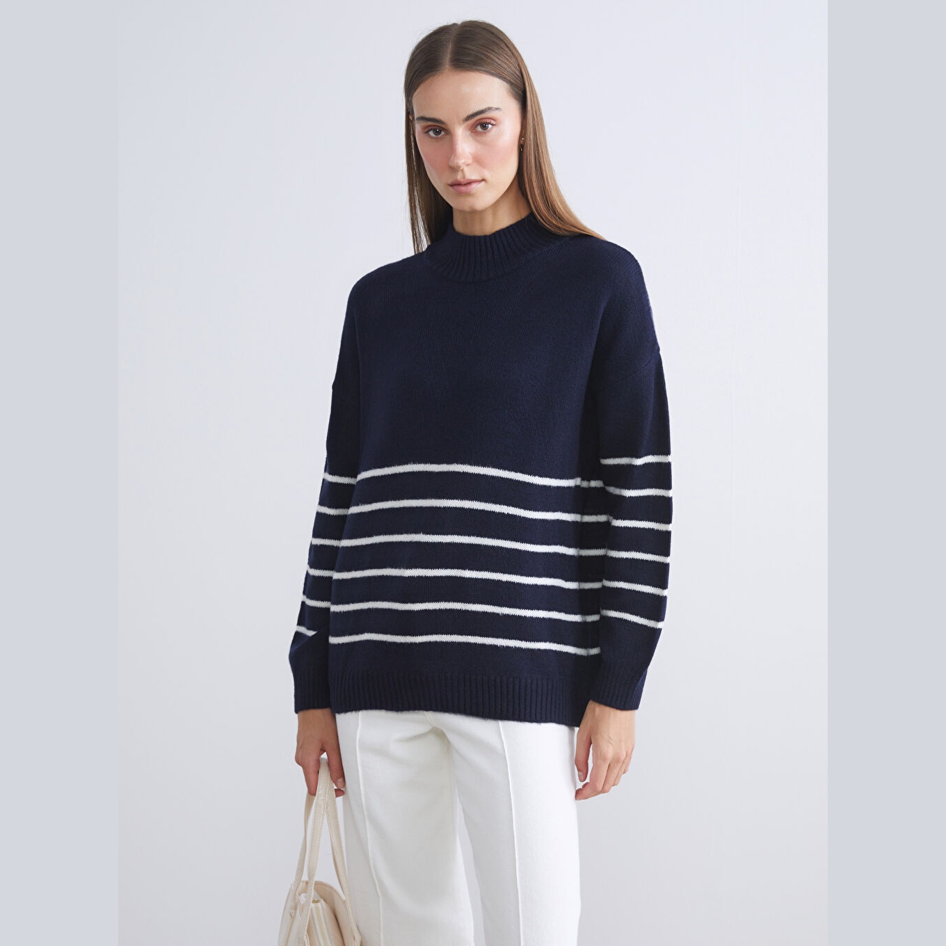 كنزة نسائية بياقة نصف عالية من LCW ECO – كحلي (قصة واسعة، مخططة)