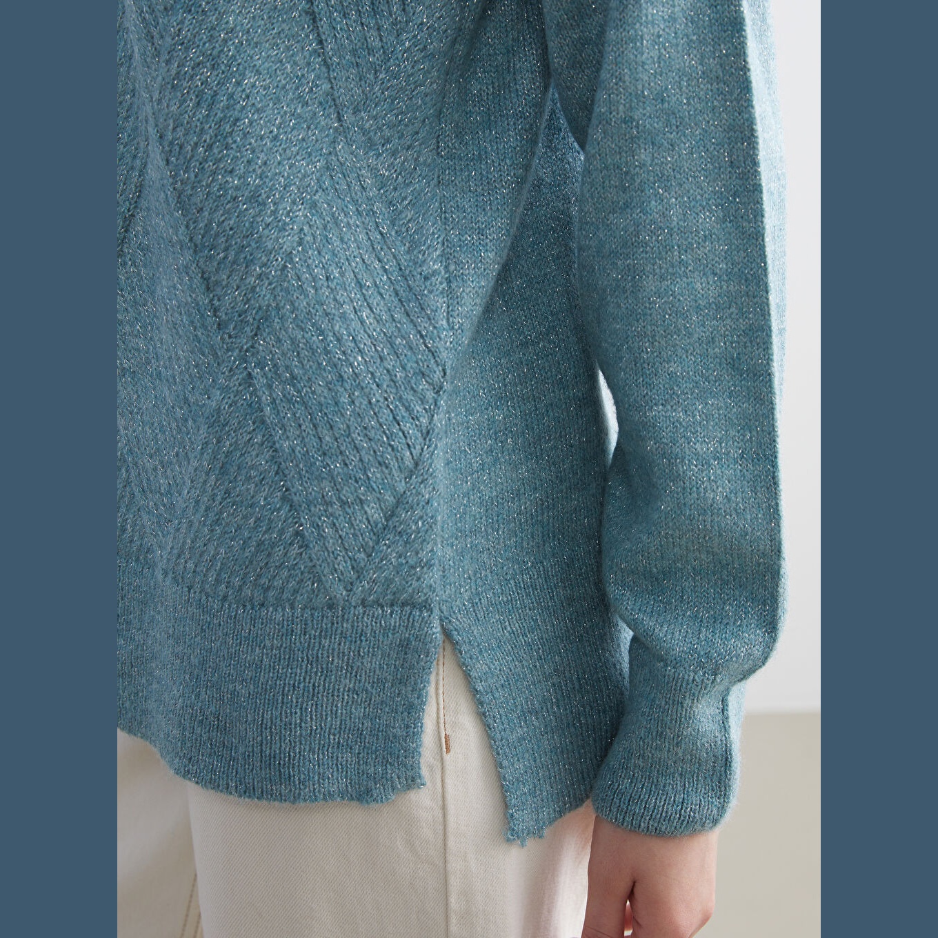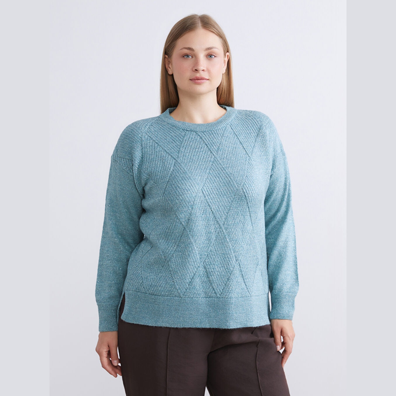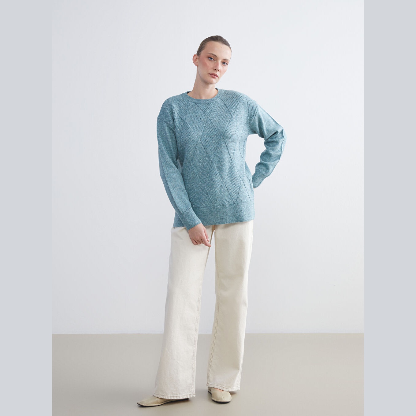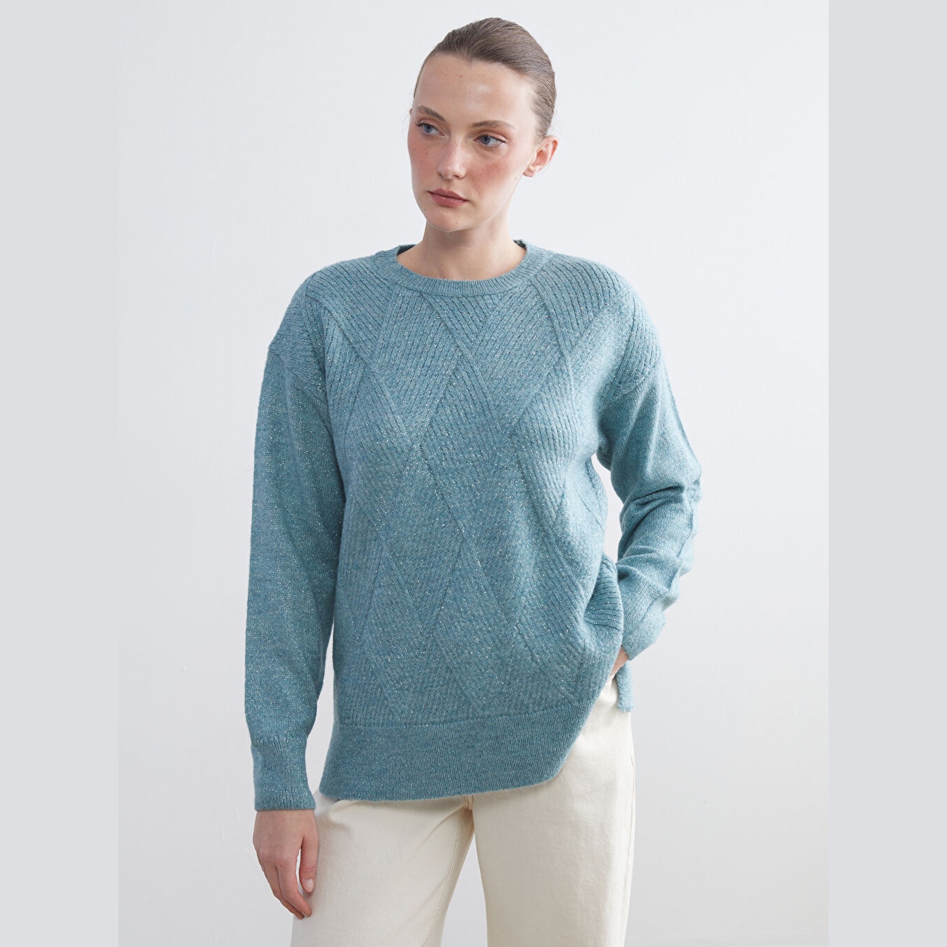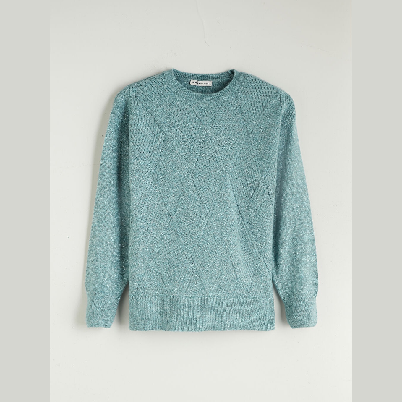 كنزة دافئة من LCW Classic بلون أزرق هادئ، مصممة بياقة دائرية (Bisiklet Yaka)، أكمام طويلة، قصة Regular Fit قياسية تمنحك مظهرًا مريحًا وانسيابيًا، مزينة بنقشة هندسية بارزة على شكل "باكلافا" تضيف لمسة فنية مميزة، خامة تريكو سميكة بملمس ناعم ومتين. مصنوعة من مزيج الأكريليك، البوليستر، والخيط المعدني بنسبة 74% – 22% – 4%، بطول يُقاس من الكتف، متوفرة ضمن مجموعة Büyük Beden لتناسب مختلف أشكال الجسم، من القياسات القياسية وحتى المقاسات الكبيرة.