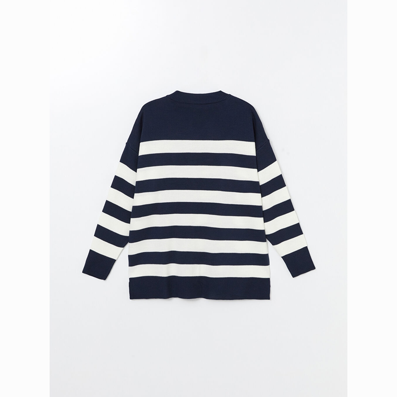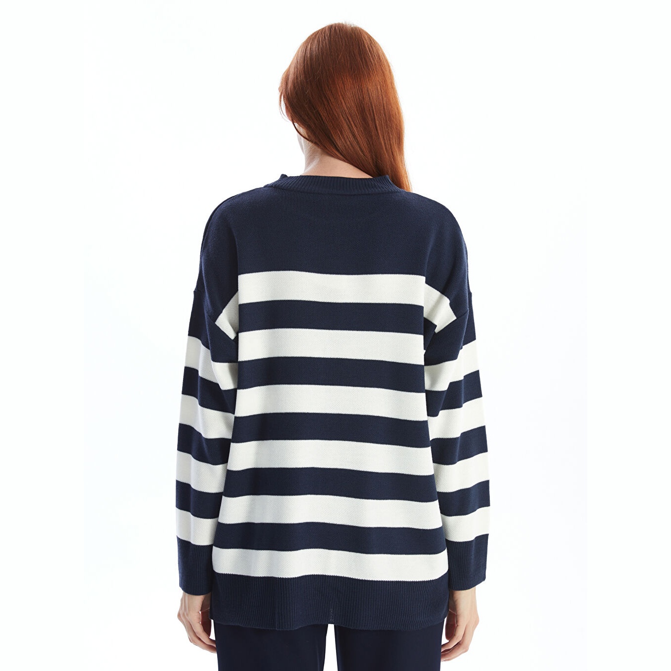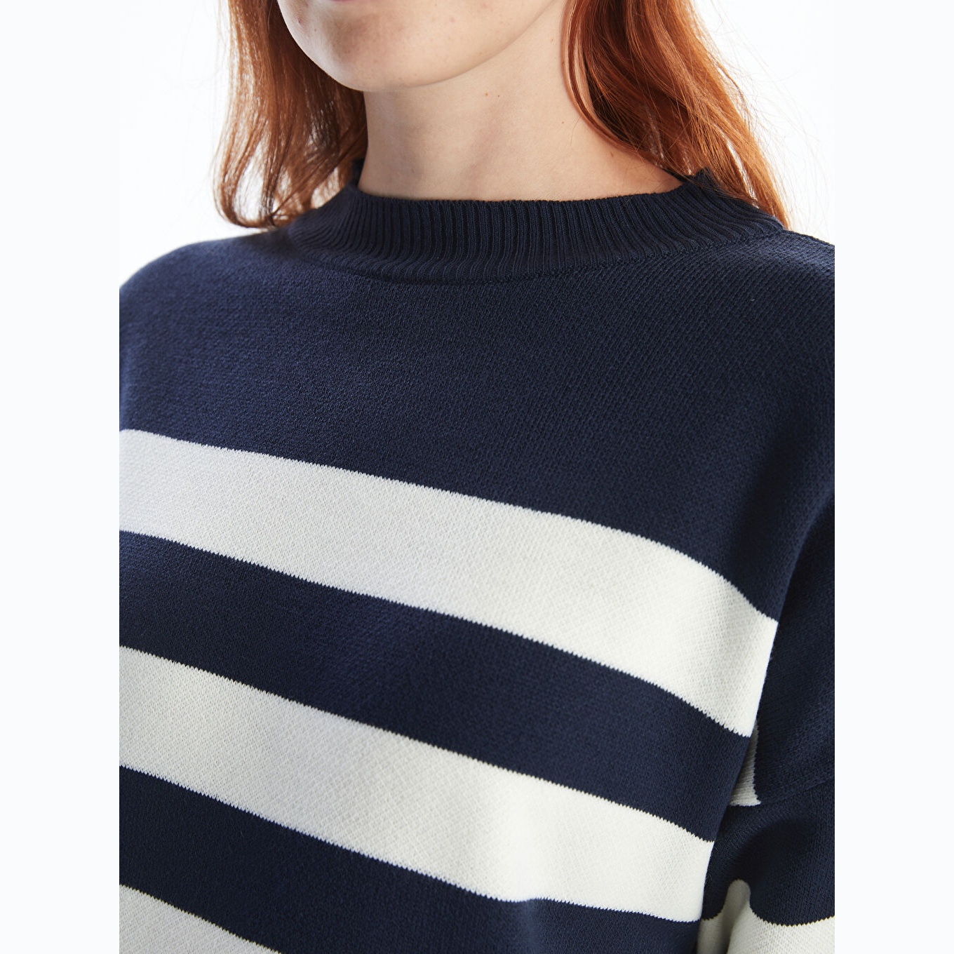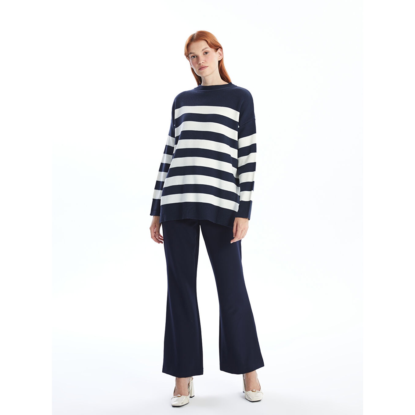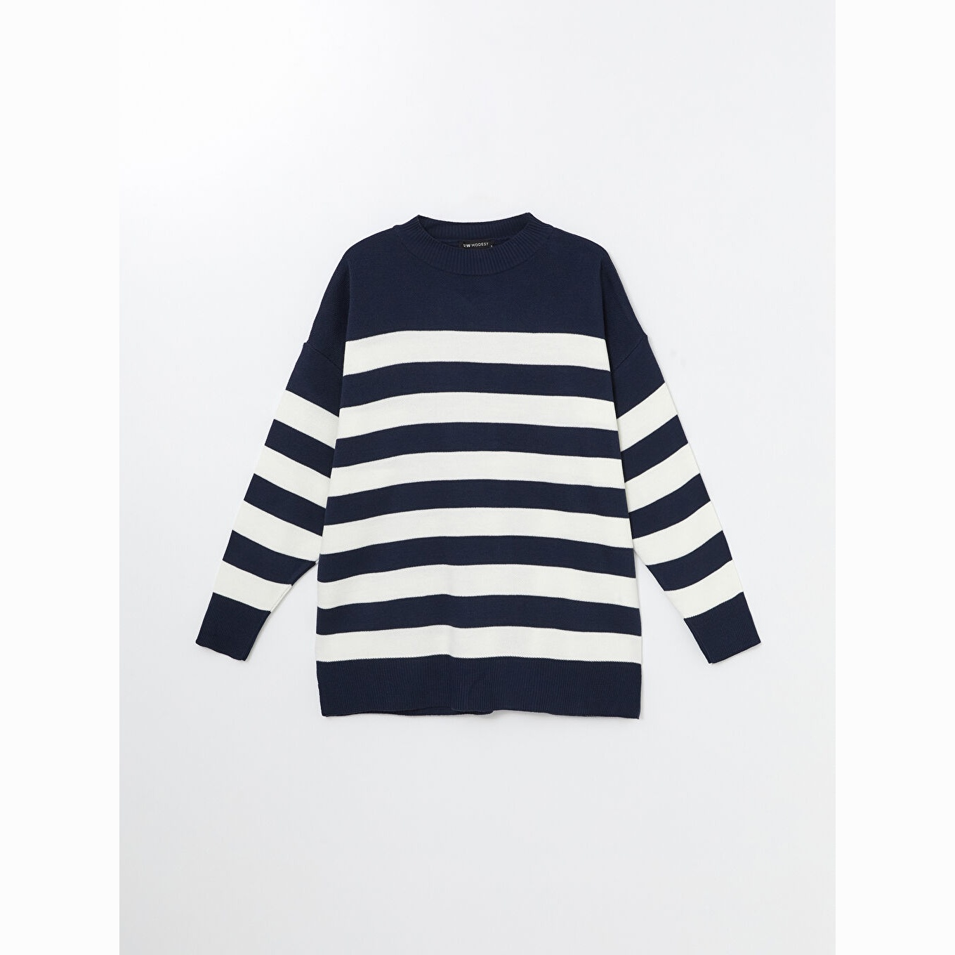 كنزة نسائية بياقة دائرية من LCW Modest – أزرق (قصة واسعة، نقشة خطوط، بطول يغطي الورك)