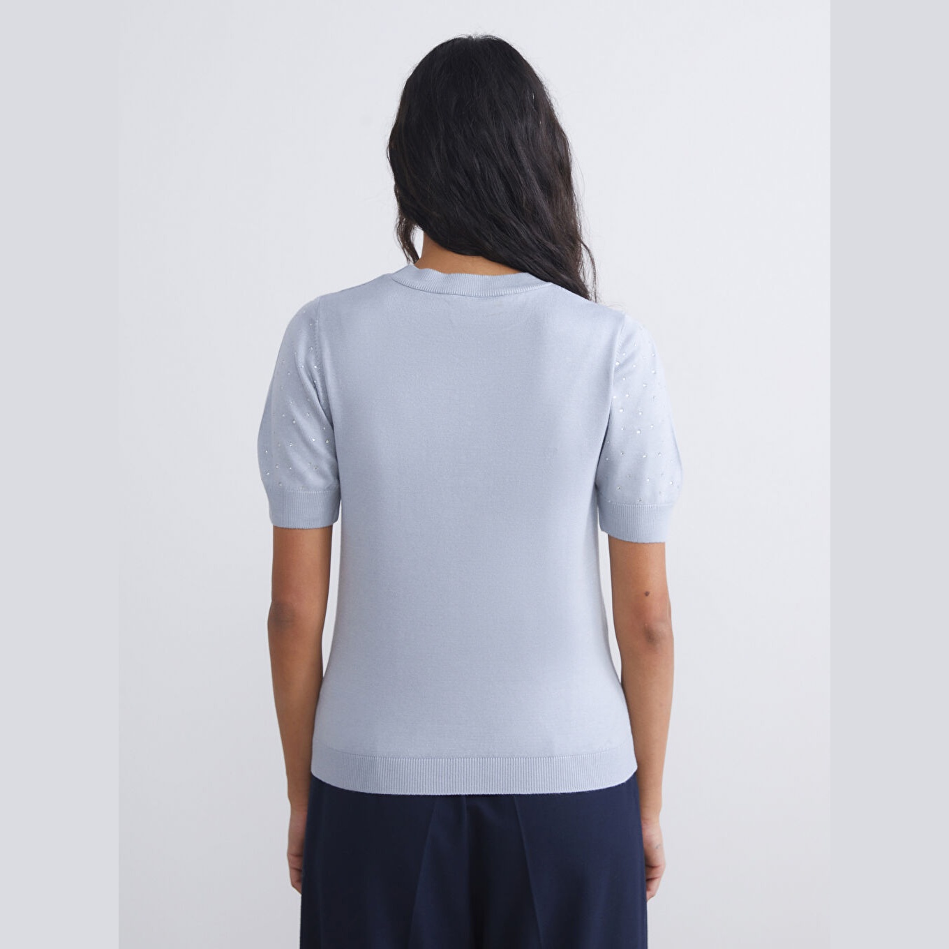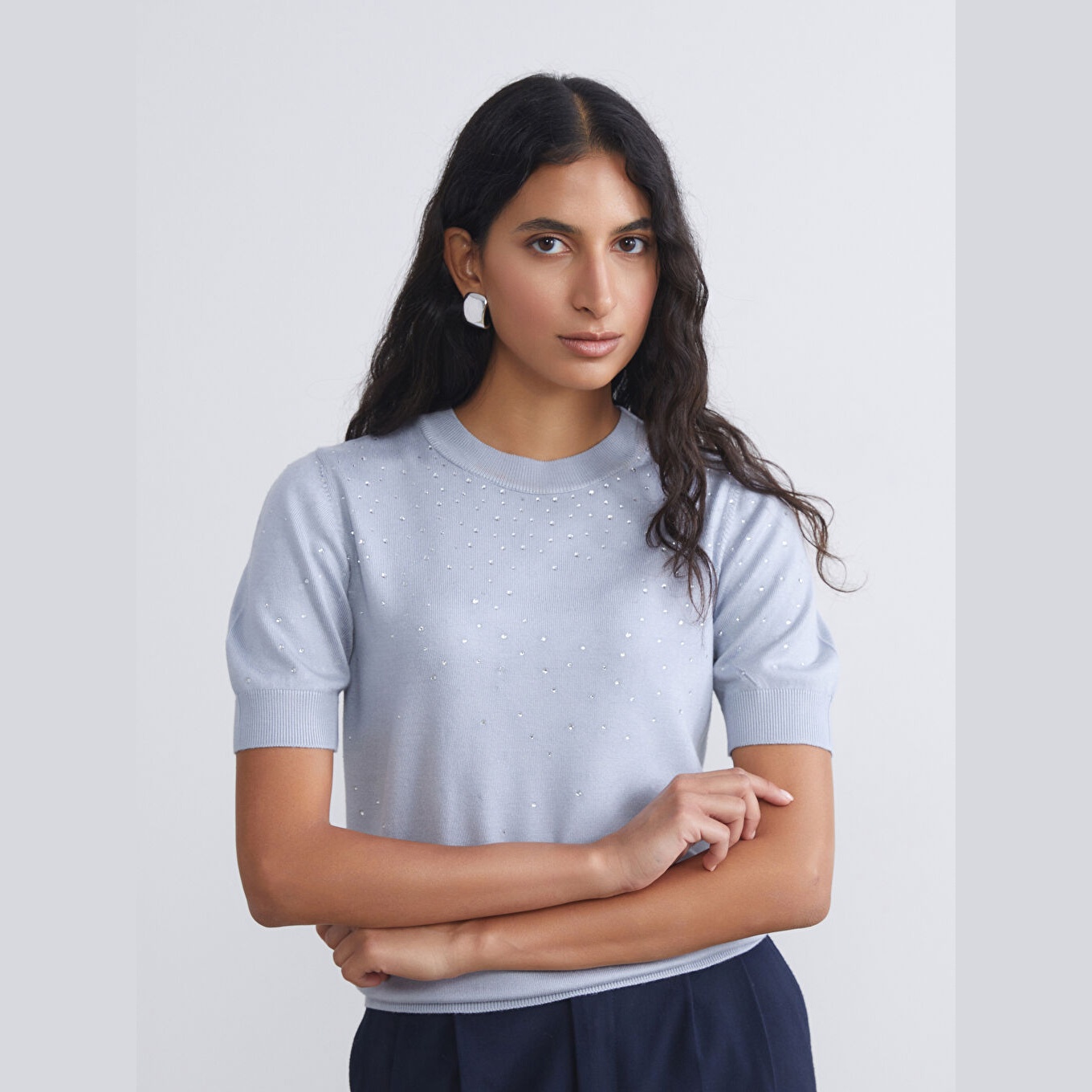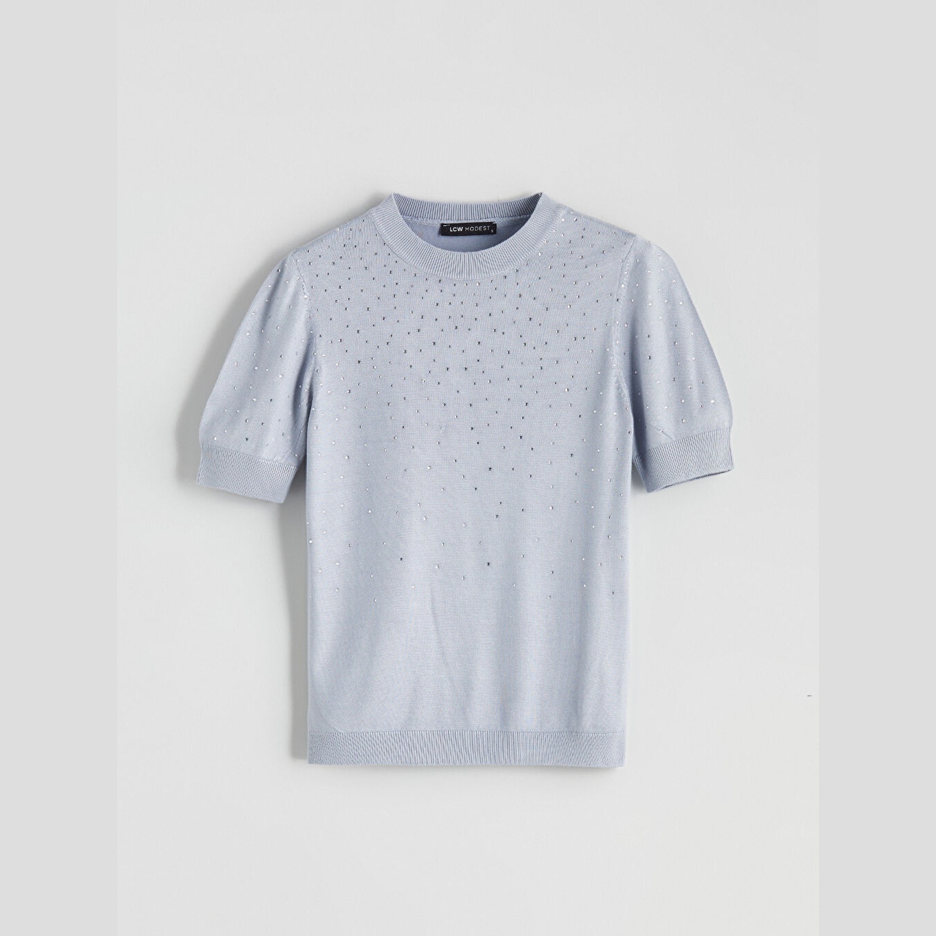 كنزة نسائية بياقة دائرية من LCW Comfort – أزرق (قصة ضيقة، مزينة بحبيبات لامعة، بأكمام قصيرة، مناسبة لفترة الحمل وما بعدها)