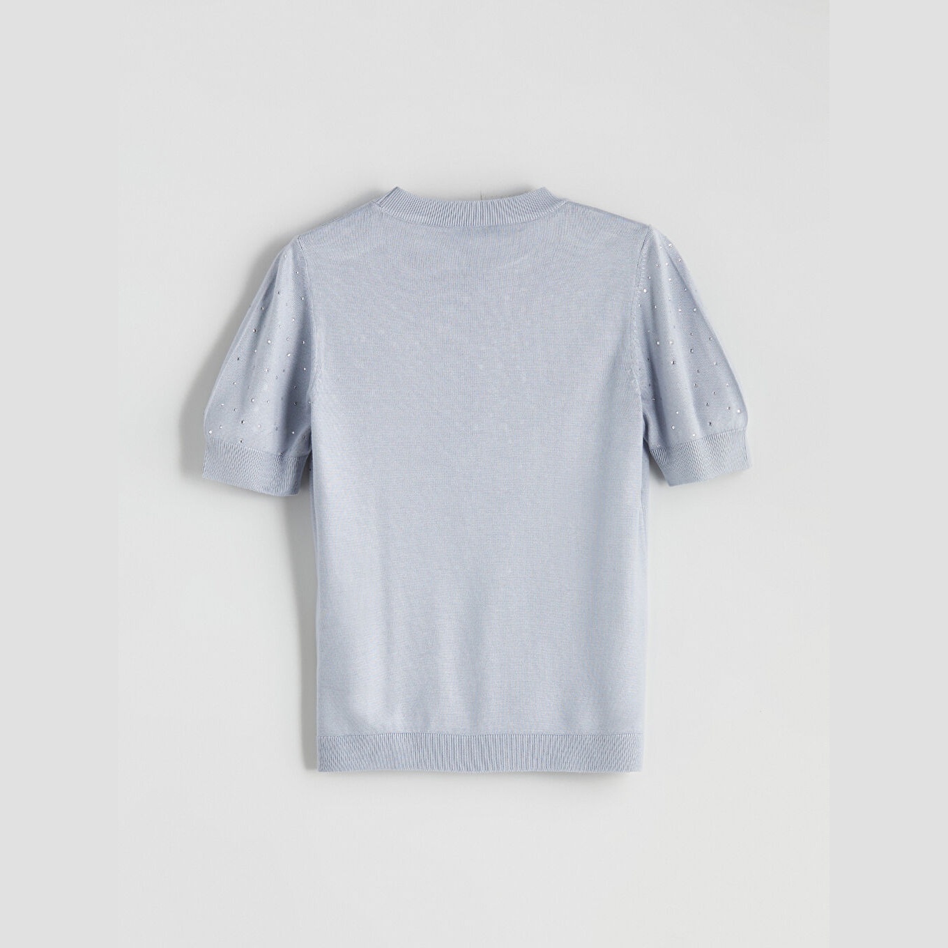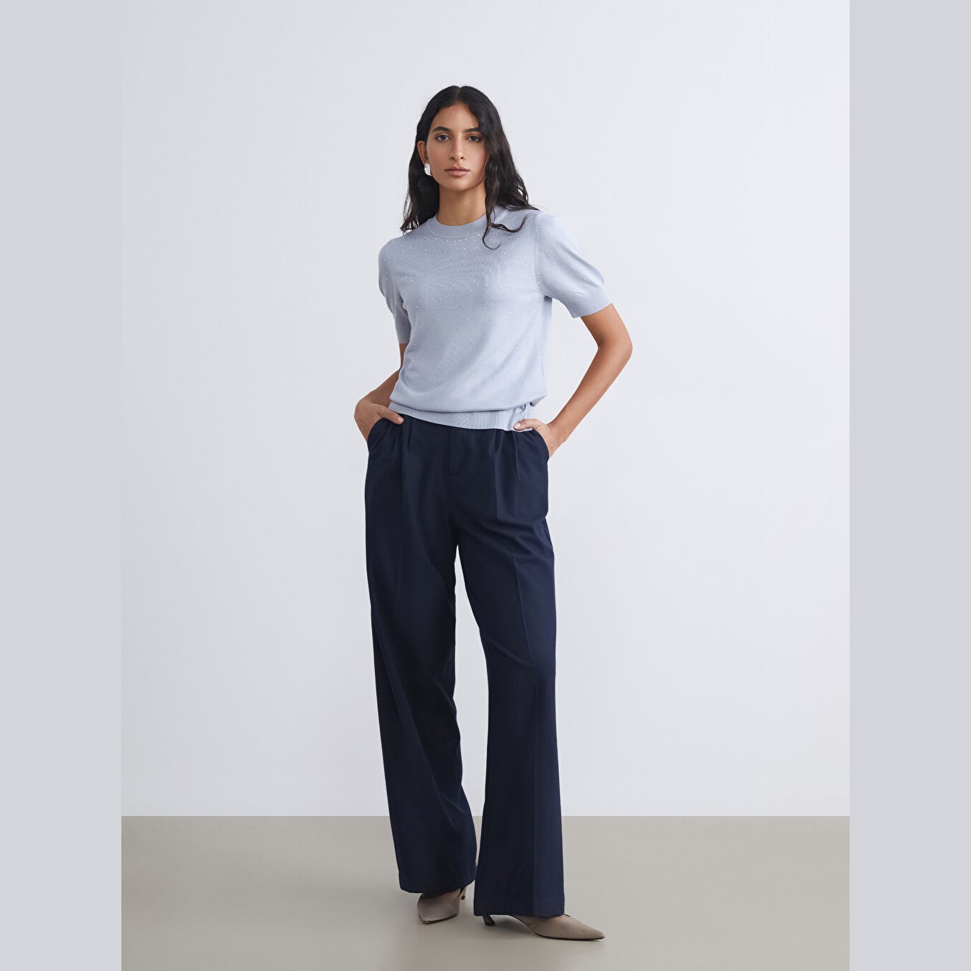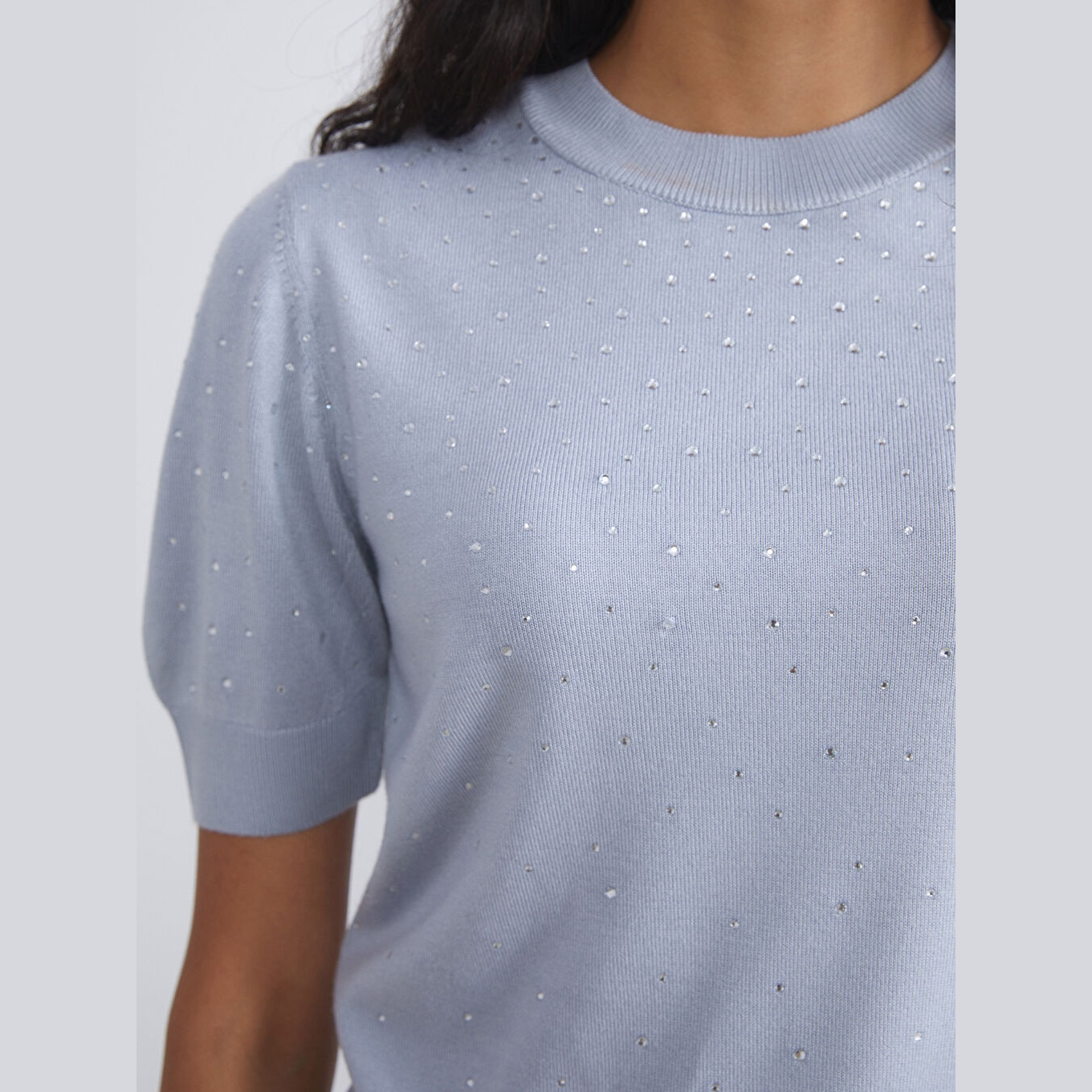 كنزة نسائية بياقة دائرية من LCW Comfort – أزرق (قصة ضيقة، مزينة بحبيبات لامعة، بأكمام قصيرة، مناسبة لفترة الحمل وما بعدها)