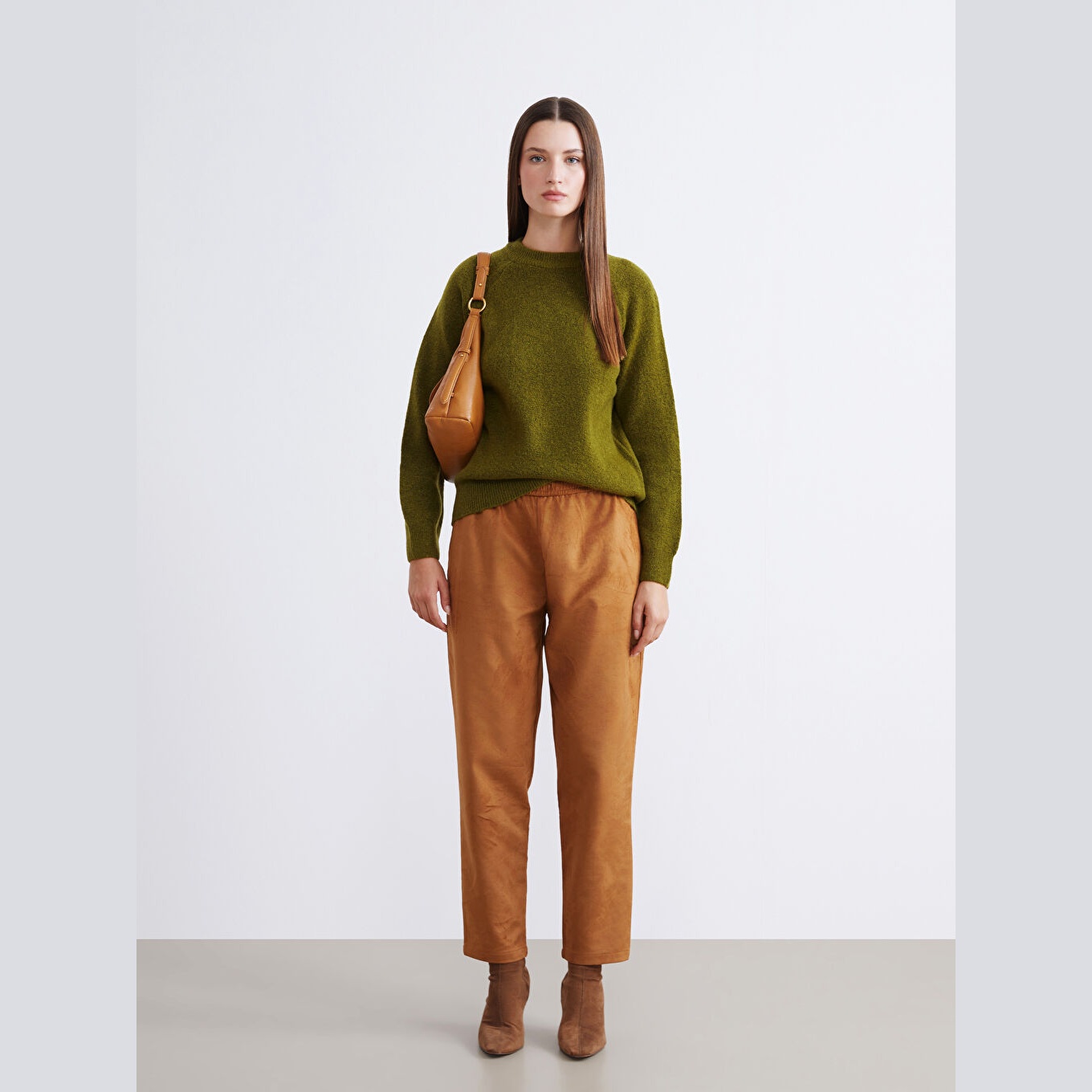 كنزة عملية من LCW Vision بلون زيتي داكن، مصممة بياقة دائرية (Bisiklet Yaka)، أكمام طويلة، قصة Loose Fit واسعة تمنحك راحة وانسيابية مثالية، تصميم سادة بدون نقشة يتيح تنسيقًا مرنًا مع مختلف الإطلالات، خامة تريكو بسمك متوسط وملمس ناعم، مصنوعة من مزيج الأكريليك، البوليستر، والإيلاستان بنسبة 70% – 29% – 1%، بطول يُقاس من الكتف، مثالية للتنسيق مع بنطال قماشي أو تنورة مستقيمة لإطلالة يومية أنيقة وعملية.