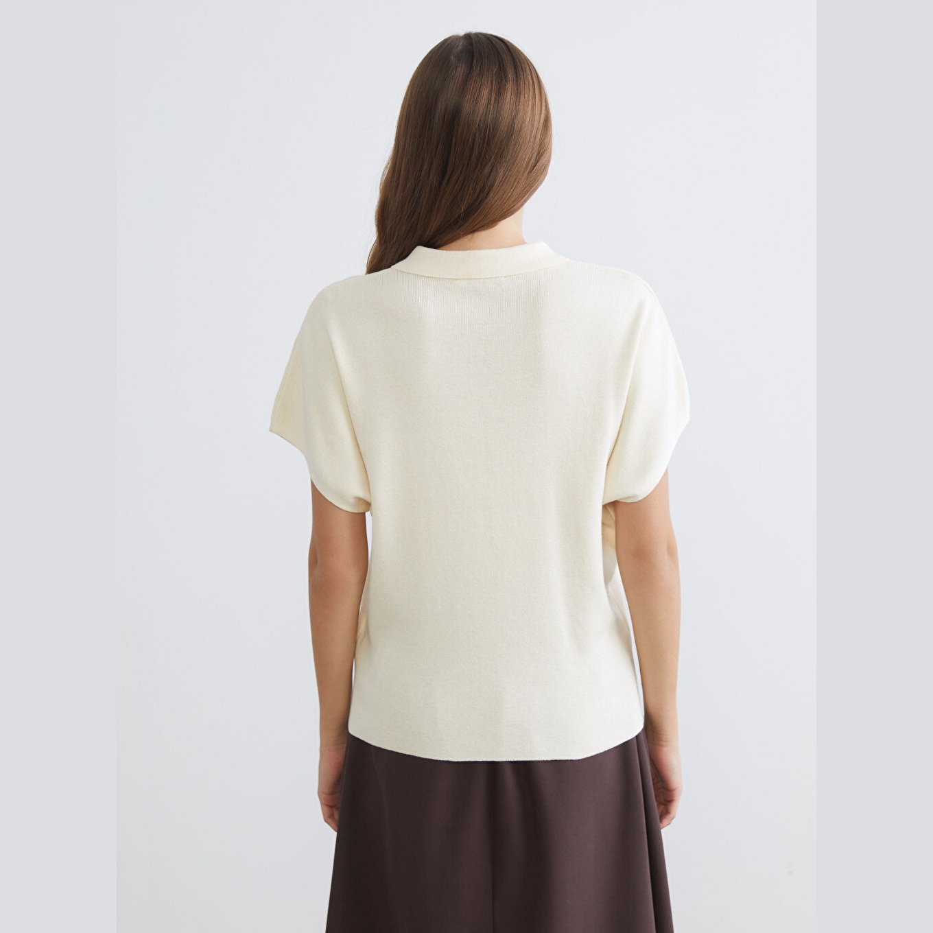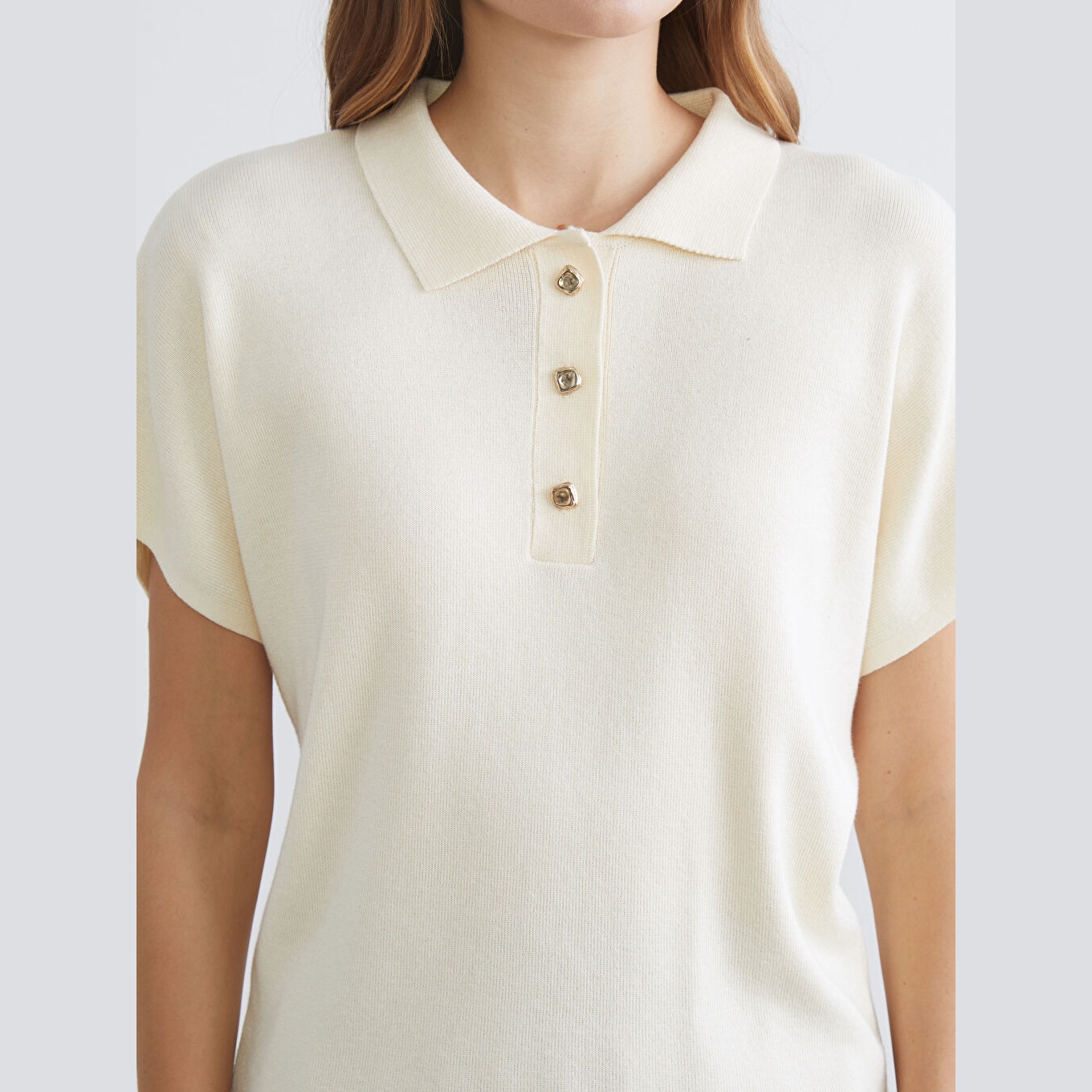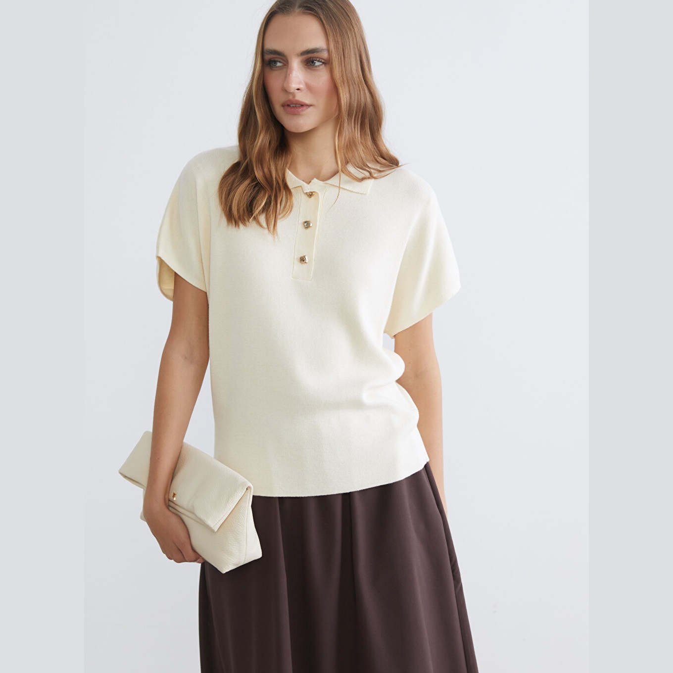 كنزة نسائية بياقة بولو من LCW Classic – إكرو (قصة قياسية، تصميم سادة، أزرار أمامية، بأكمام قصيرة)