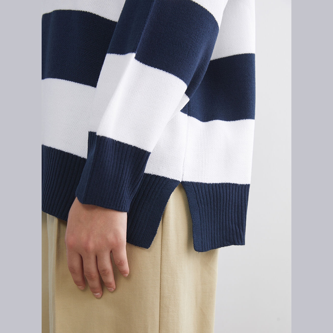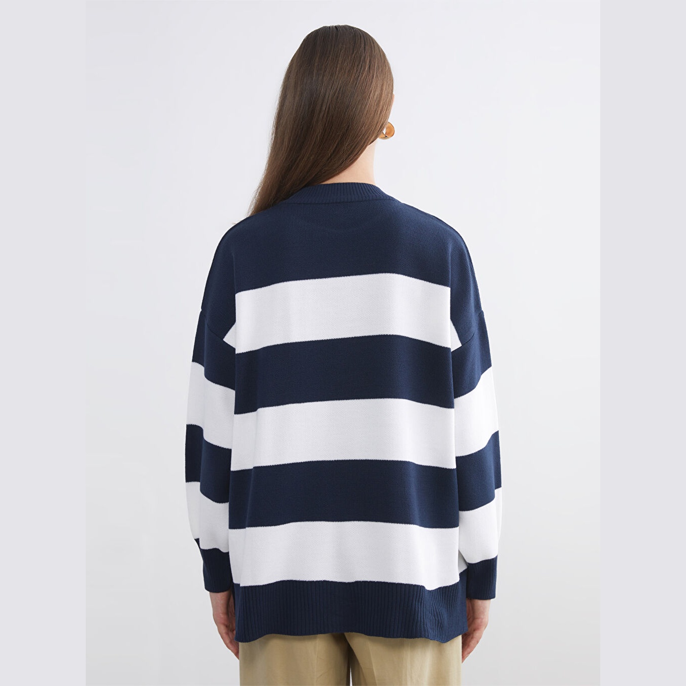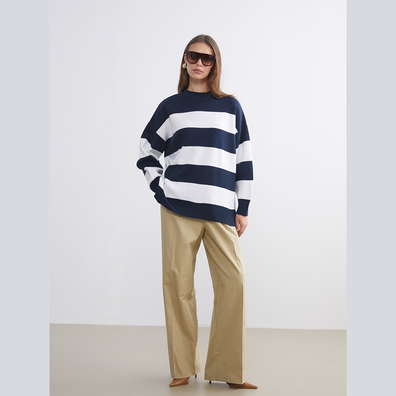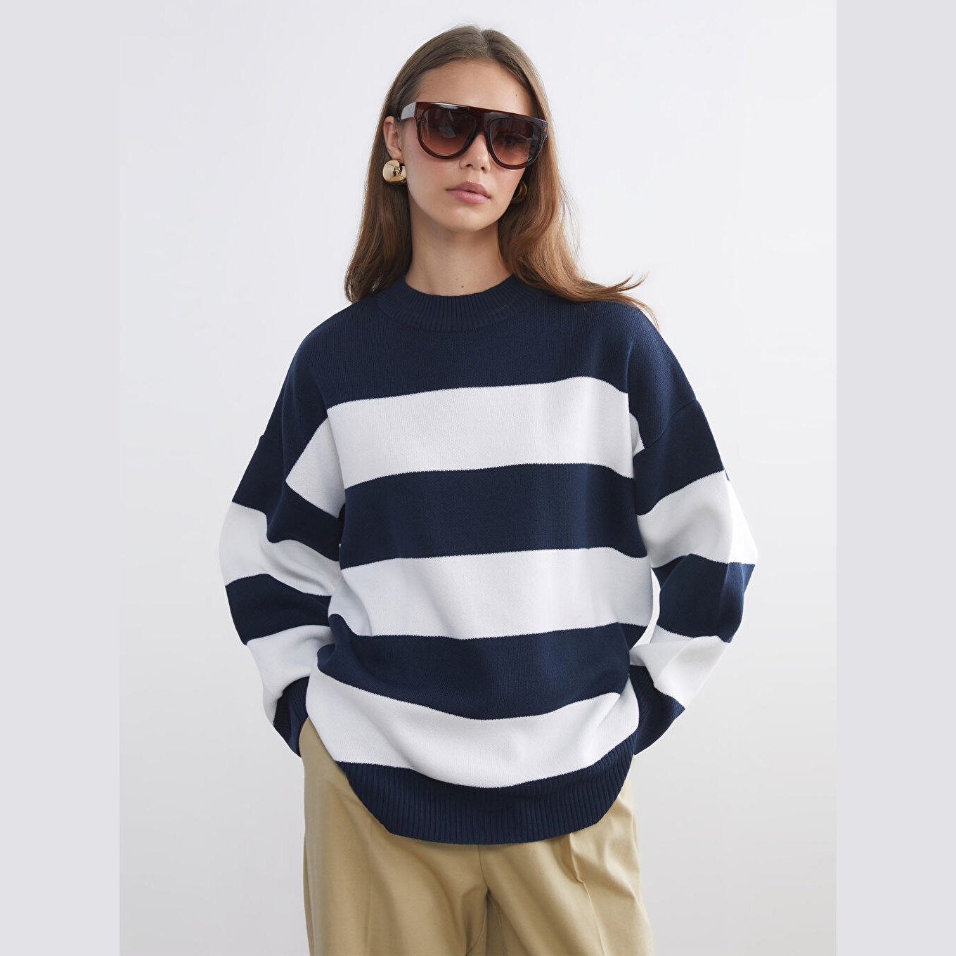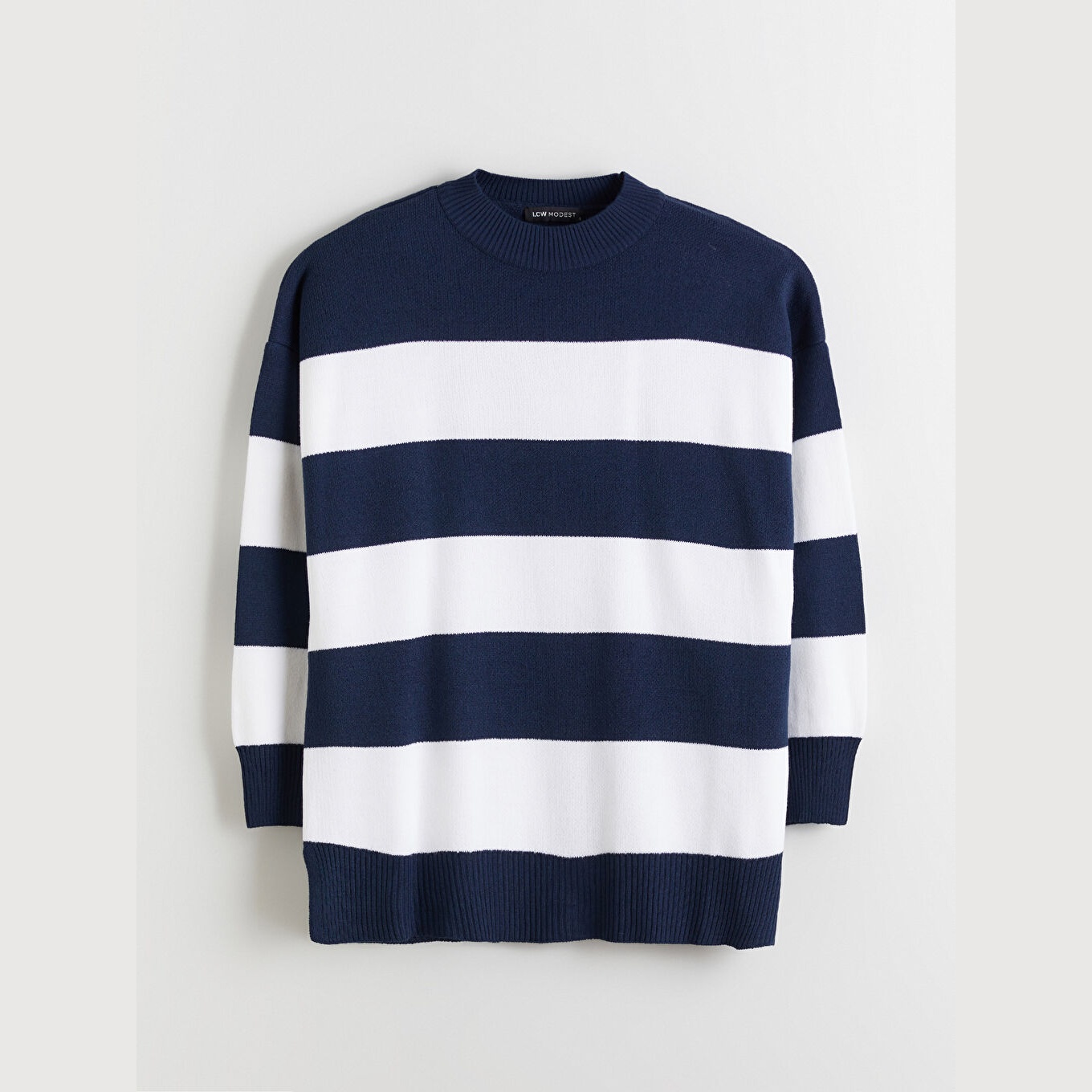 كنزة نسائية بياقة دائرية من LCW Modest – أزرق مخطط (قصة واسعة، خطوط أفقية، خامة متوسطة السماكة)