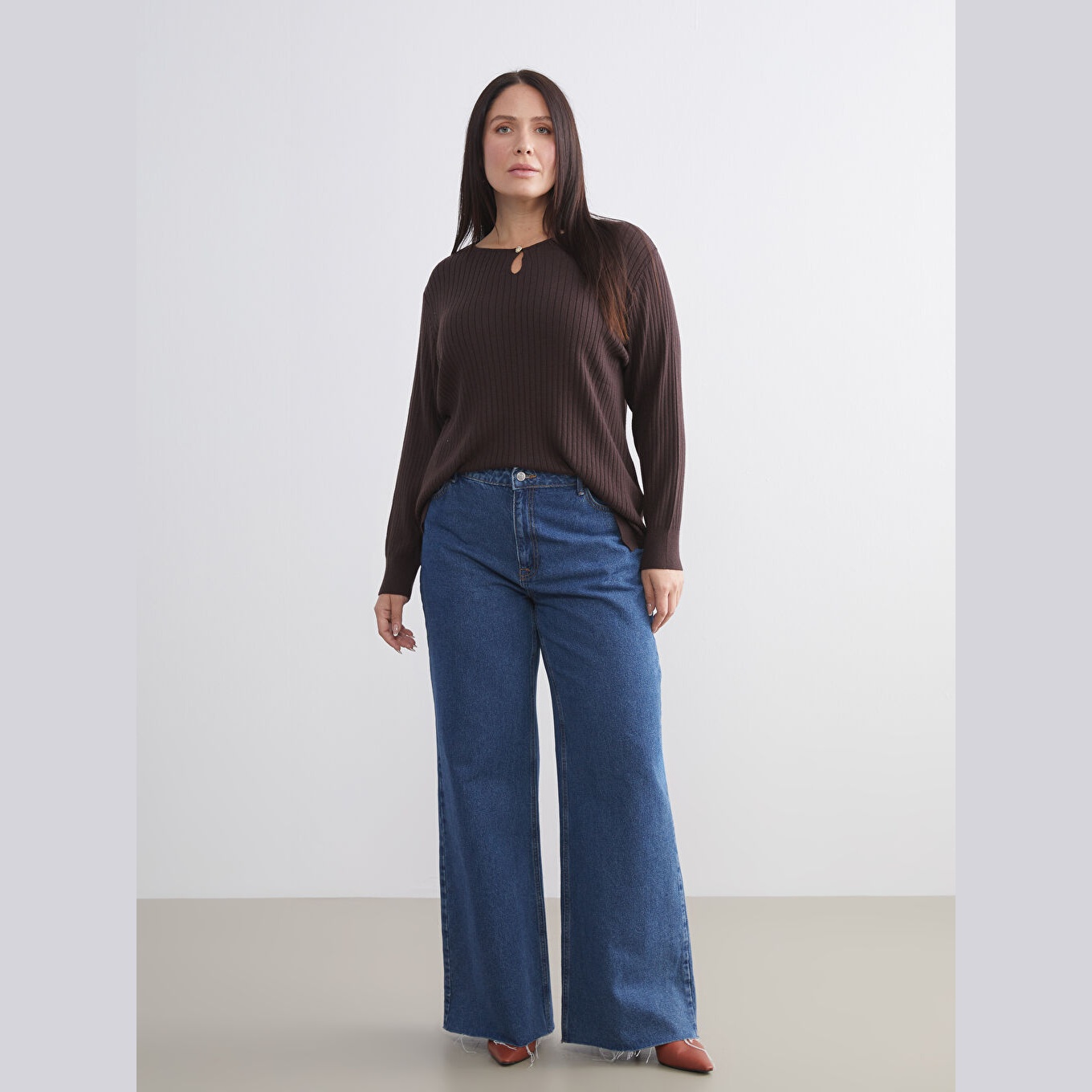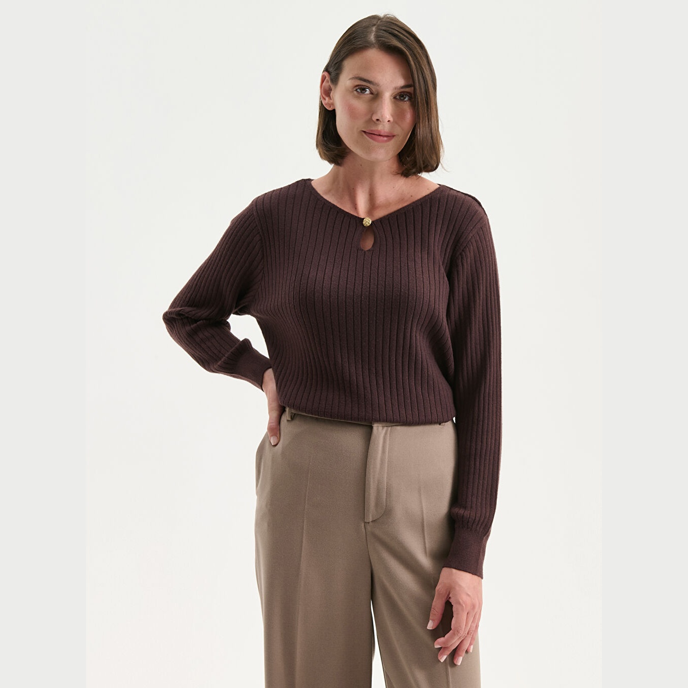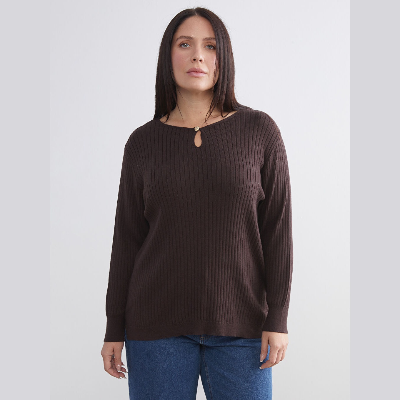 كنزة نسائية بياقة دائرية من LCW Grace – بني (قصة قياسية، تصميم سادة، خامة متوسطة السماكة، ضمن مجموعة المقاسات الكبيرة)