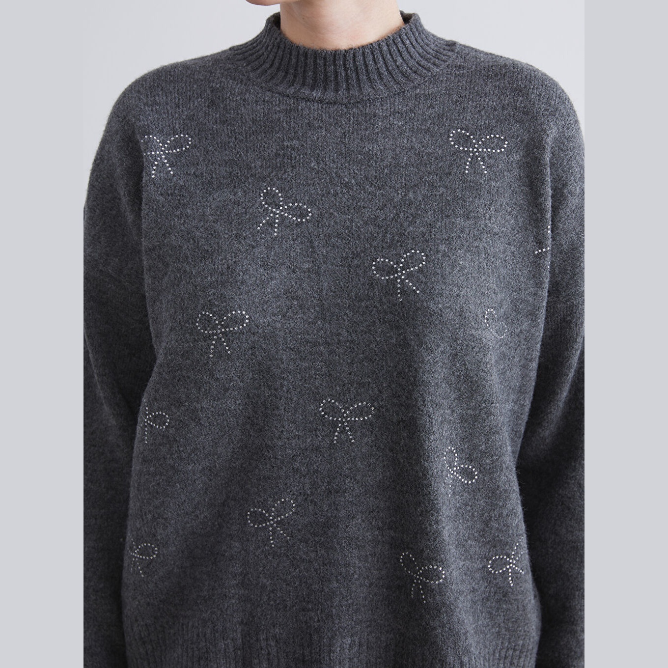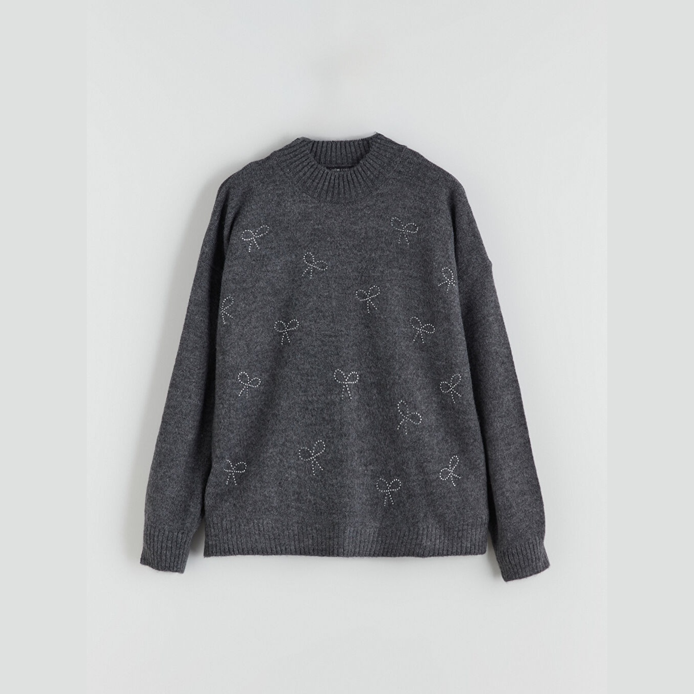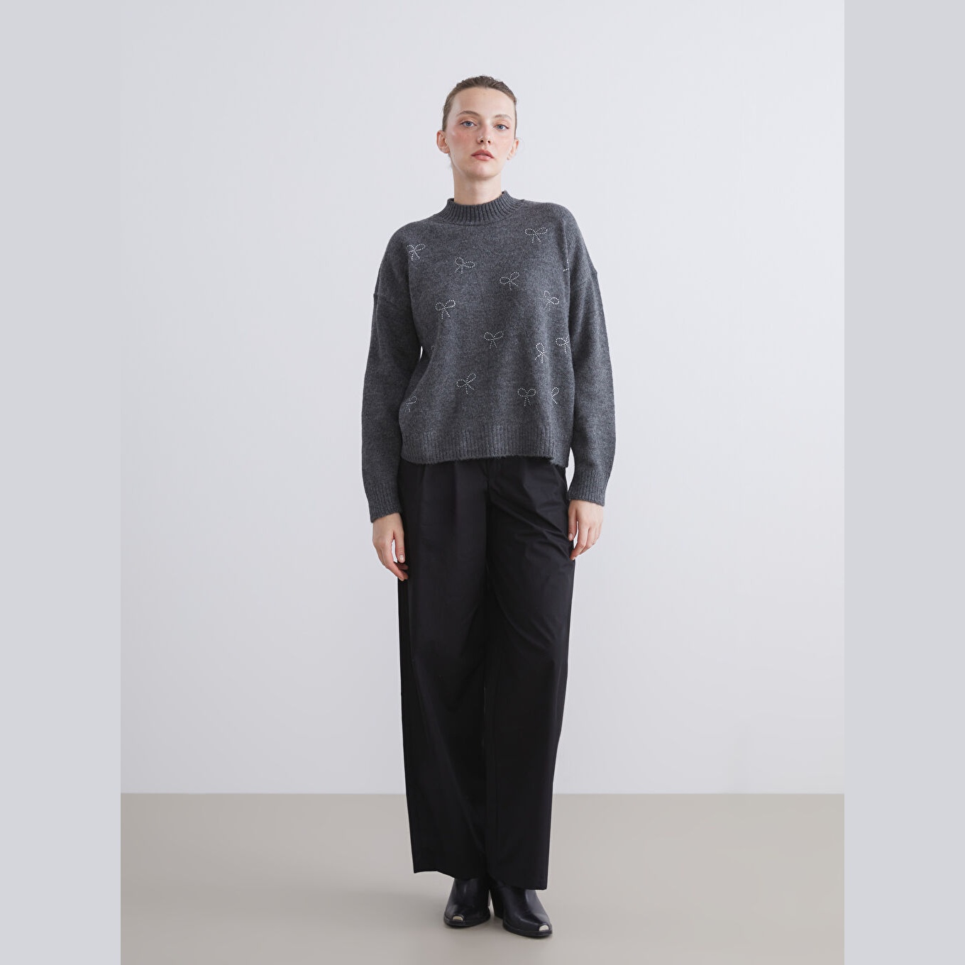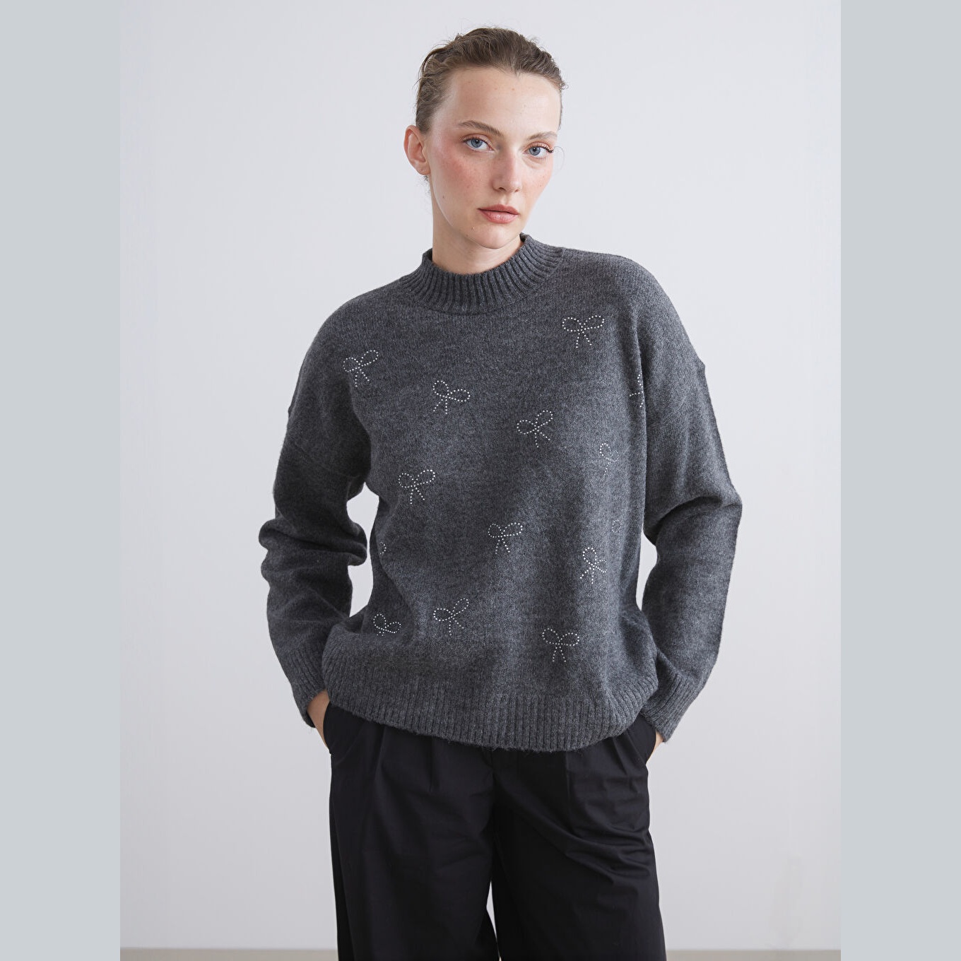 كنزة نسائية بياقة دائرية من LCW Comfort – أنثراسيت مزينة بالأحجار (قصة واسعة، تصميم مخصص لفترة الحمل، خامة متوسطة السماكة)