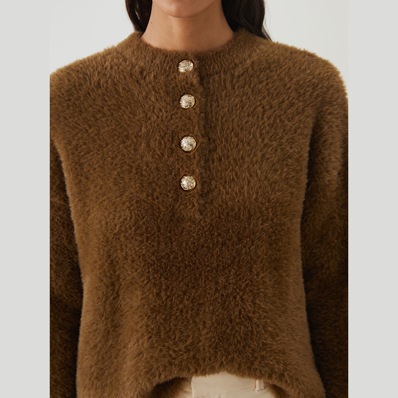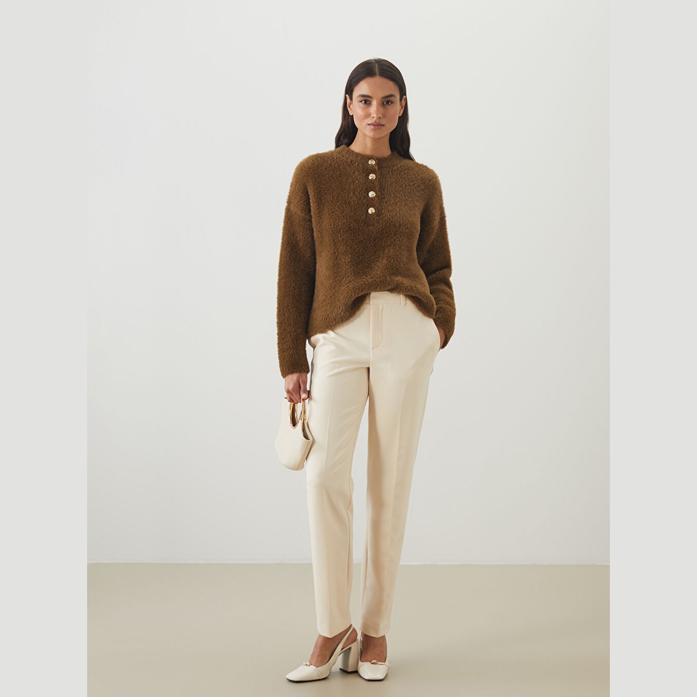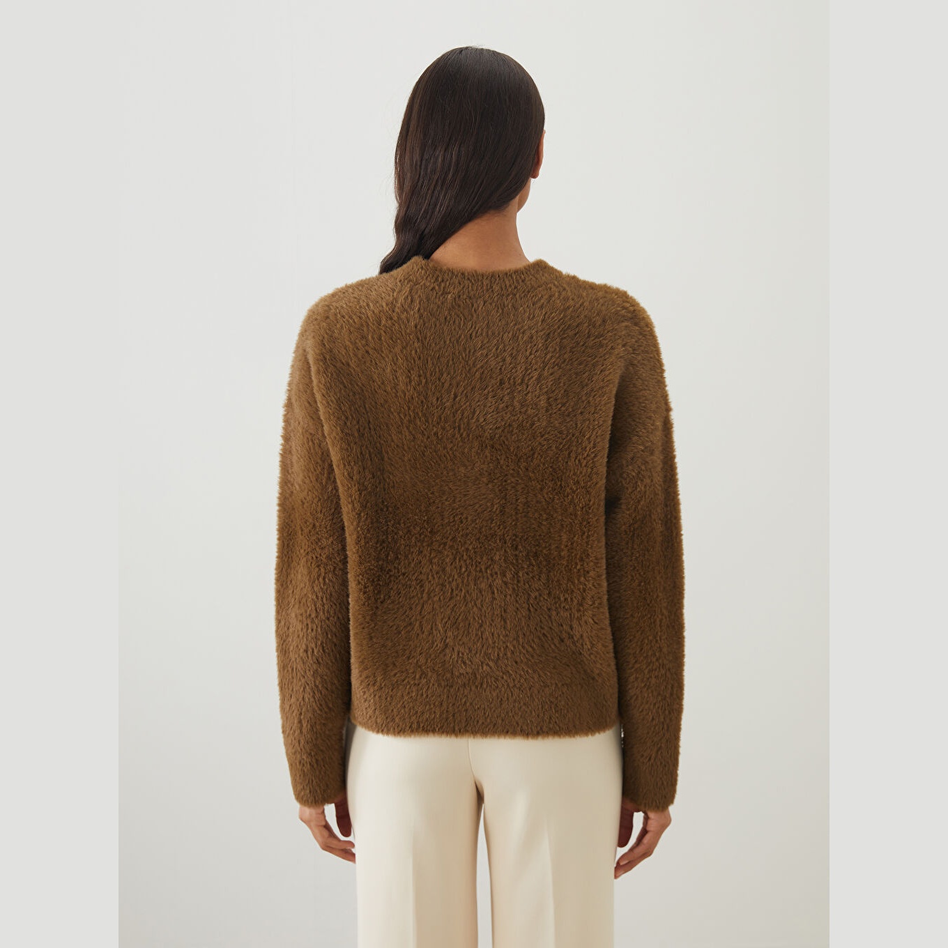 كنزة نسائية بياقة دائرية من LCW Modest – زيتي (قصة واسعة، تصميم سادة، خامة سميكة 100% بوليستر)