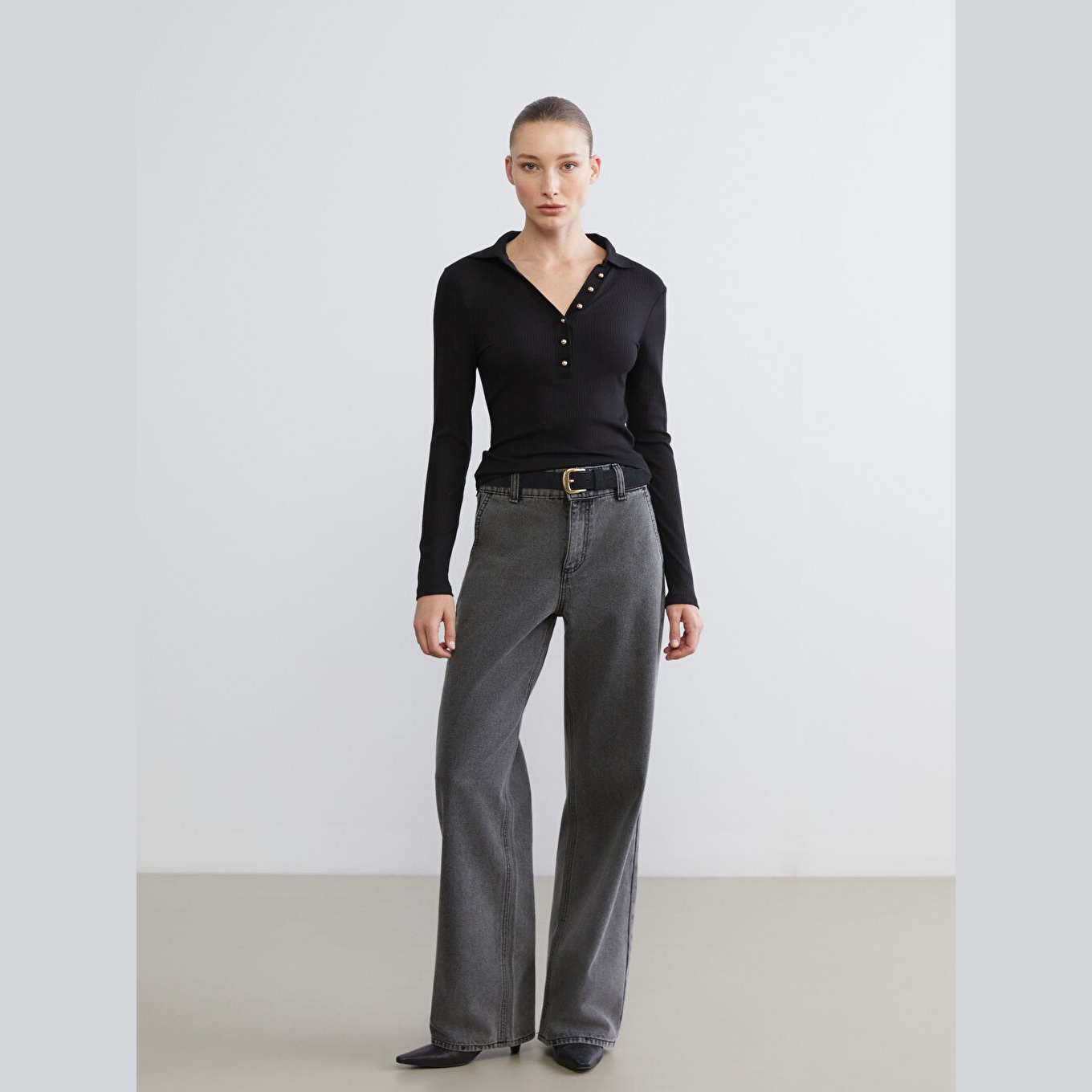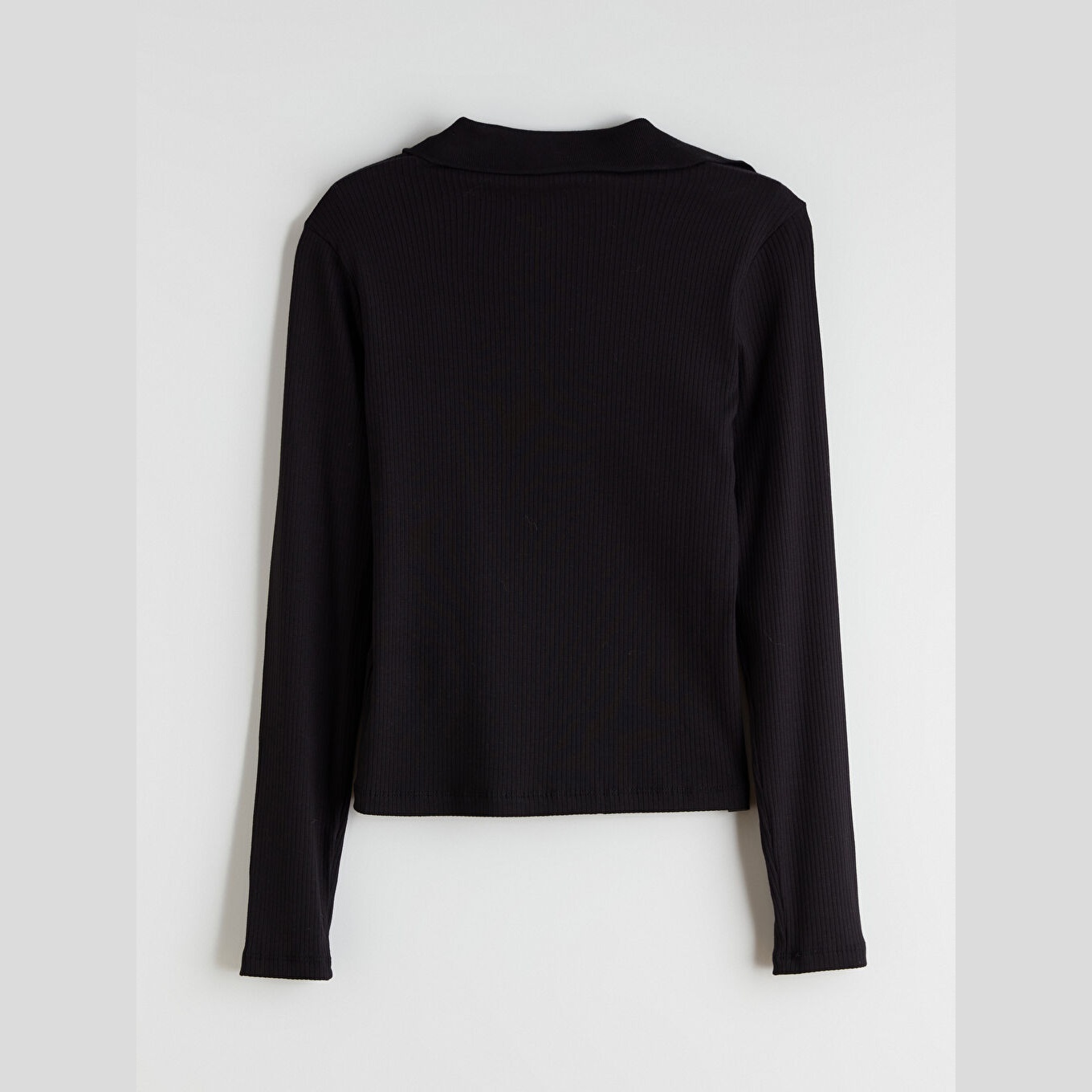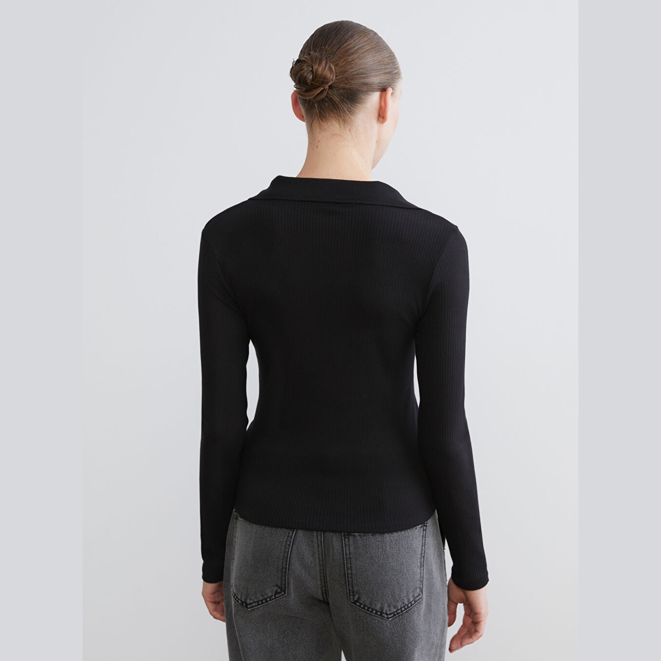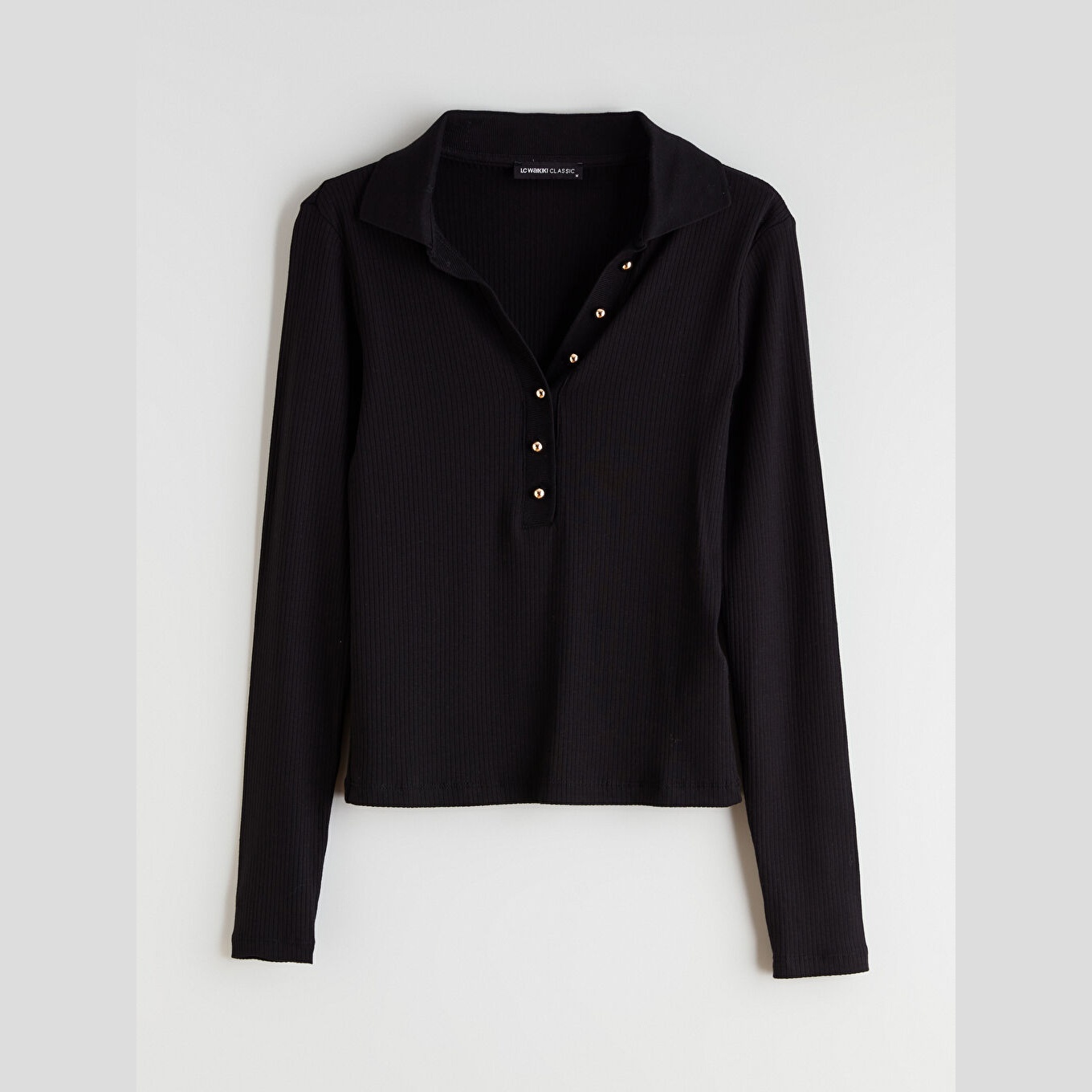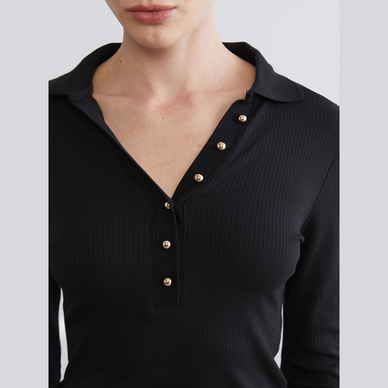 تيشيرت نسائي بياقة بولو من LCW Basic – أسود (قصة ضيقة جدًا، خامة كاشكورسي بتركيبة مودال، تصميم سادة، أكمام طويلة)