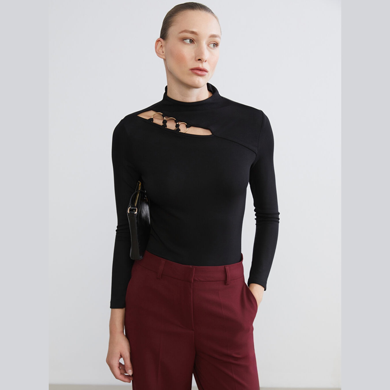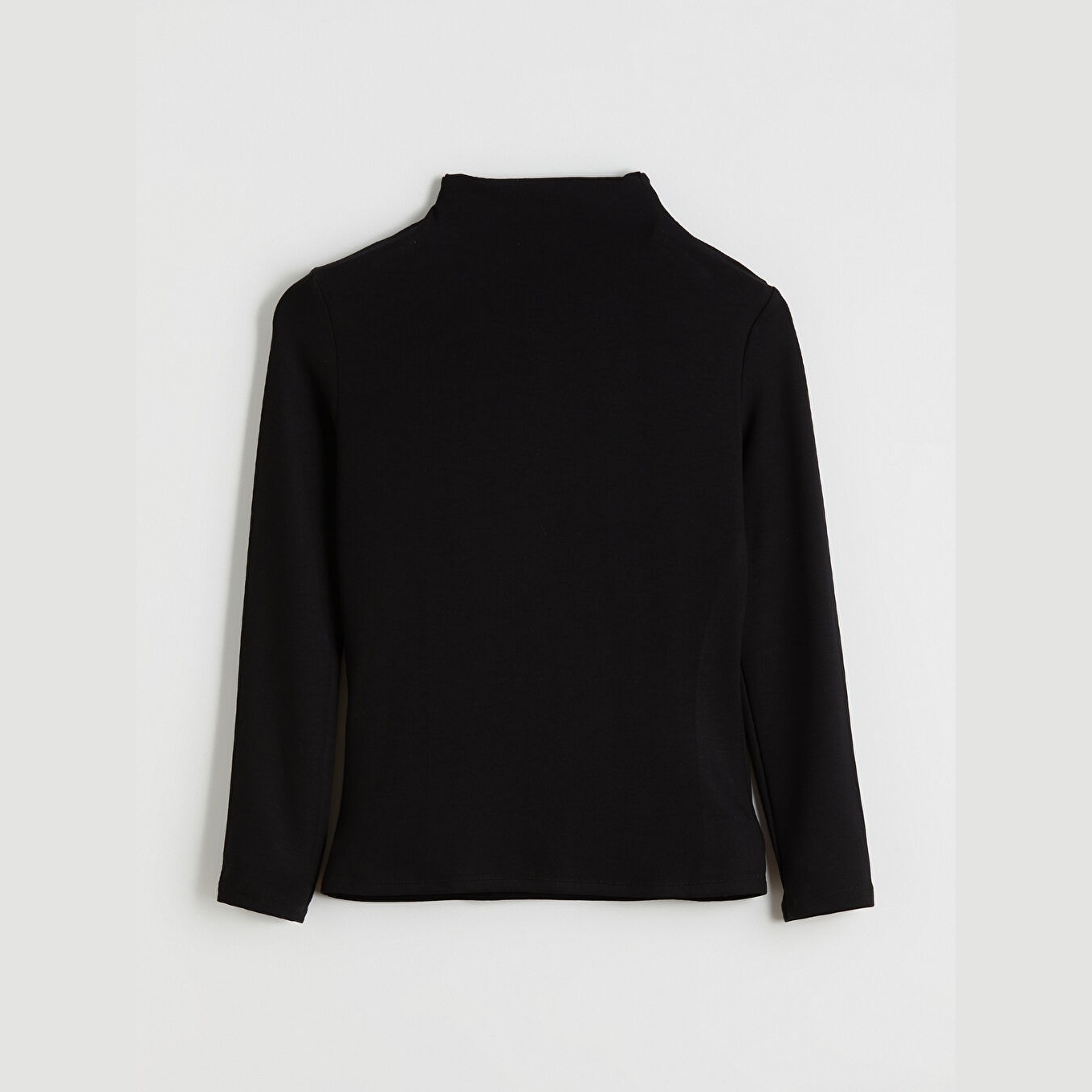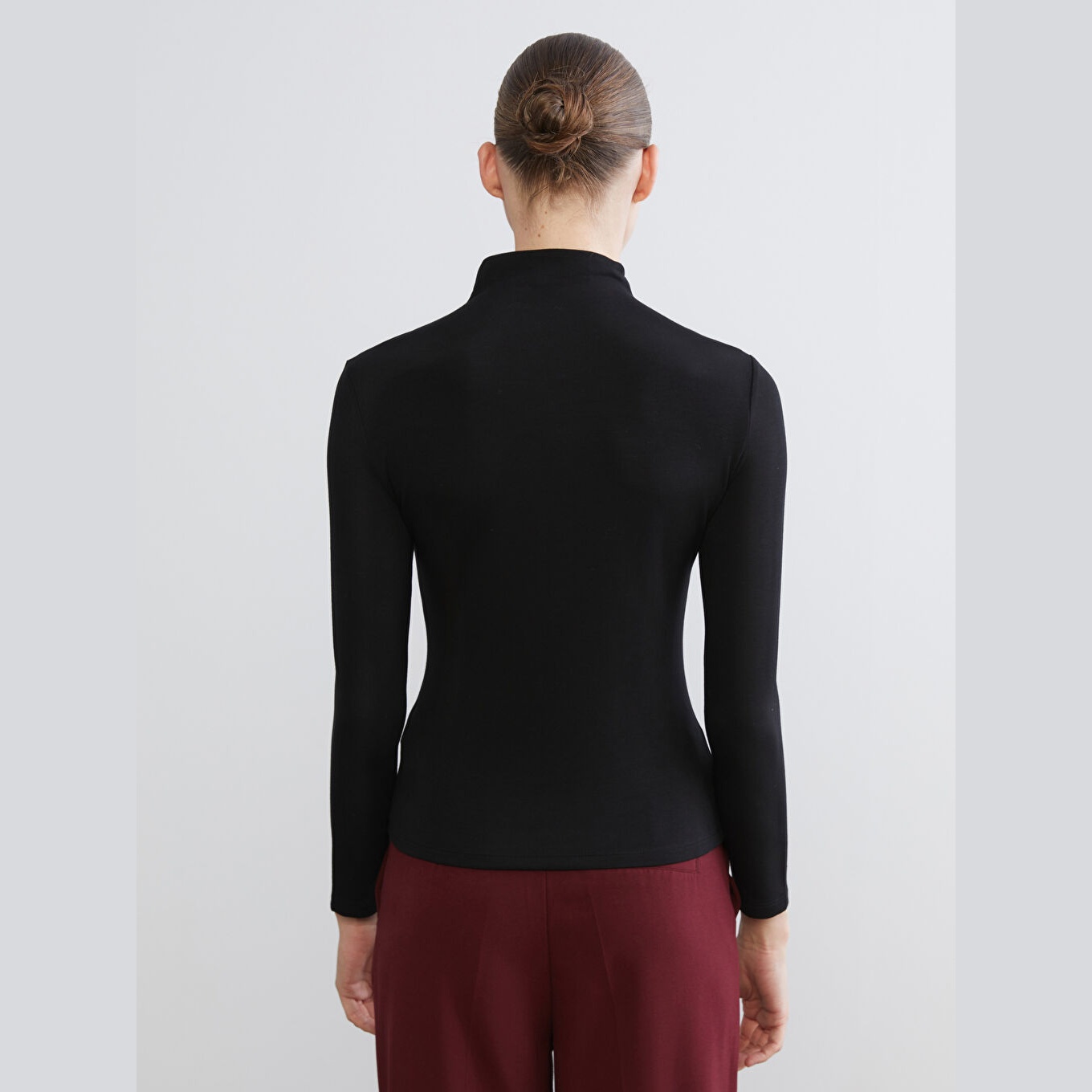 تيشيرت نسائي بياقة عالية مع فتحة أمامية من LCW Basic – أسود (قصة ضيقة، خامة كاشكورسي بتركيبة فيسكوز، تصميم سادة، أكمام طويلة)