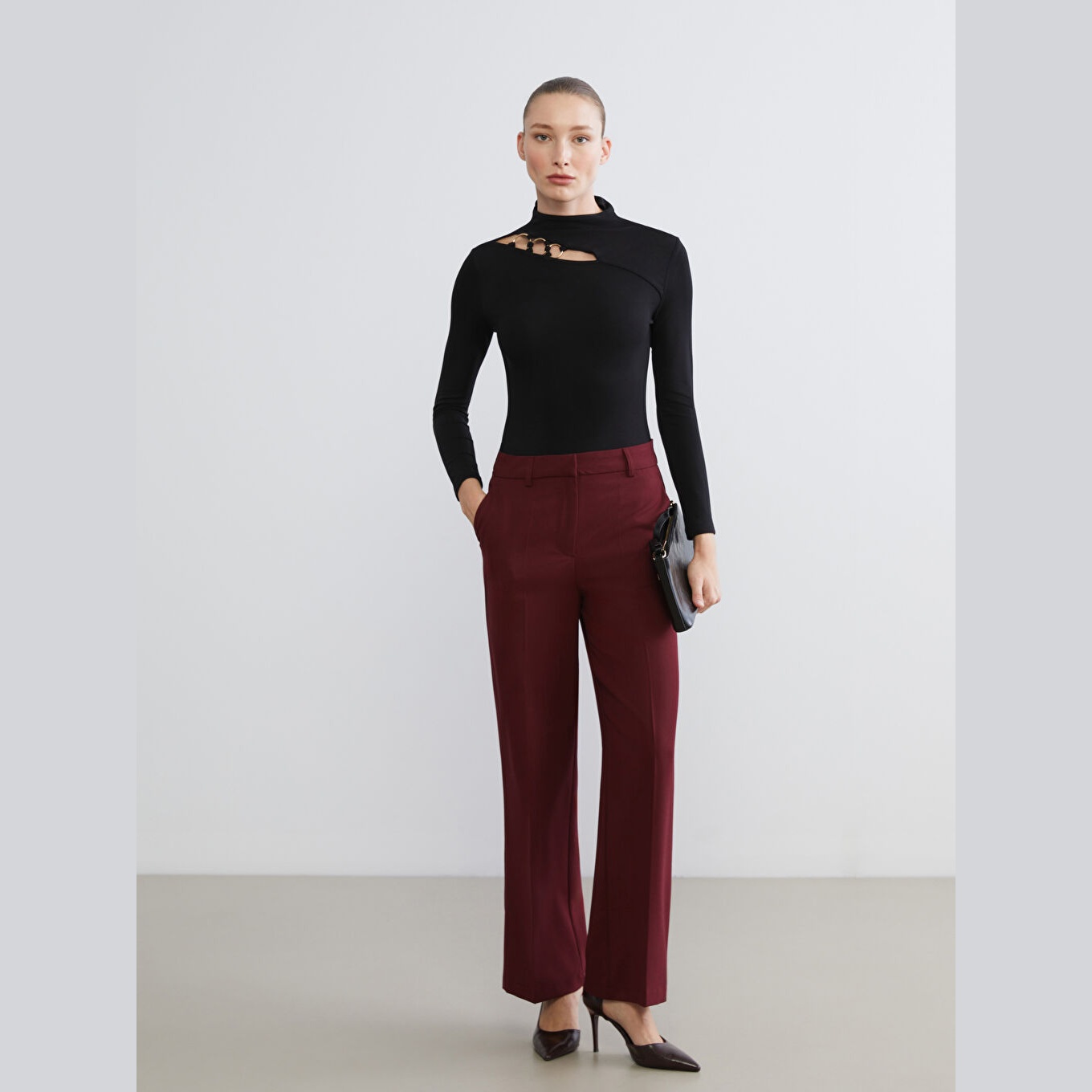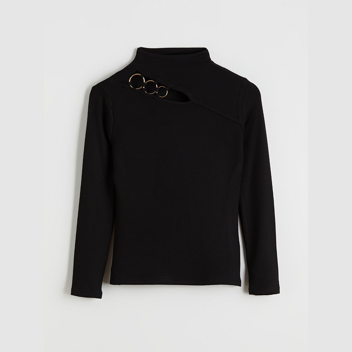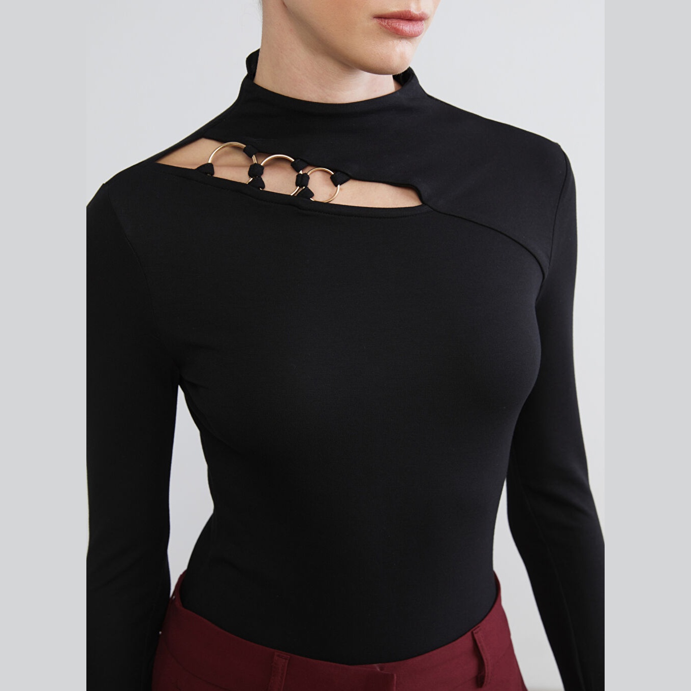تيشيرت نسائي بياقة عالية مع فتحة أمامية من LCW Basic – أسود (قصة ضيقة، خامة كاشكورسي بتركيبة فيسكوز، تصميم سادة، أكمام طويلة)