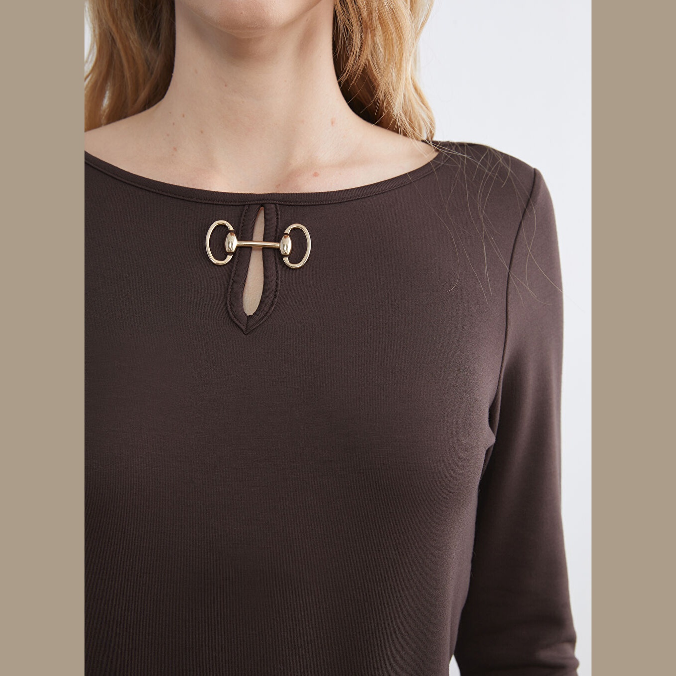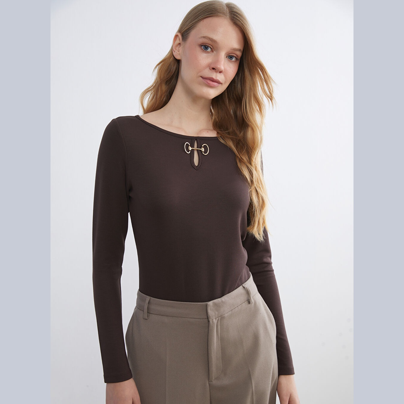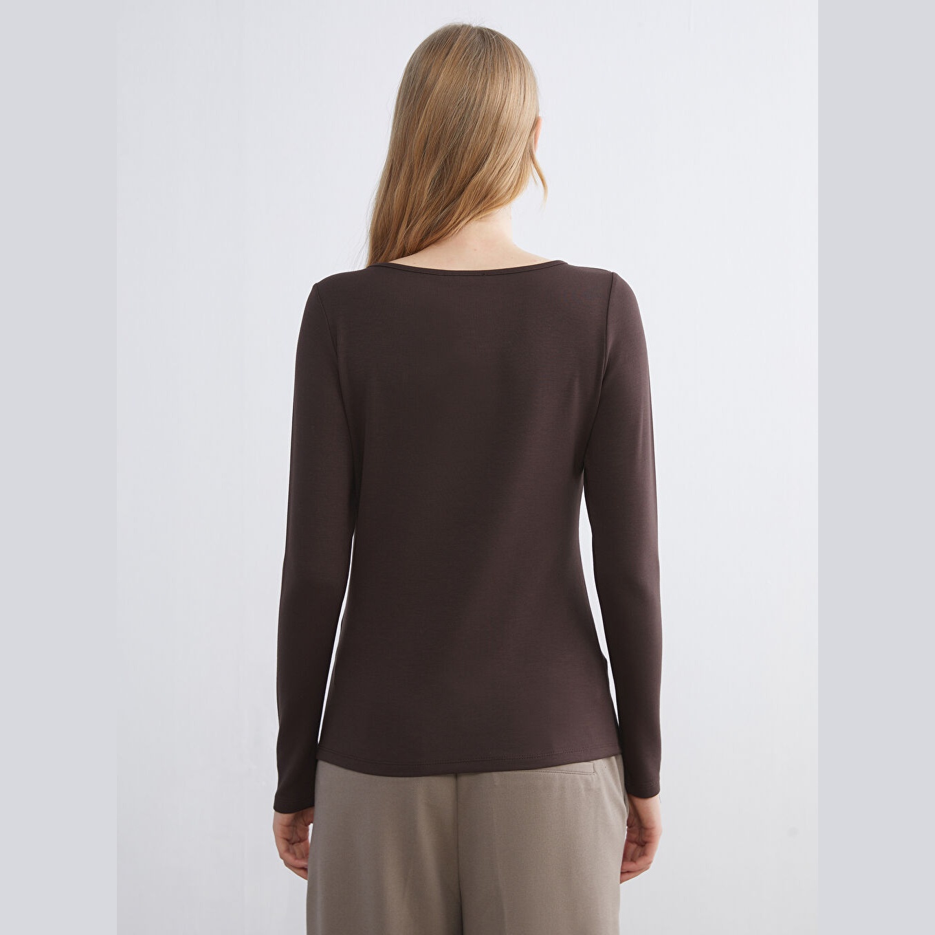 تيشيرت نسائي بياقة دائرية من LCW Basic – بني (قصة ضيقة، خامة دالغيتش بتركيبة فيسكوز، تصميم سادة، أكمام طويلة، فتحة مزينة بإكسسوار معدني)