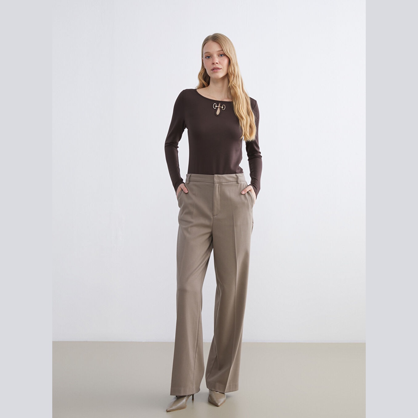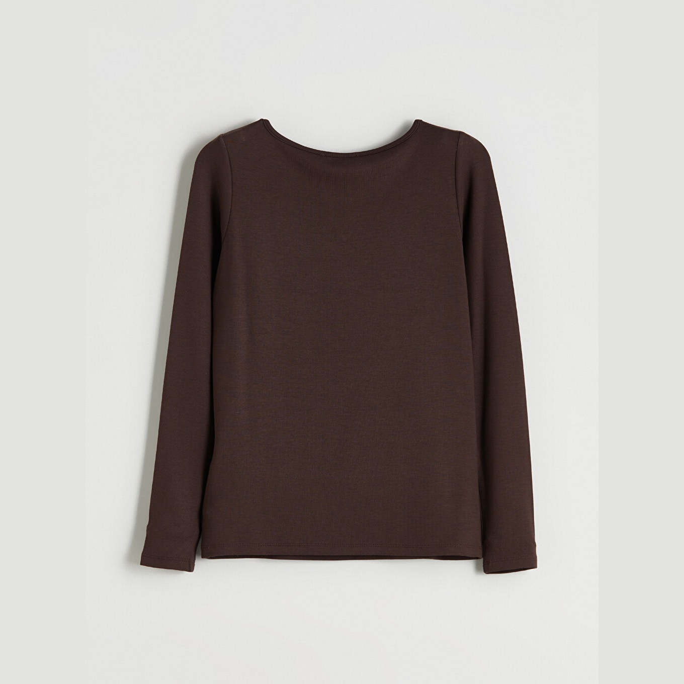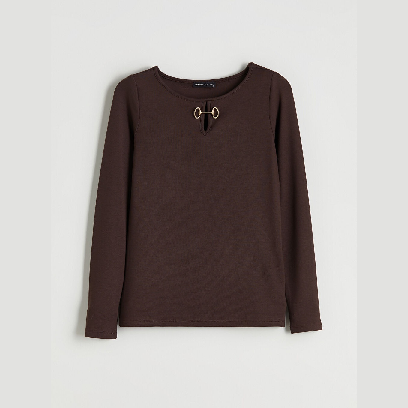 تيشيرت نسائي بياقة دائرية من LCW Basic – بني (قصة ضيقة، خامة دالغيتش بتركيبة فيسكوز، تصميم سادة، أكمام طويلة، فتحة مزينة بإكسسوار معدني)