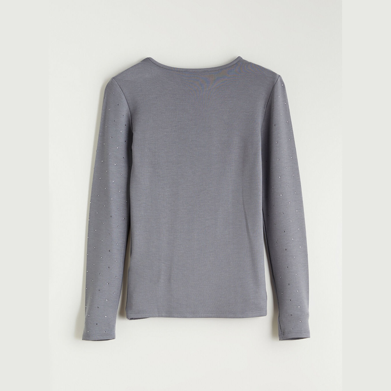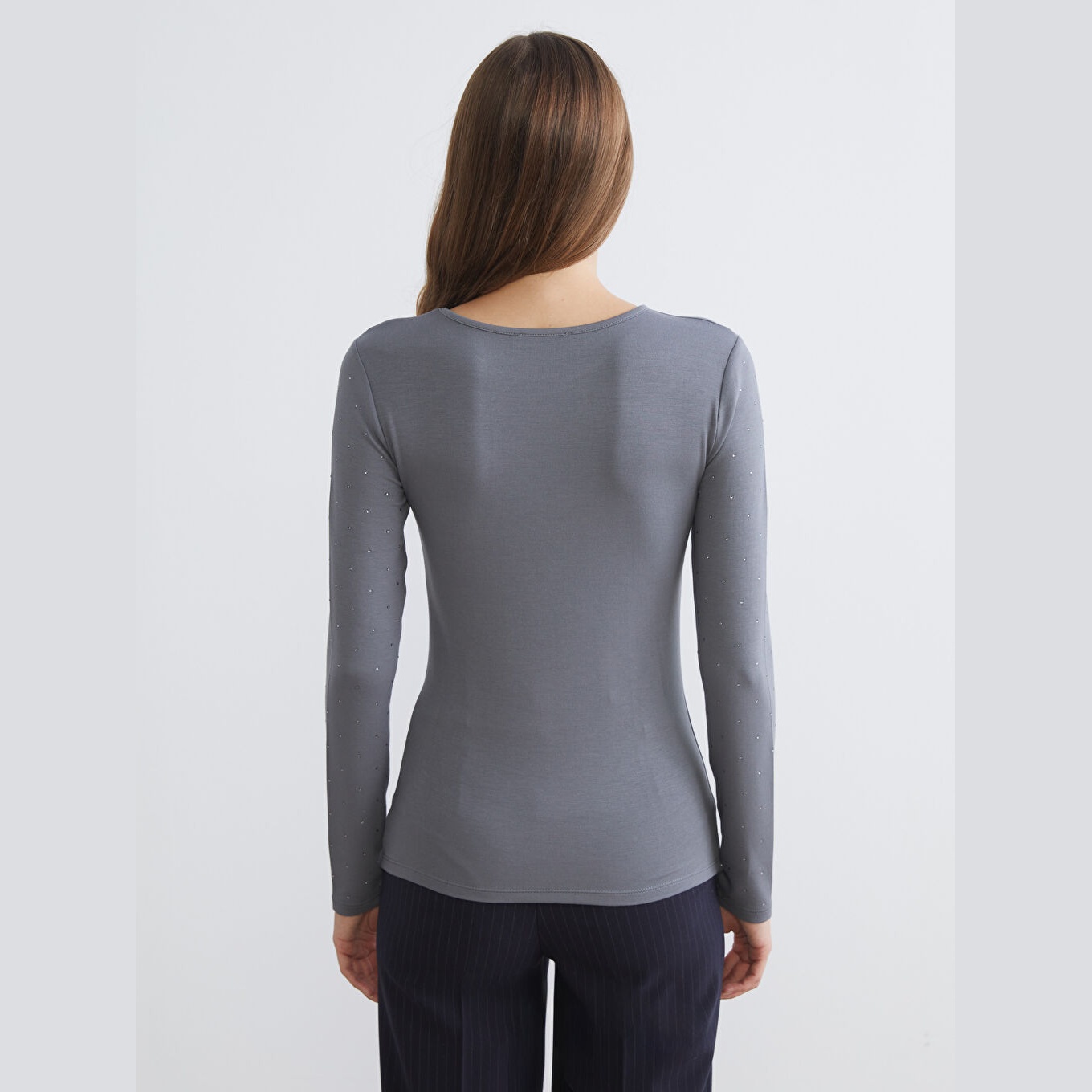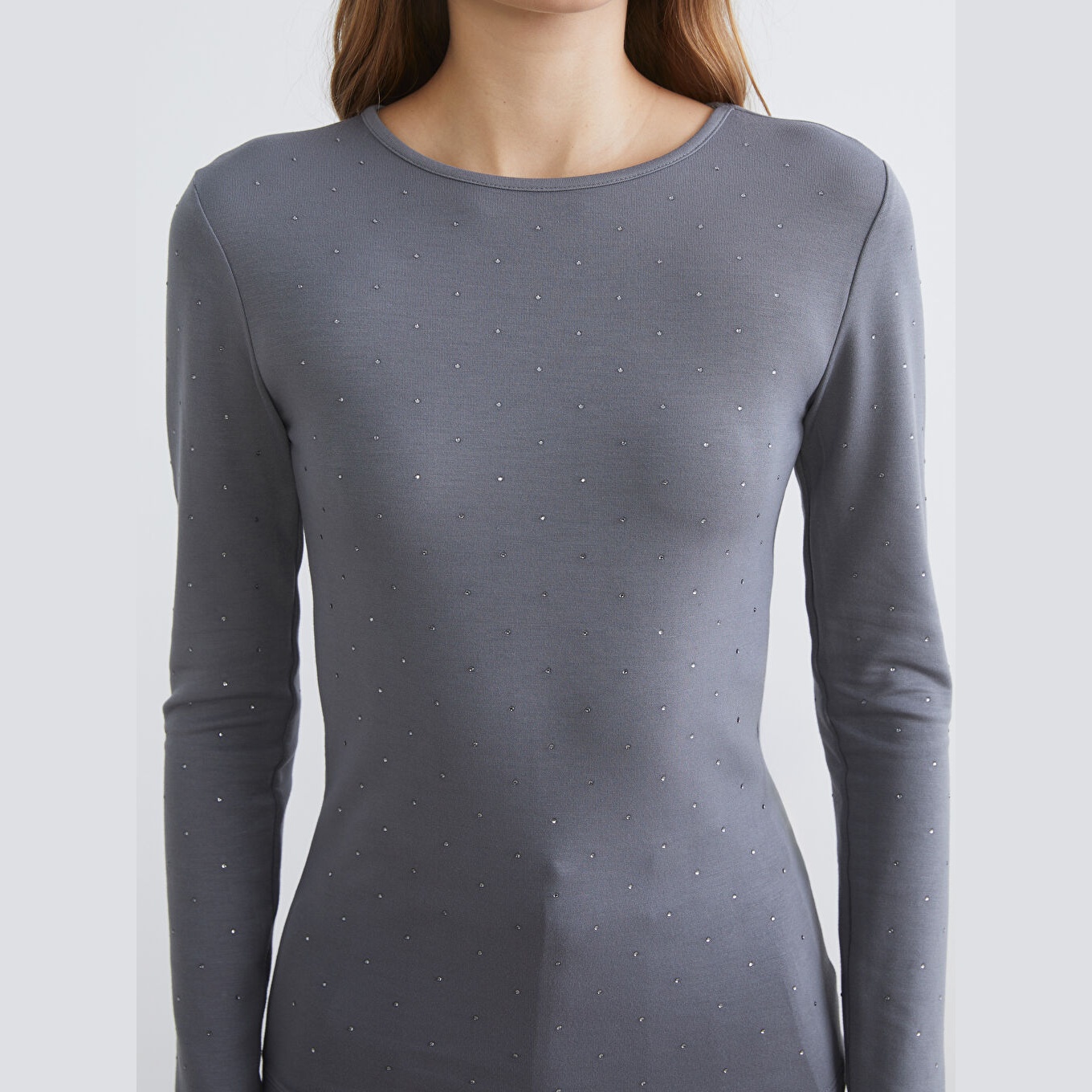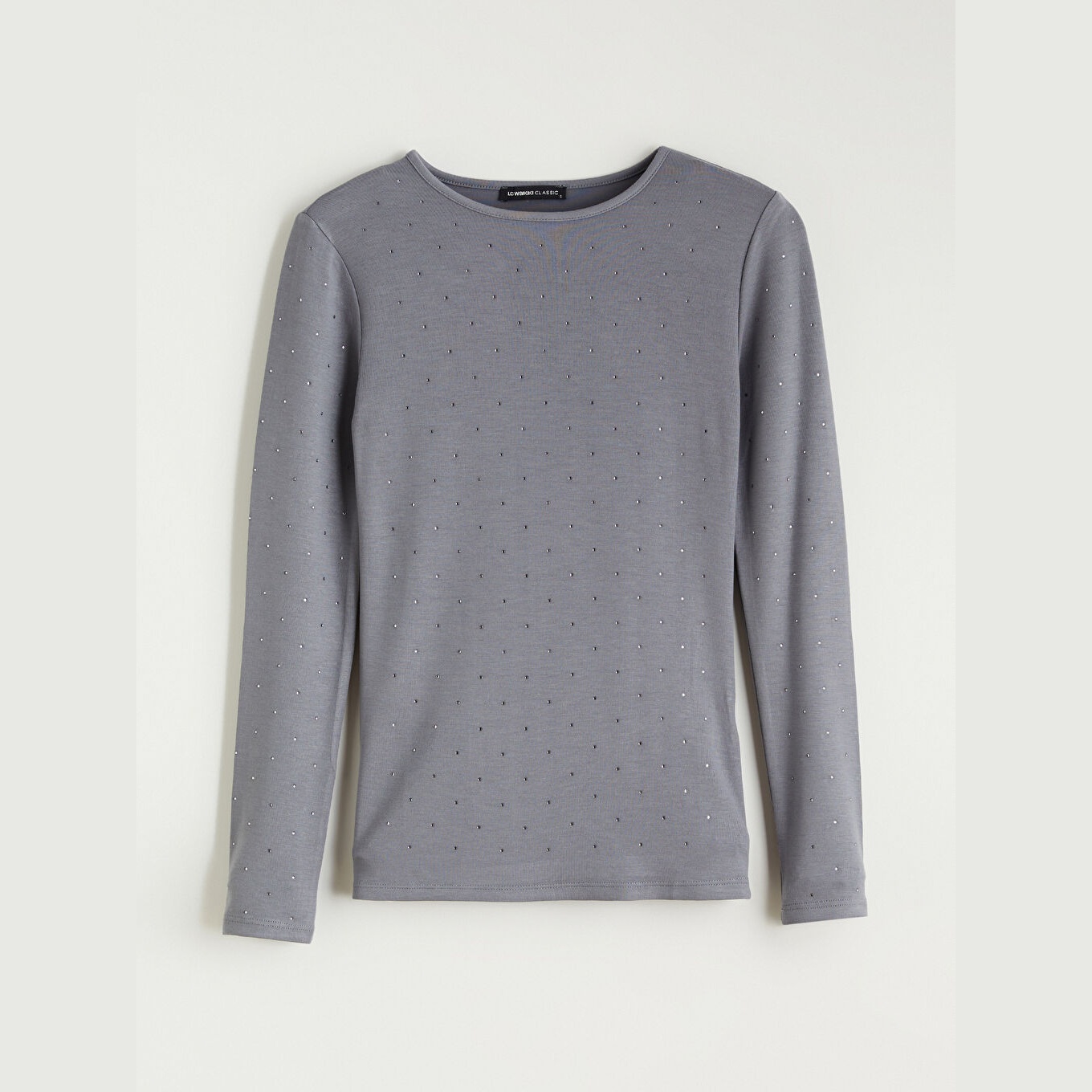 تيشيرت نسائي بياقة دائرية مزين بالأحجار من LCW Basic – رمادي (قصة ضيقة جدًا، خامة كاشكورسي بتركيبة فيسكوز، تصميم مزين بالأحجار، أكمام طويلة، فتحة مزينة بإكسسوار معدني)