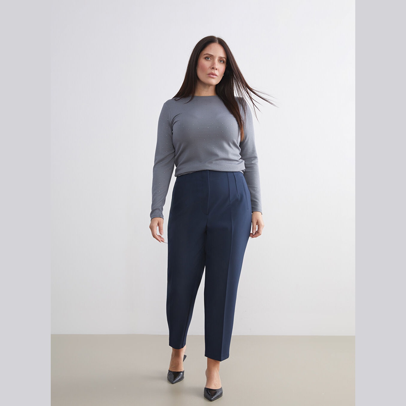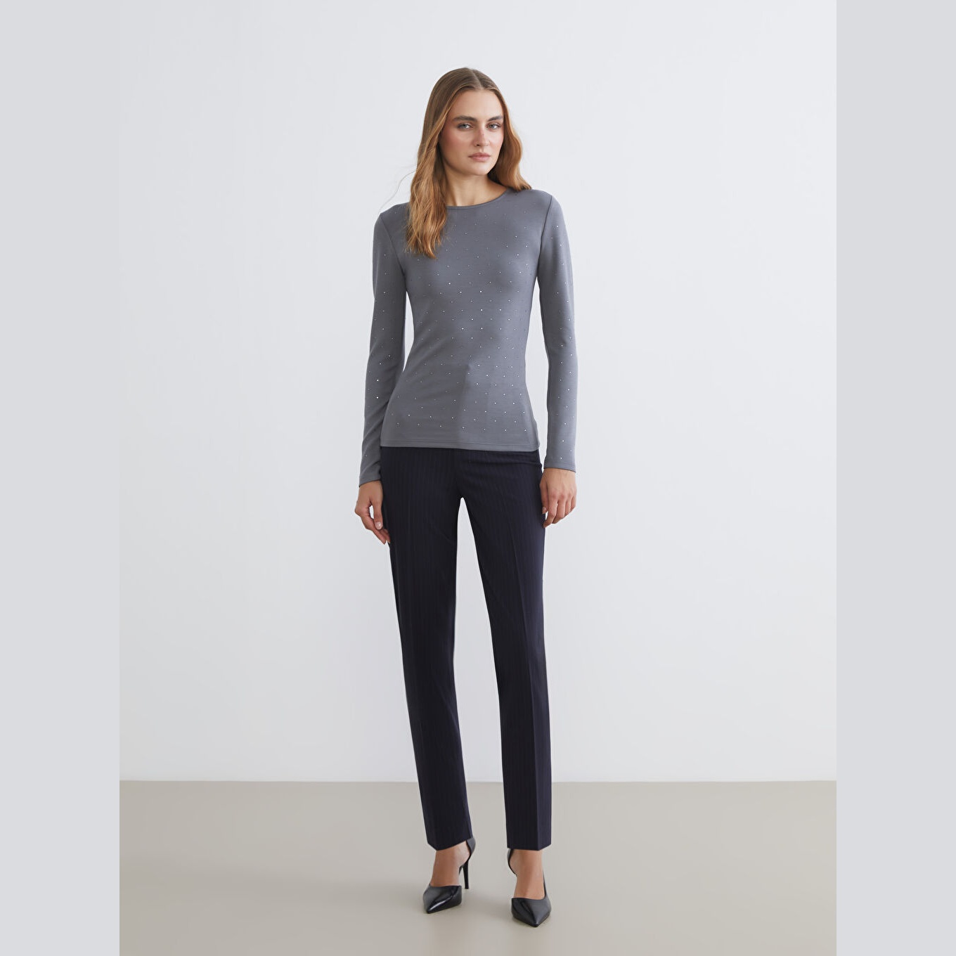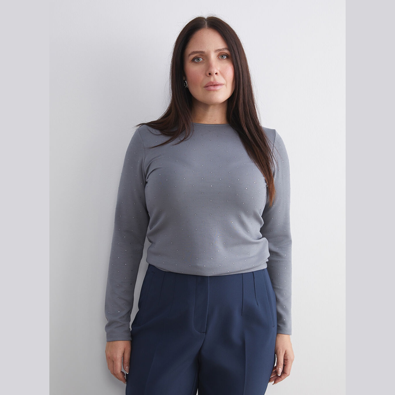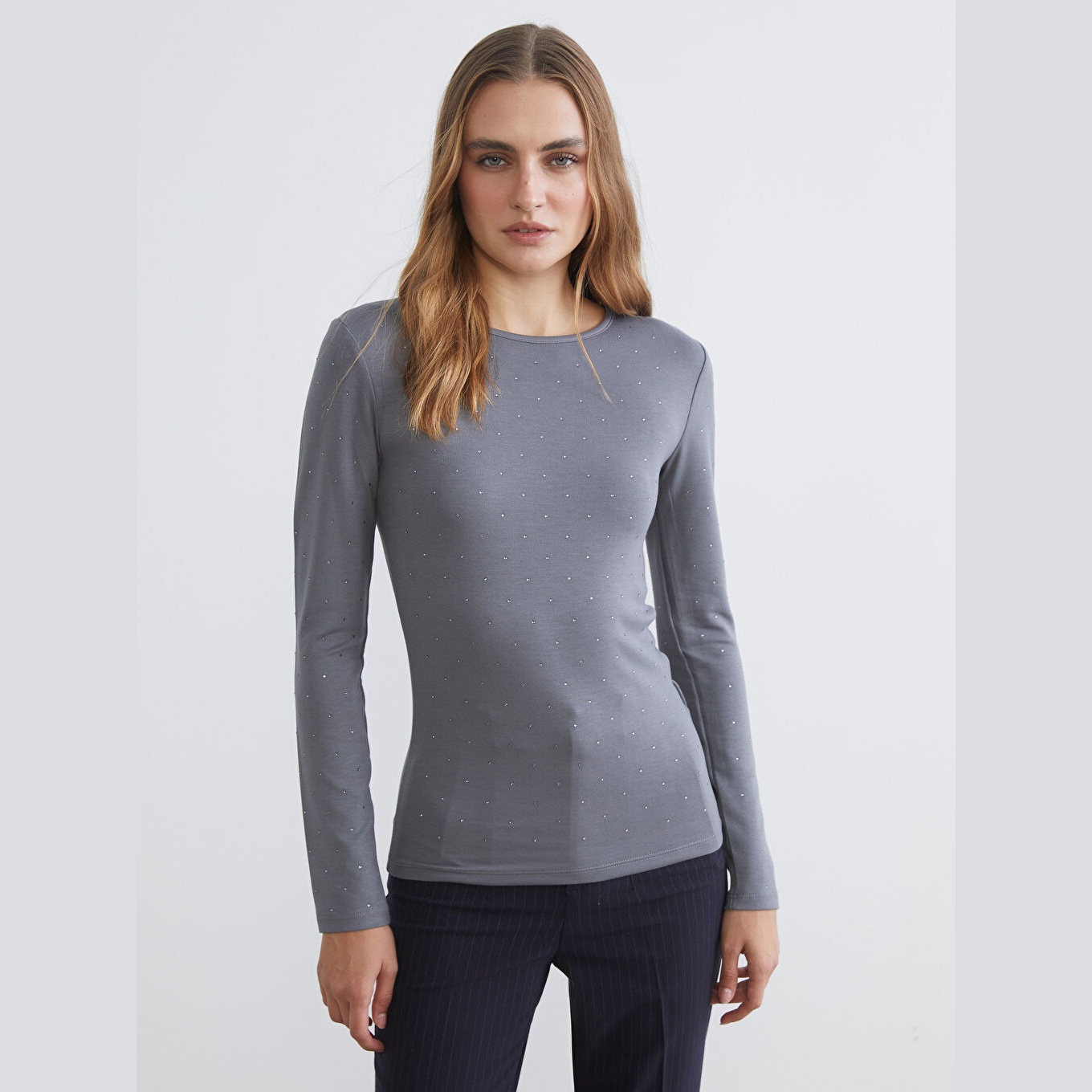 تيشيرت نسائي بياقة دائرية مزين بالأحجار من LCW Basic – رمادي (قصة ضيقة جدًا، خامة كاشكورسي بتركيبة فيسكوز، تصميم مزين بالأحجار، أكمام طويلة، فتحة مزينة بإكسسوار معدني)