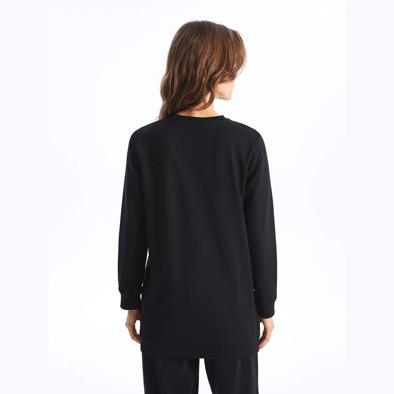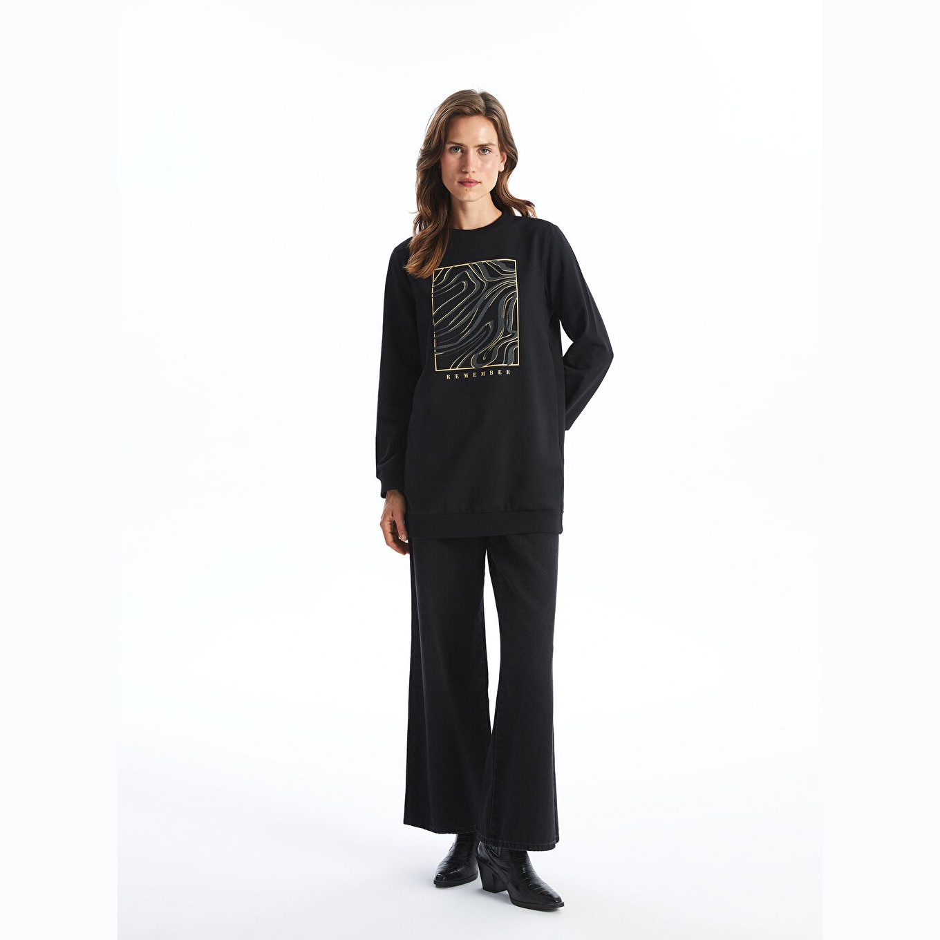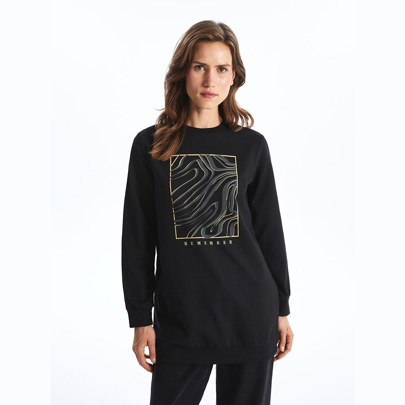 سويت شيرت تونيك نسائي بياقة دائرية من LCW ECO – أسود (قصة قياسية، تصميم مطبوع، خامة خفيفة من قطن وبوليستر، أكمام طويلة، طول يغطي الأرداف)