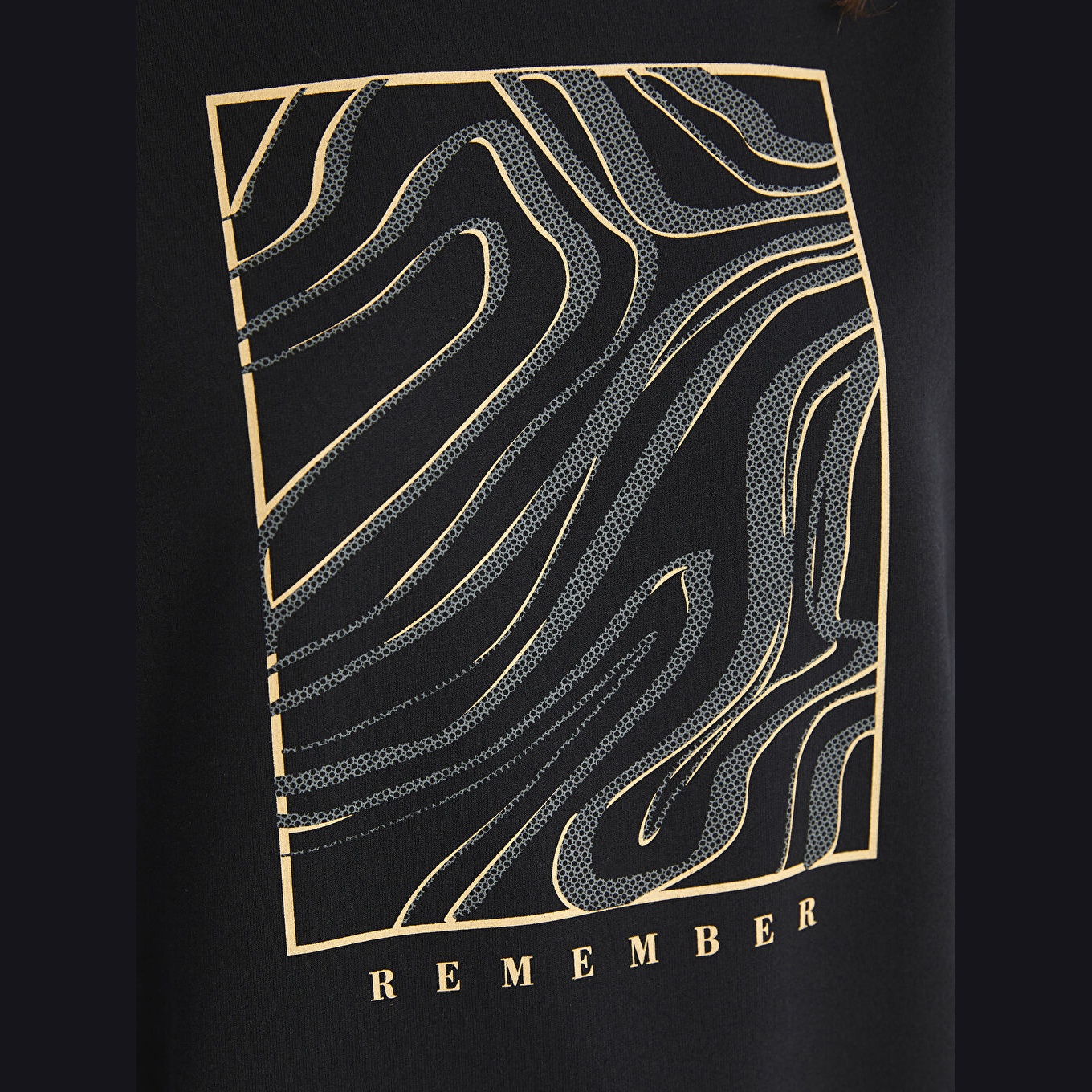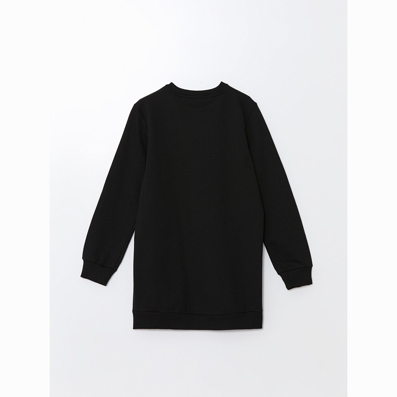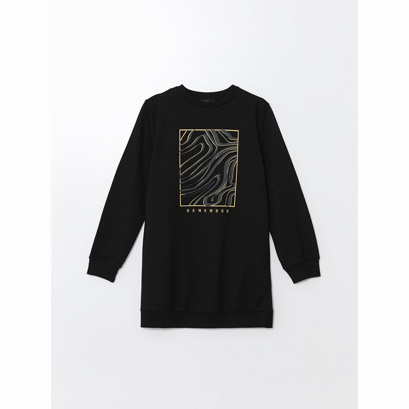 سويت شيرت تونيك نسائي بياقة دائرية من LCW ECO – أسود (قصة قياسية، تصميم مطبوع، خامة خفيفة من قطن وبوليستر، أكمام طويلة، طول يغطي الأرداف)