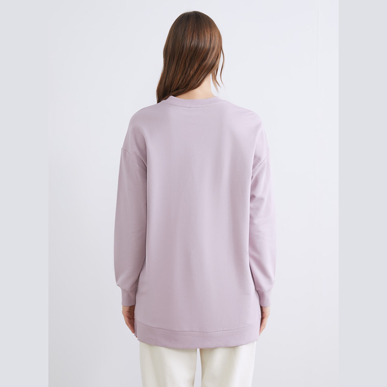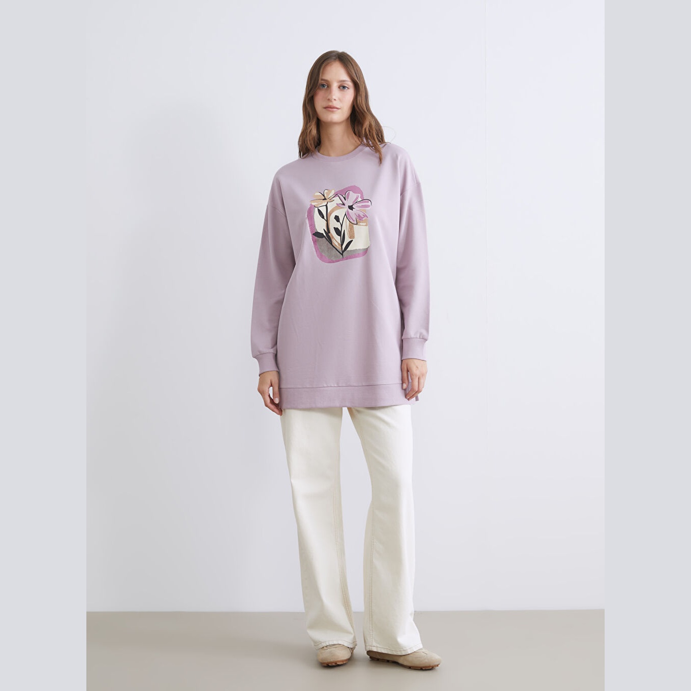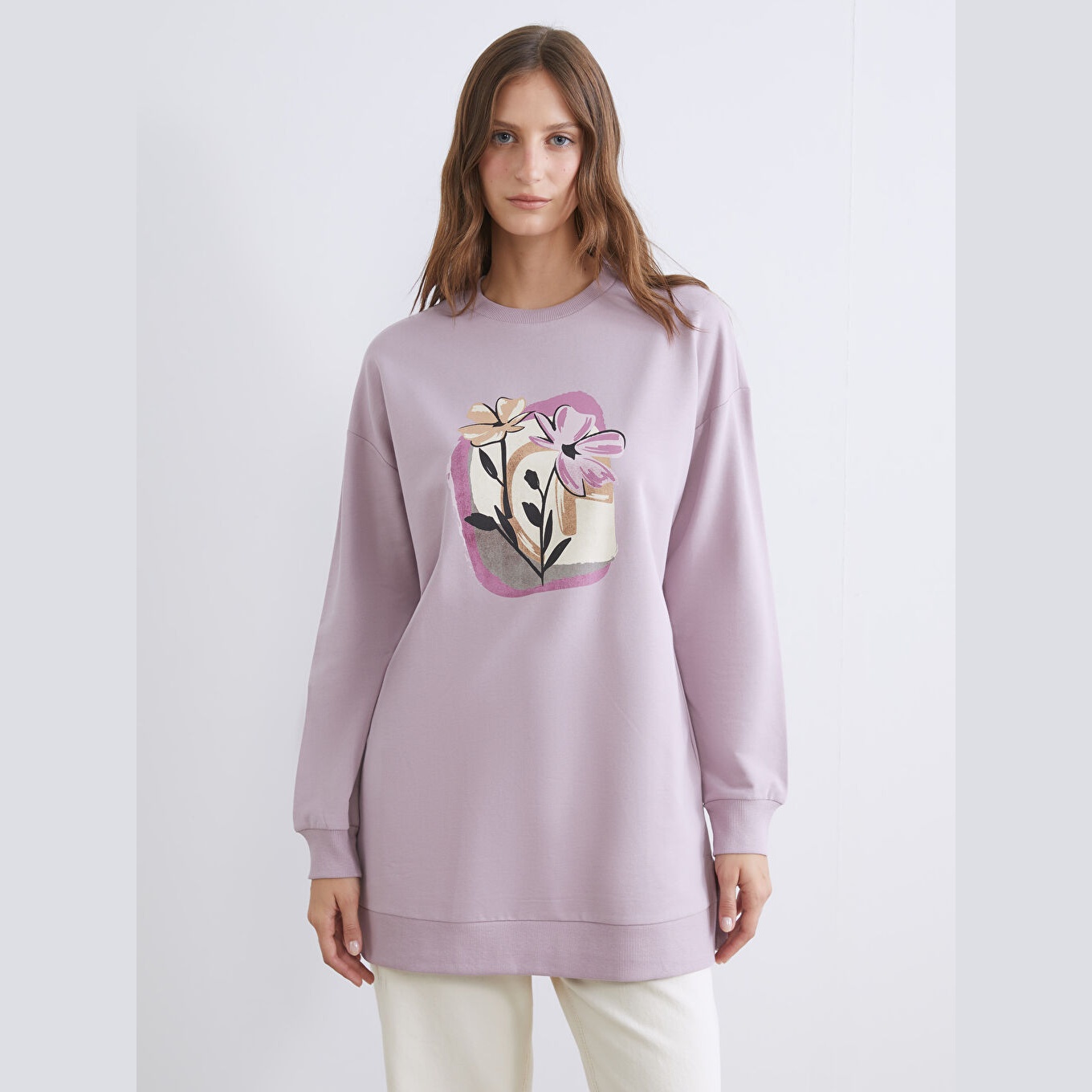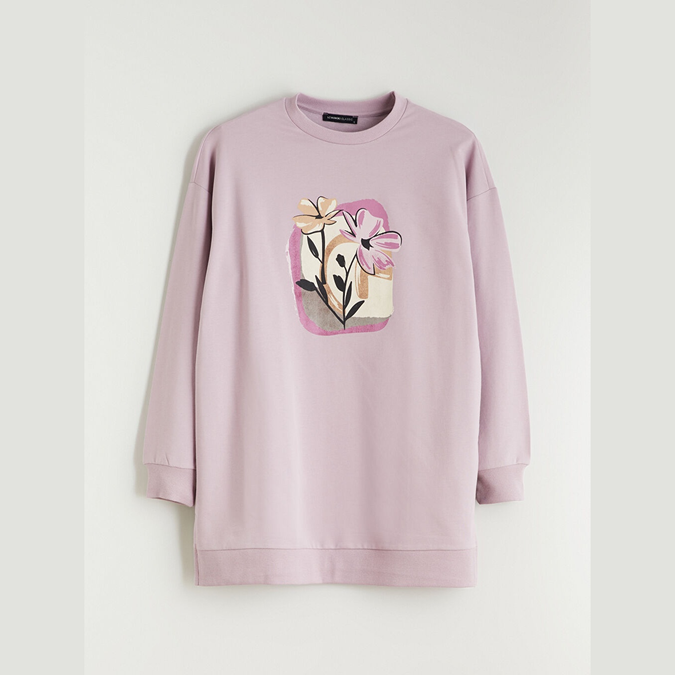 سويت شيرت تونيك نسائي بياقة دائرية من LC Waikiki – ليلكي (قصة واسعة، نقشة زهرية، خامة خفيفة بتركيبة عالية القطن، أكمام طويلة، طول يغطي الأرداف)