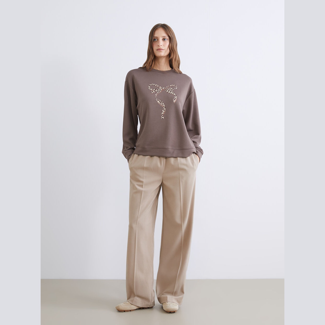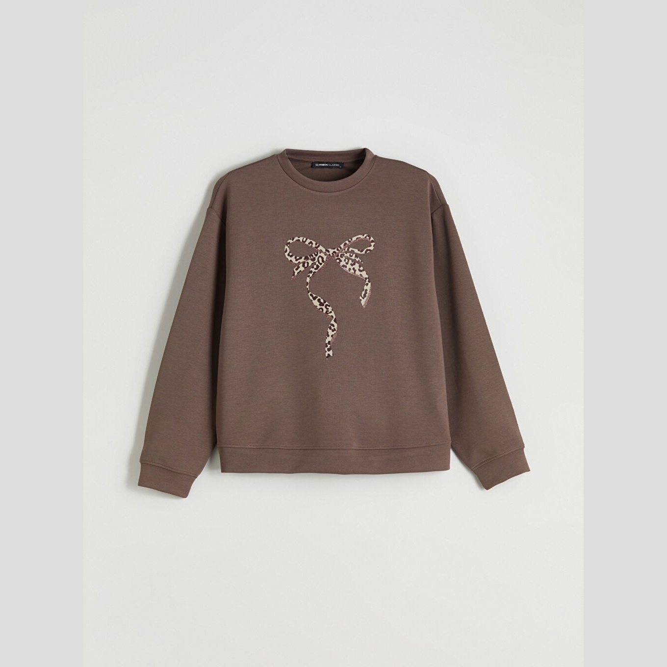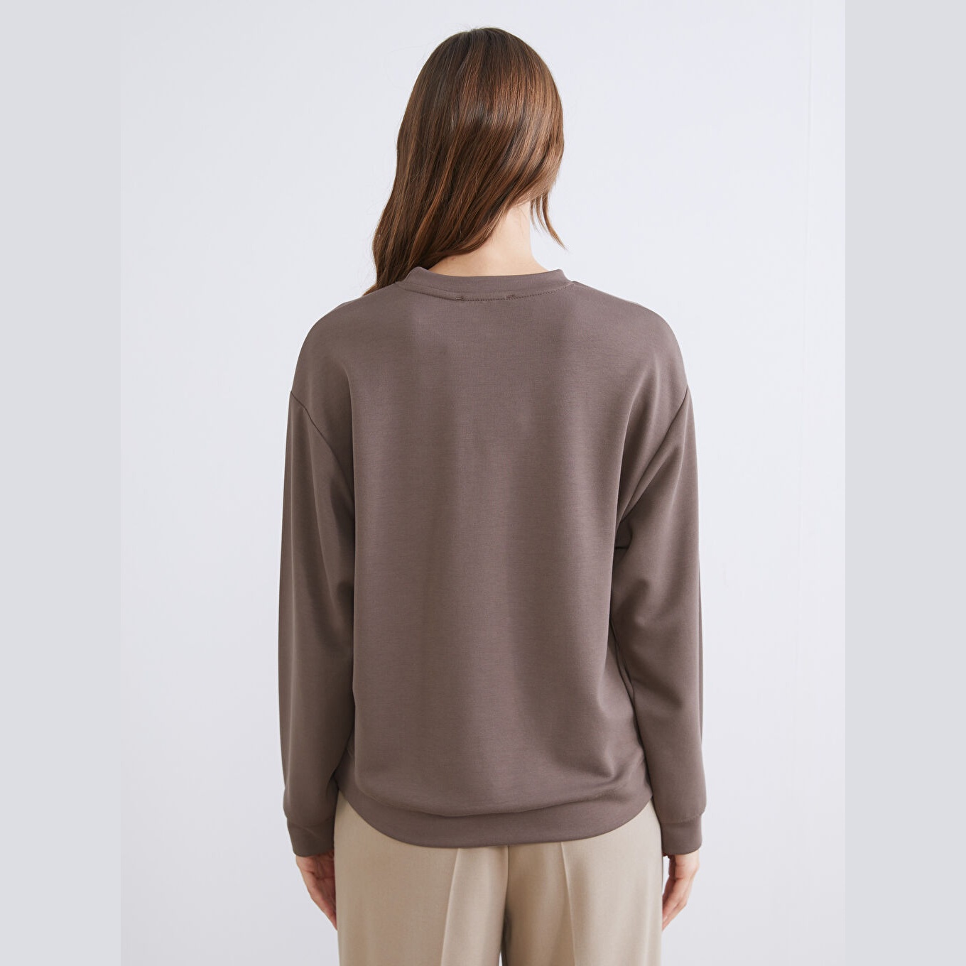 سويت شيرت نسائي بياقة دائرية من LC Waikiki – بني (قصة واسعة، خامة دالغيتش متوسطة السماكة، تصميم مطبوع، أكمام طويلة)