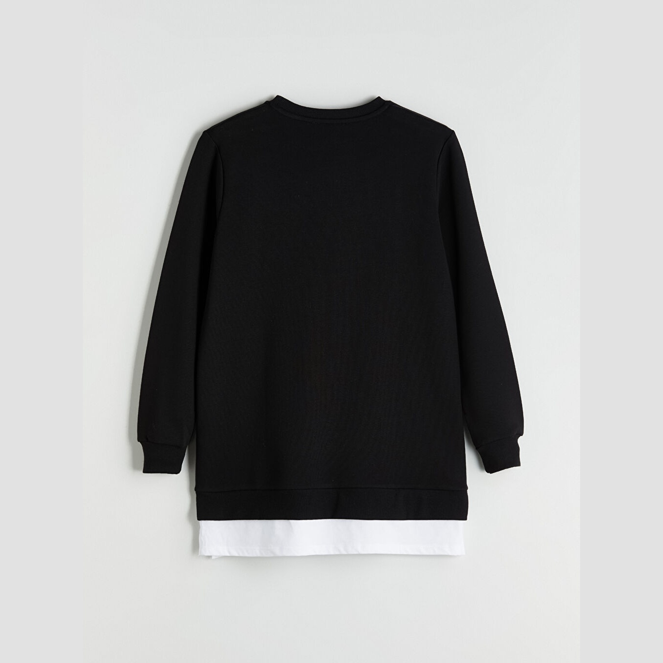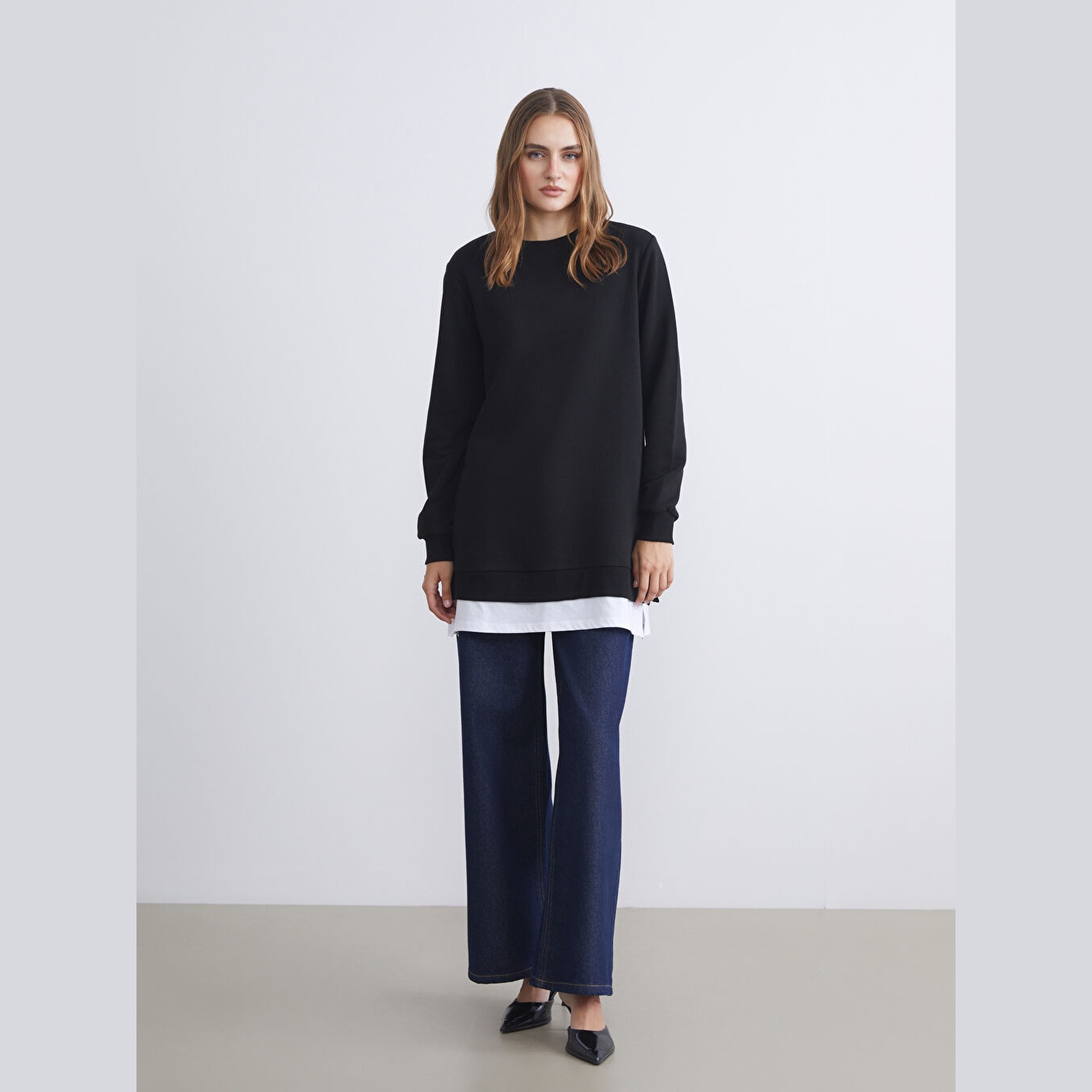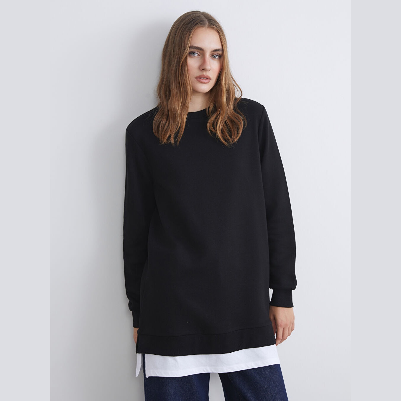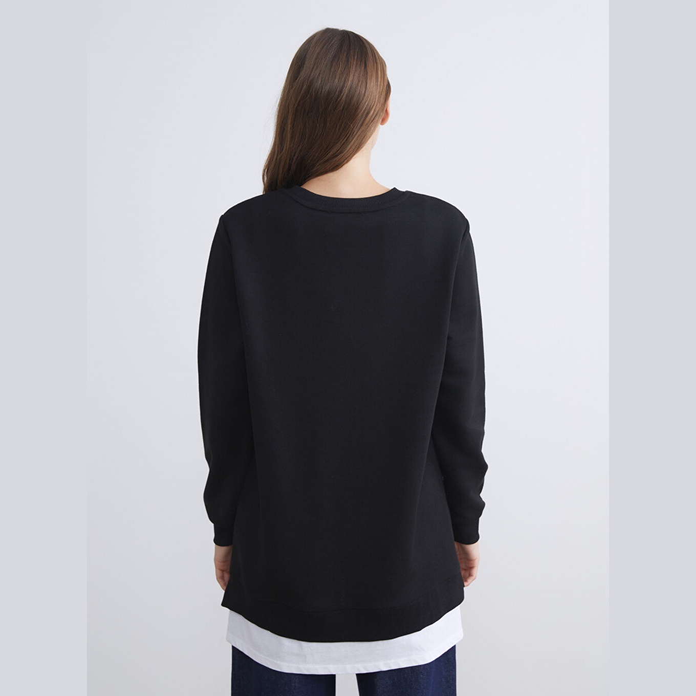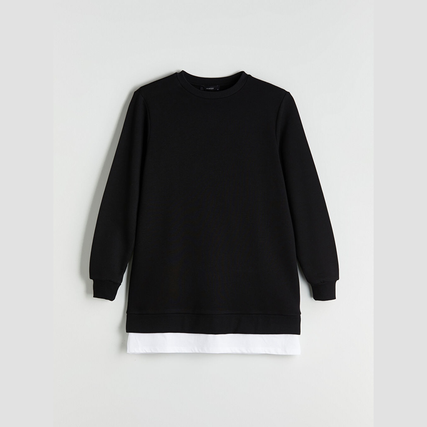 سويت شيرت تونيك نسائي بياقة دائرية من LC Waikiki – أسود (قصة فضفاضة، خامة خفيفة بتركيبة قطنية، تصميم سادة، أكمام طويلة، طول يغطي الأرداف)