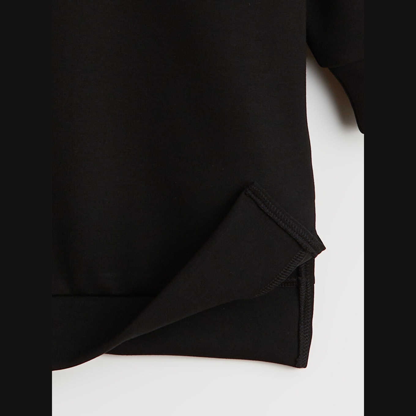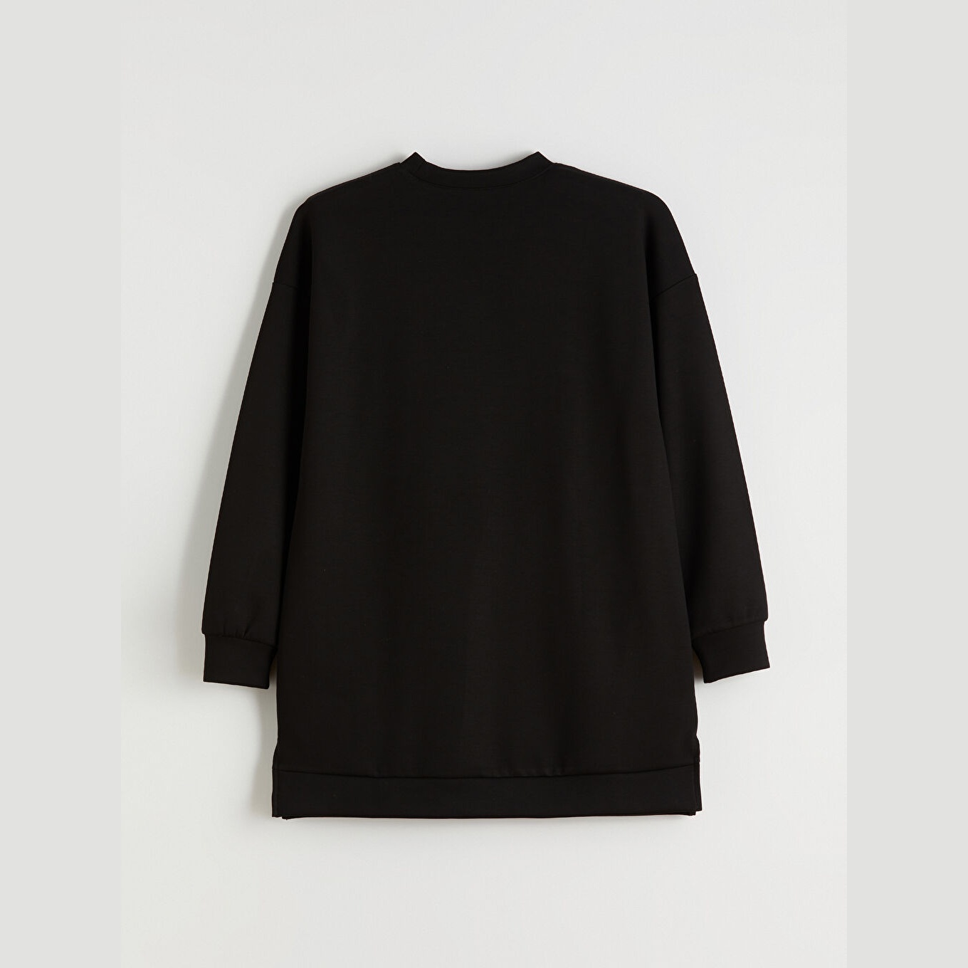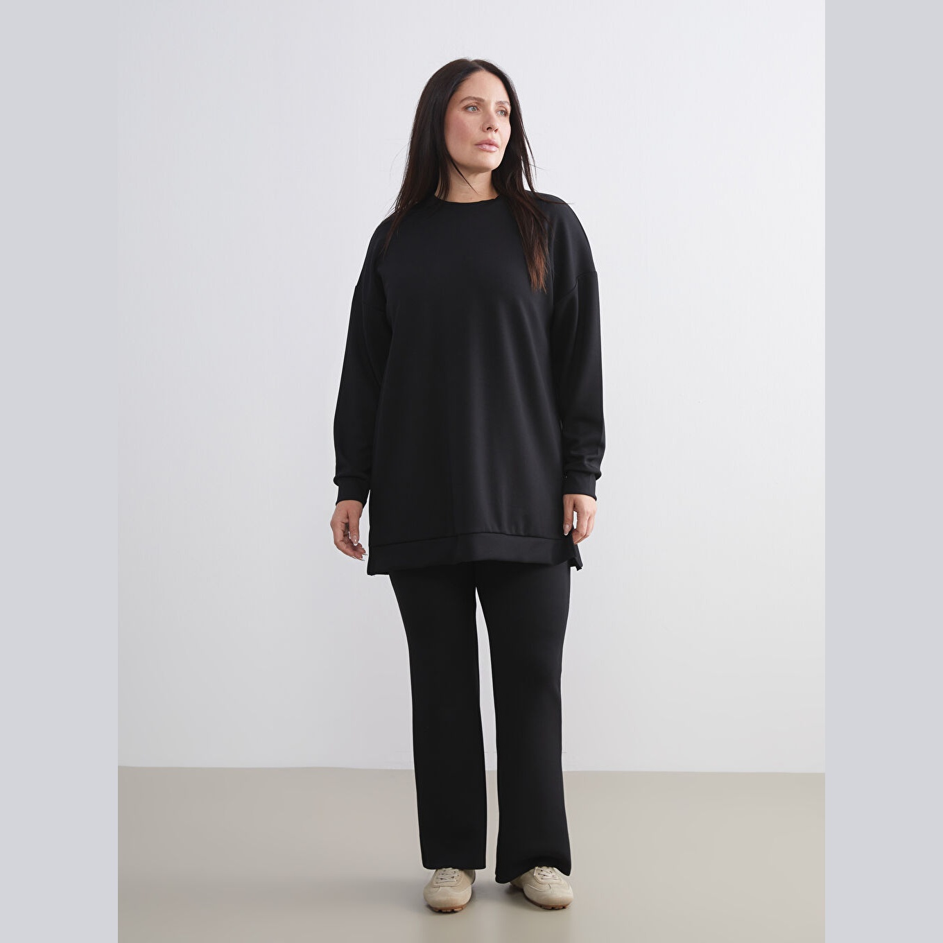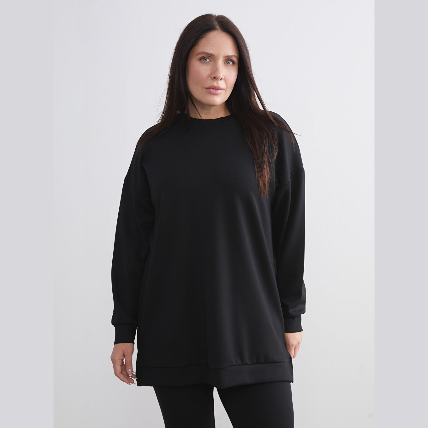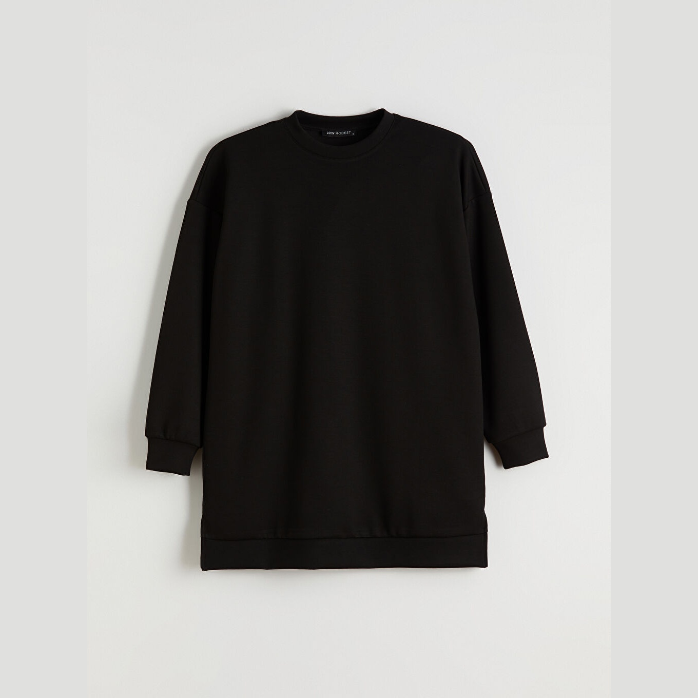سويت شيرت تونيك نسائي بياقة دائرية من LCW Modest – أسود (قصة فضفاضة، خامة خفيفة بتركيبة مرنة، تصميم سادة، شق جانبي، طول يغطي الأرداف)