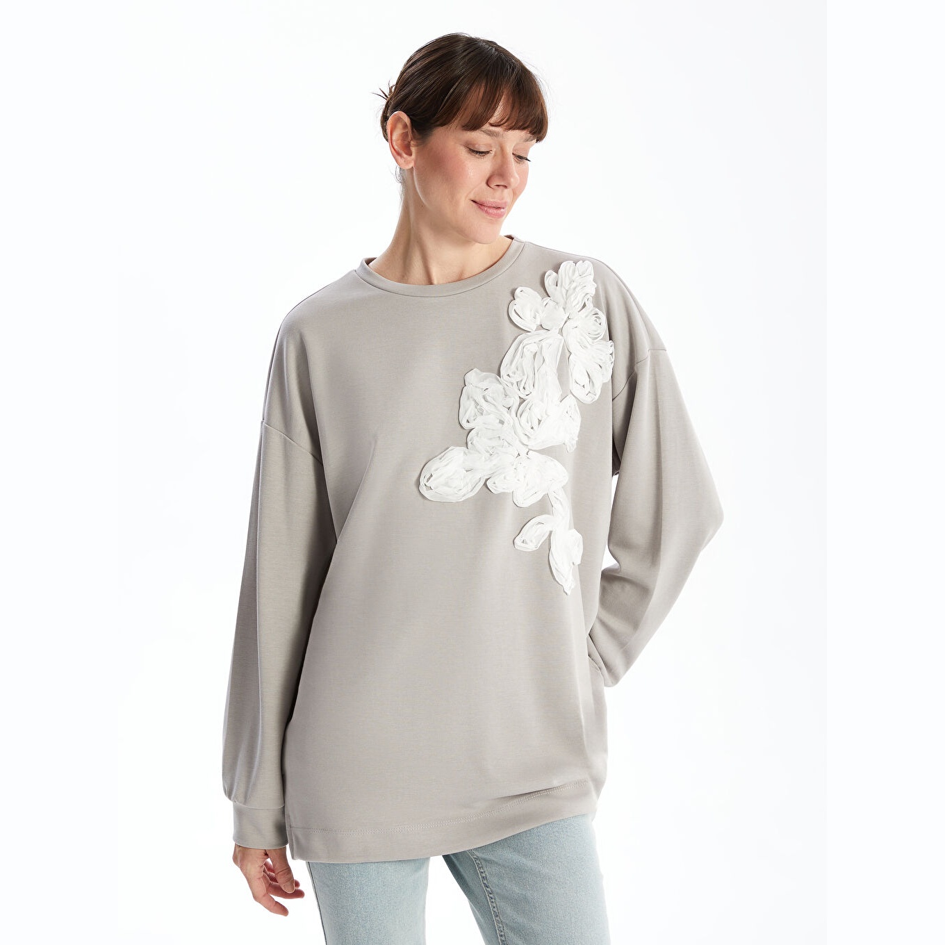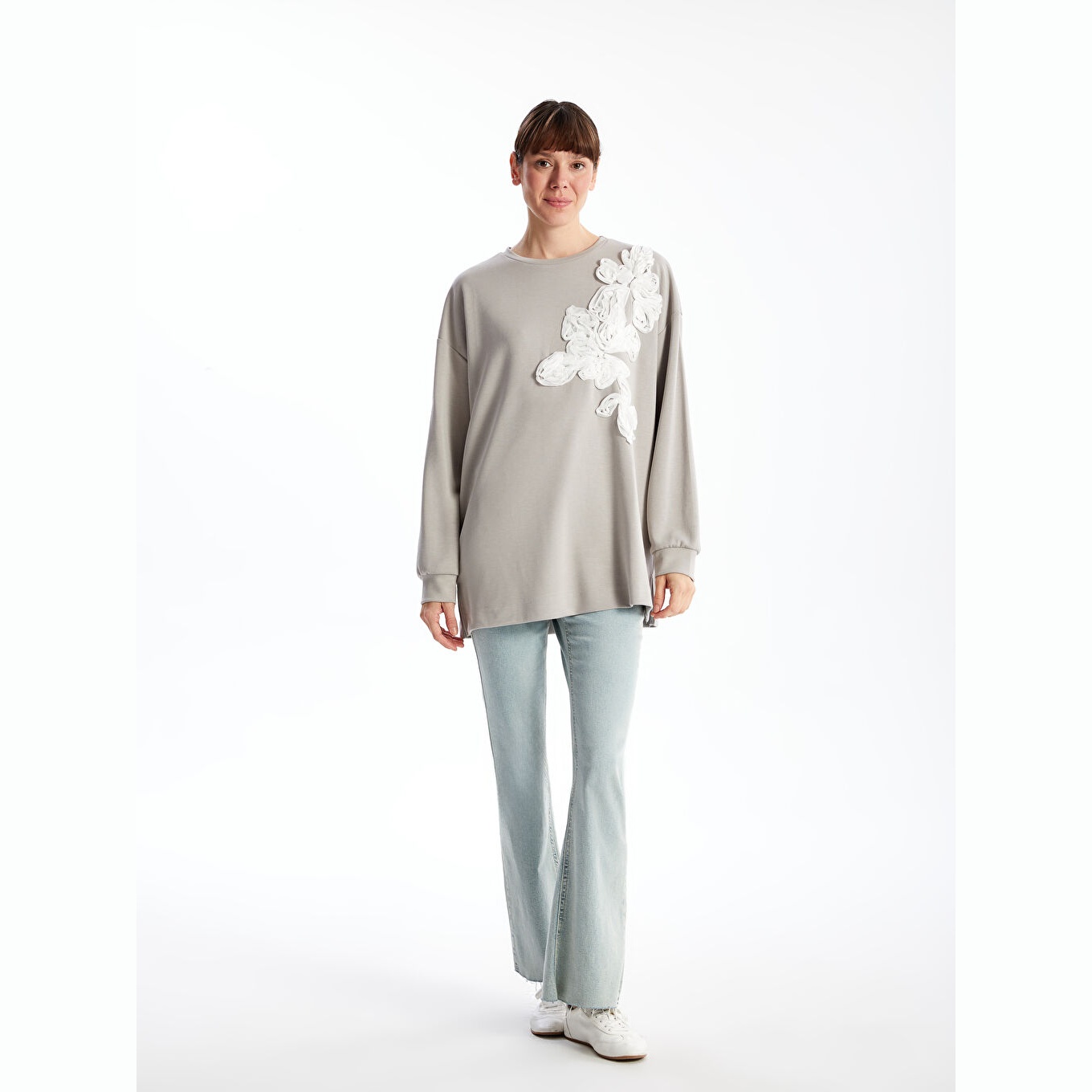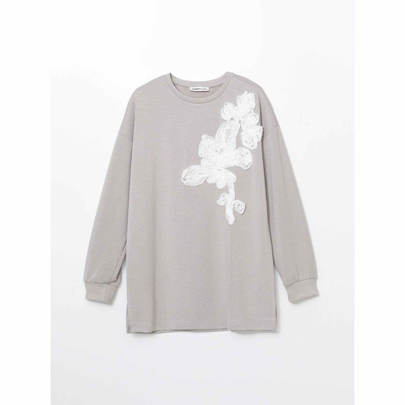 سويت شيرت تونيك نسائي مطرز بياقة دائرية من LCW Modest – رمادي (قصة واسعة، خامة متوسطة السماكة بتركيبة مرنة، تصميم مطرز، أكمام طويلة، طول يغطي الأرداف)