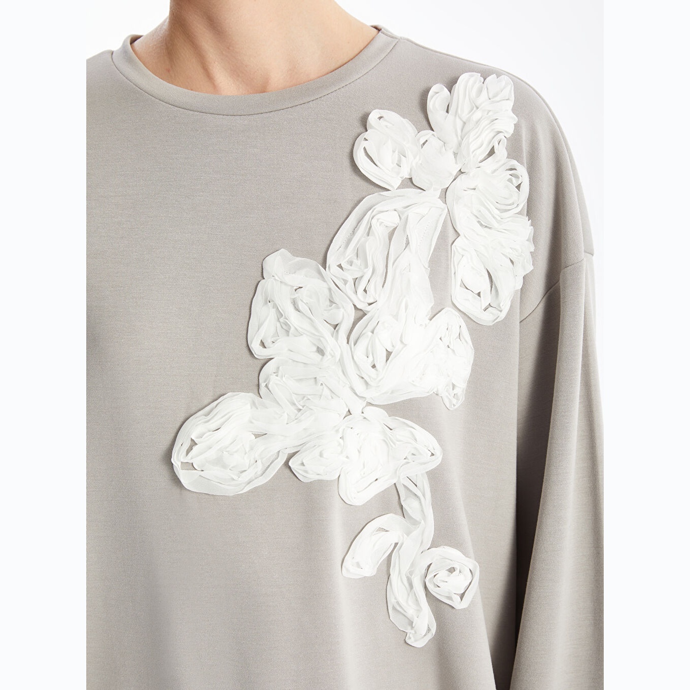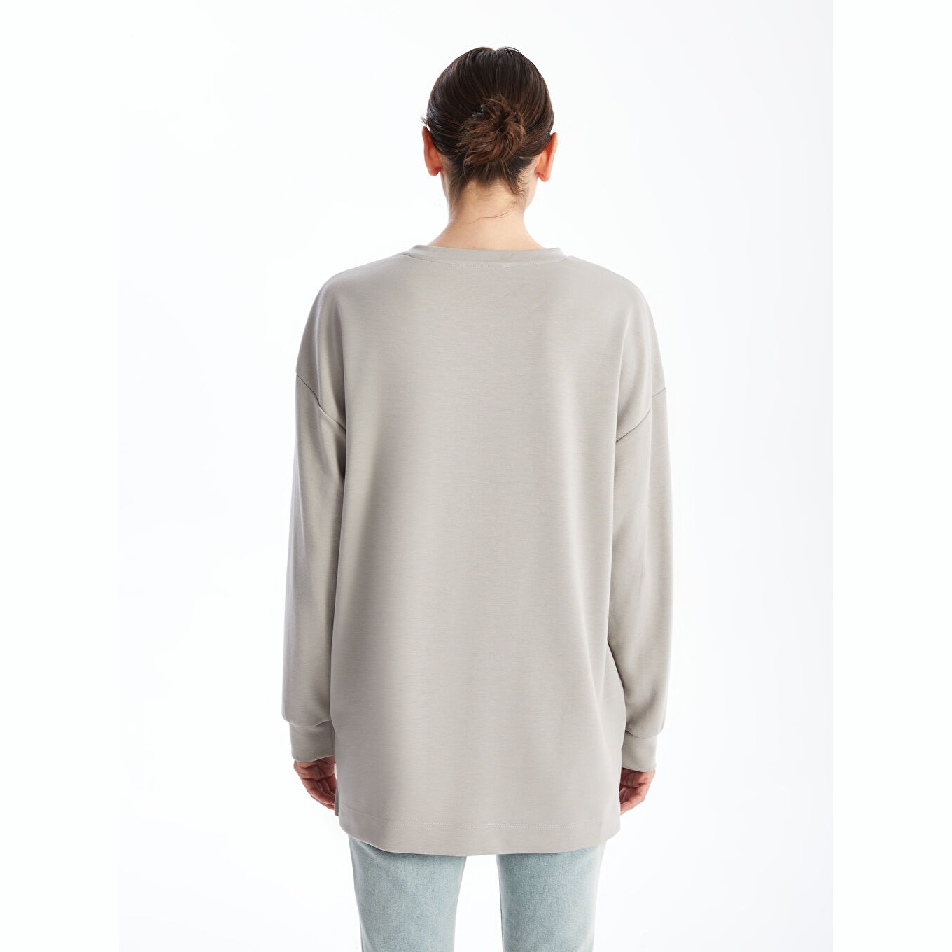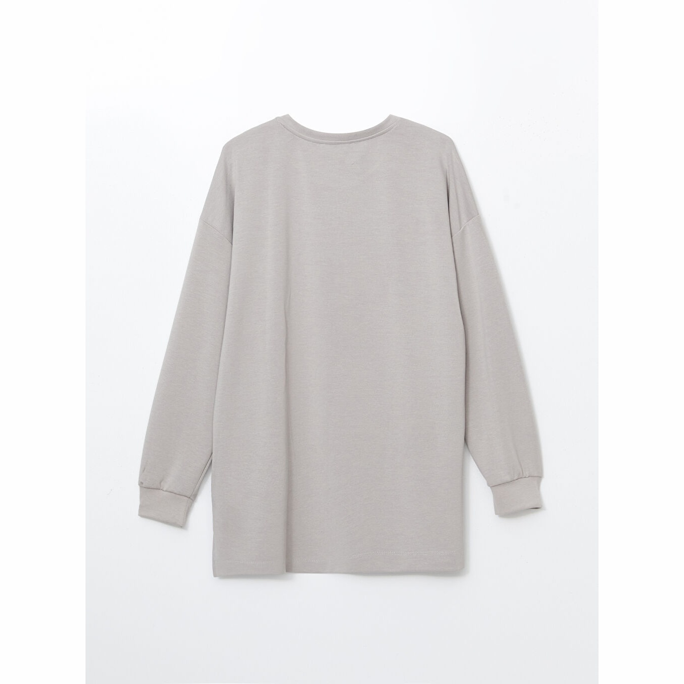 سويت شيرت تونيك نسائي مطرز بياقة دائرية من LCW Modest – رمادي (قصة واسعة، خامة متوسطة السماكة بتركيبة مرنة، تصميم مطرز، أكمام طويلة، طول يغطي الأرداف)