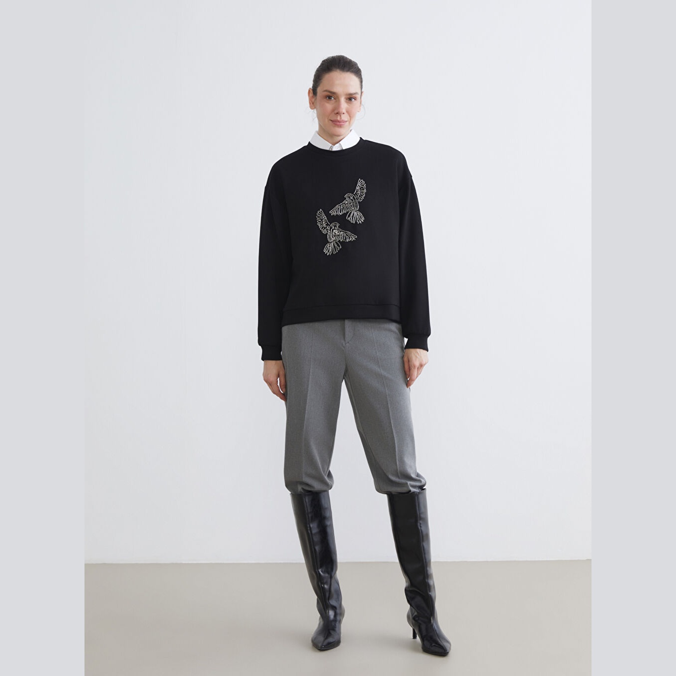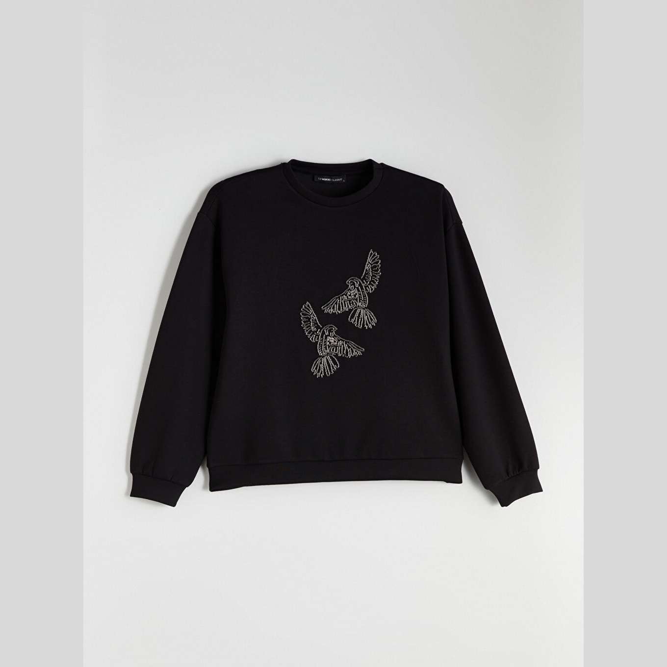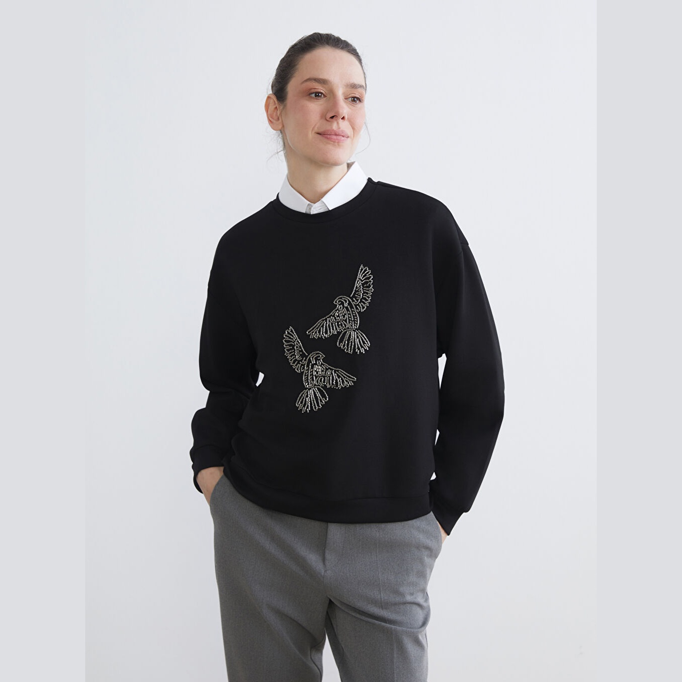 سويت شيرت نسائي مزين بأحجار بياقة دائرية من LCWAIKIKI Basic – أسود (قصة واسعة، خامة خفيفة بتركيبة مرنة، تصميم مزخرف، أكمام طويلة)