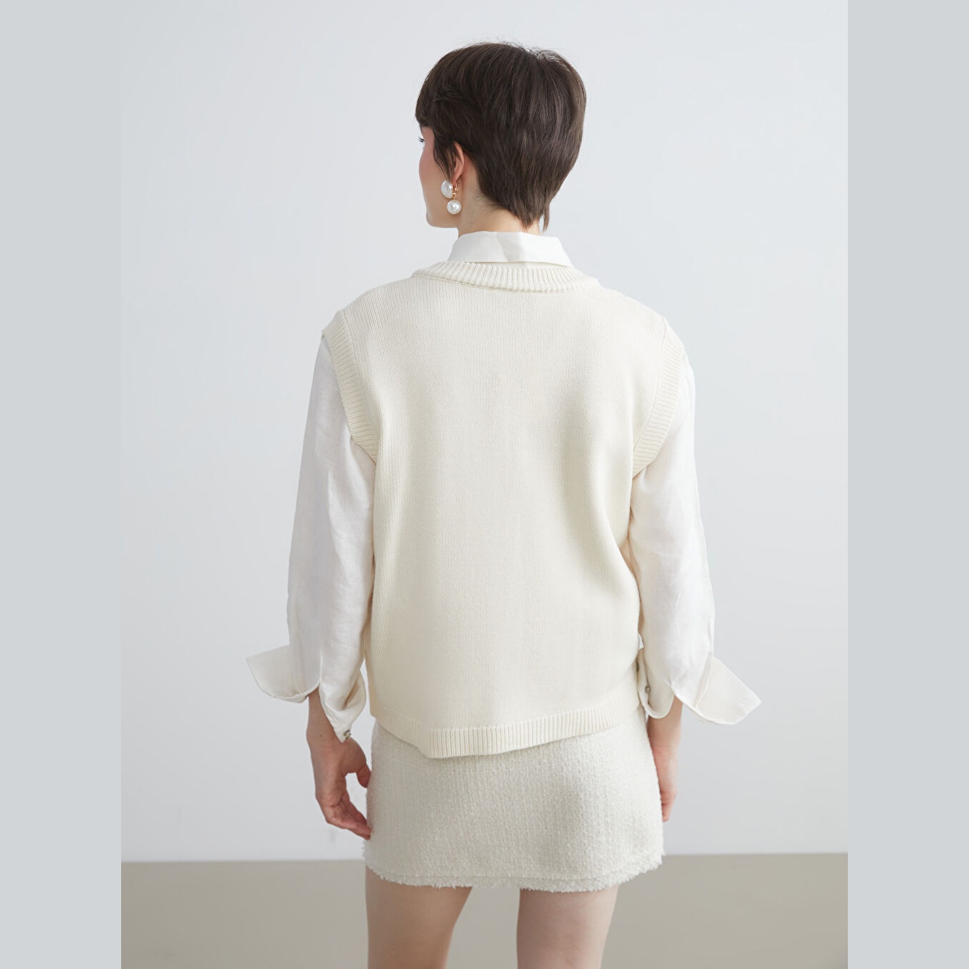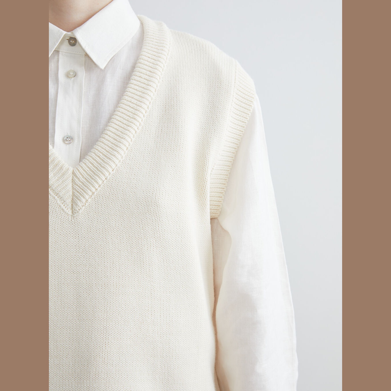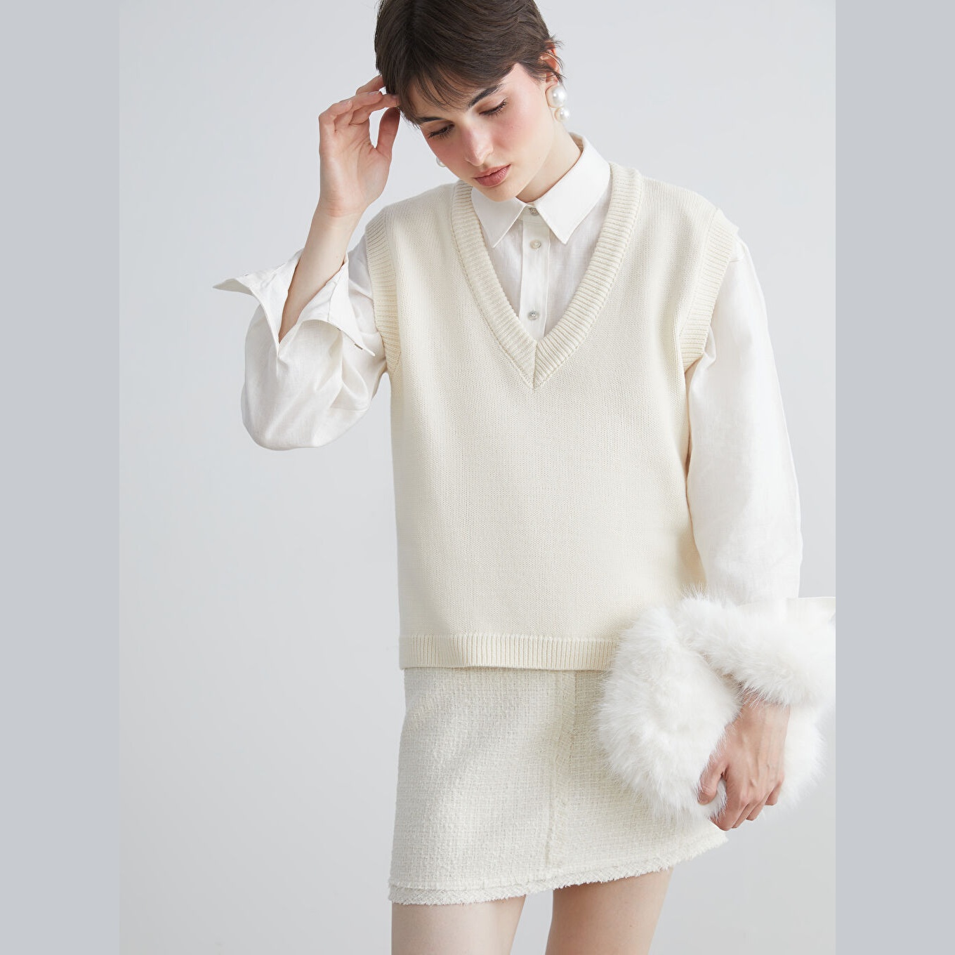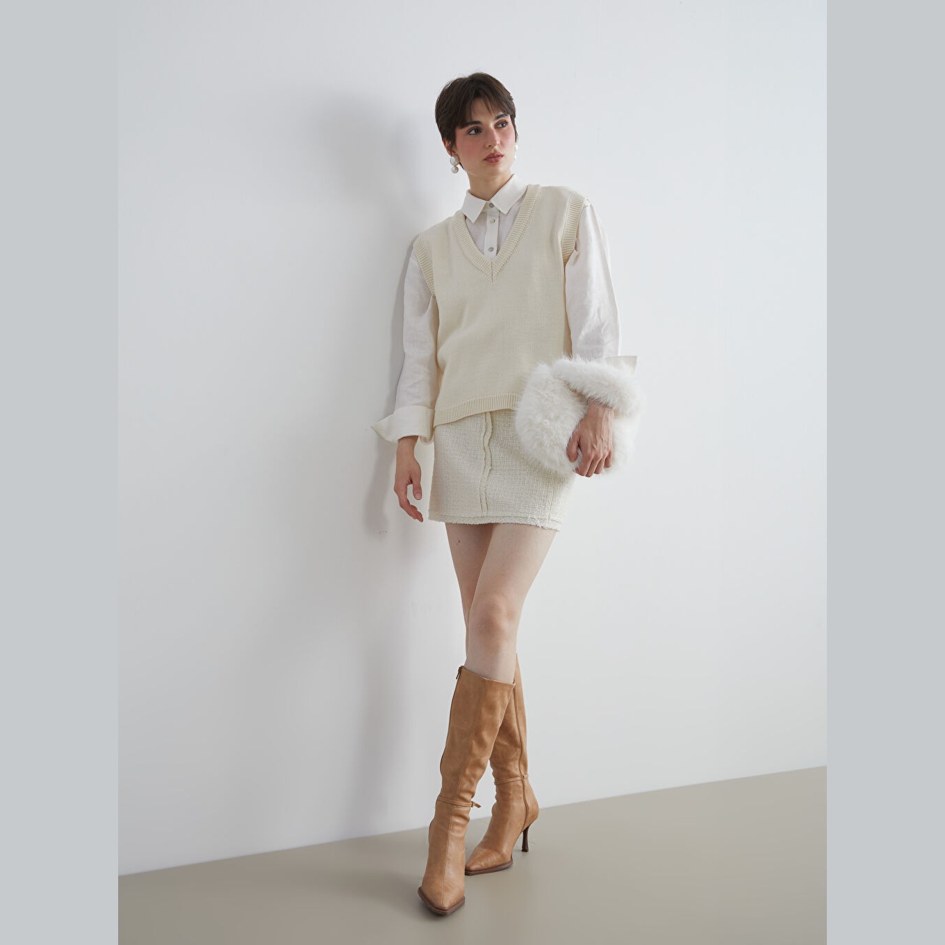 سويتر تريكو أنيق من LCW Vision بلون إكرو حيادي، مصمم بياقة V أنثوية، بدون أكمام، قصة Loose & Bol فضفاضة تمنحك مظهرًا مريحًا وانسيابيًا، تصميم سادة بدون نقوش، مصنوع من خامة Triko متوسطة السماكة بنسبة 100% أكرليك، بطول يُقاس من الكتف، مثالي للارتداء فوق قميص أبيض أو بلوزة بياقة عالية لإطلالة خريفية أنيقة وعملية.