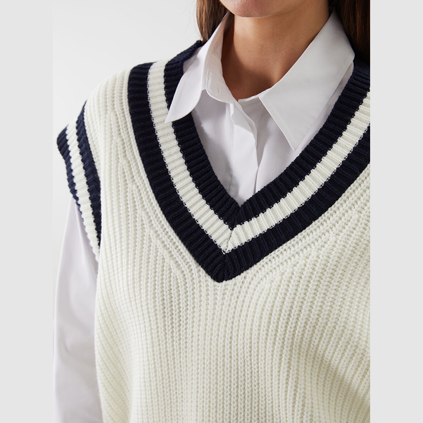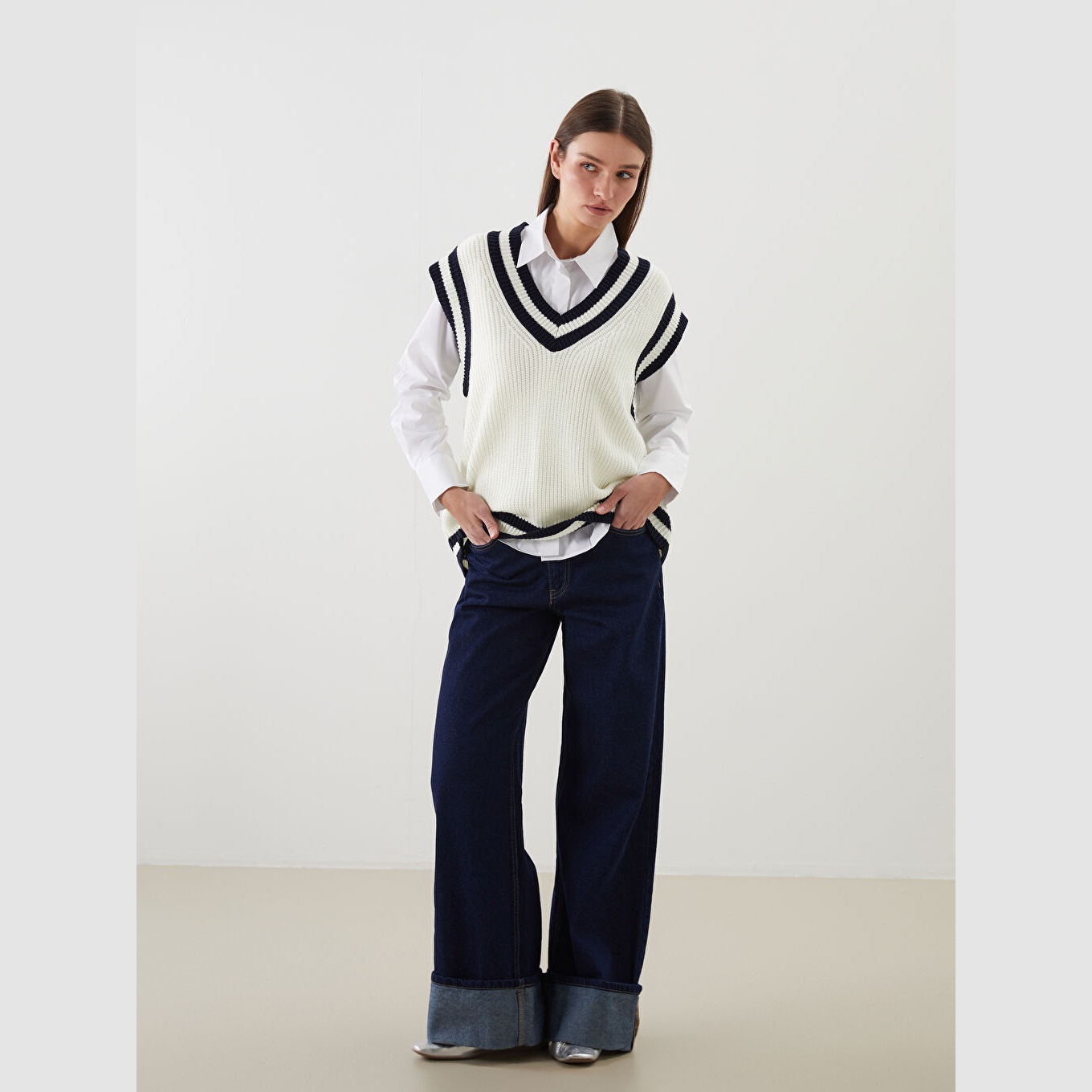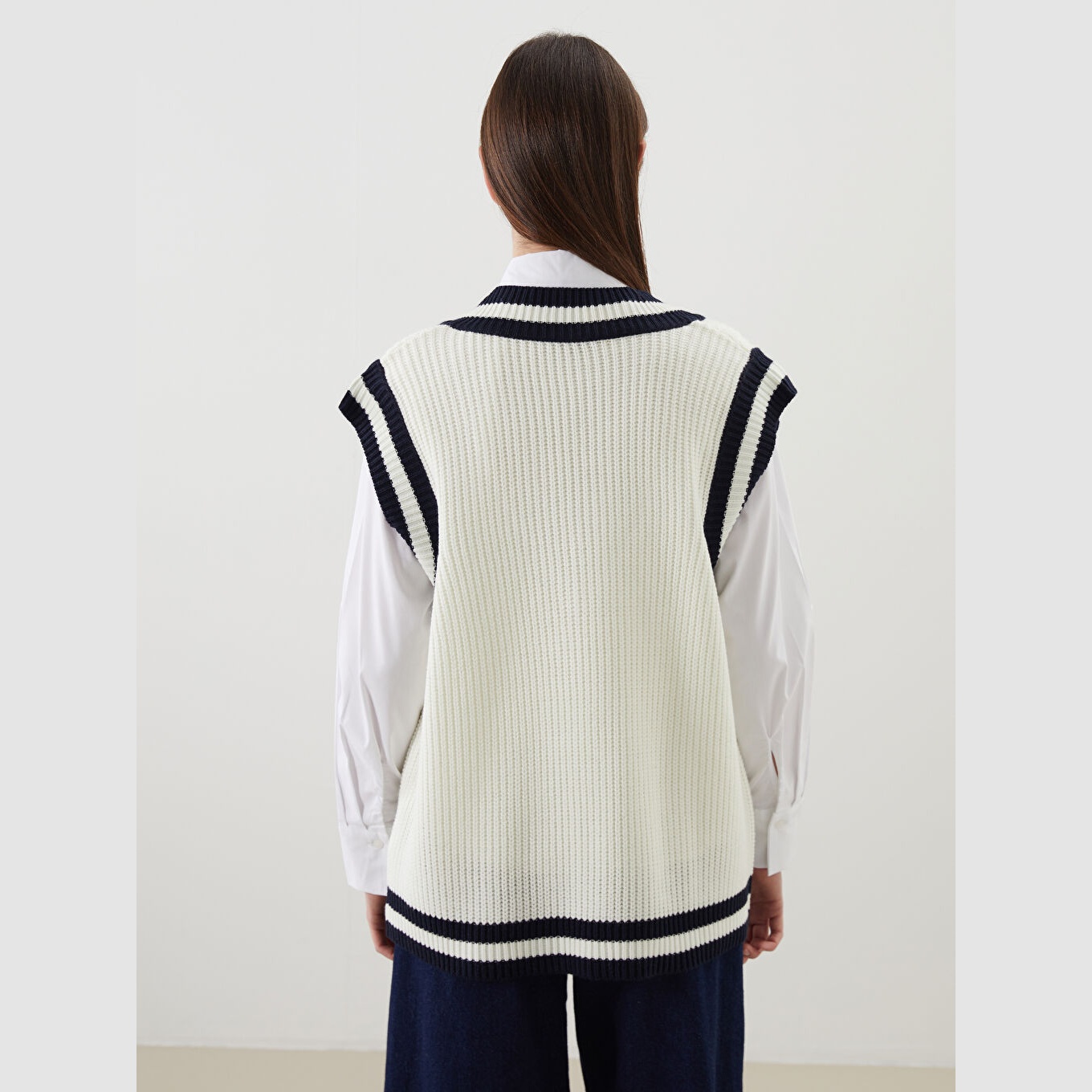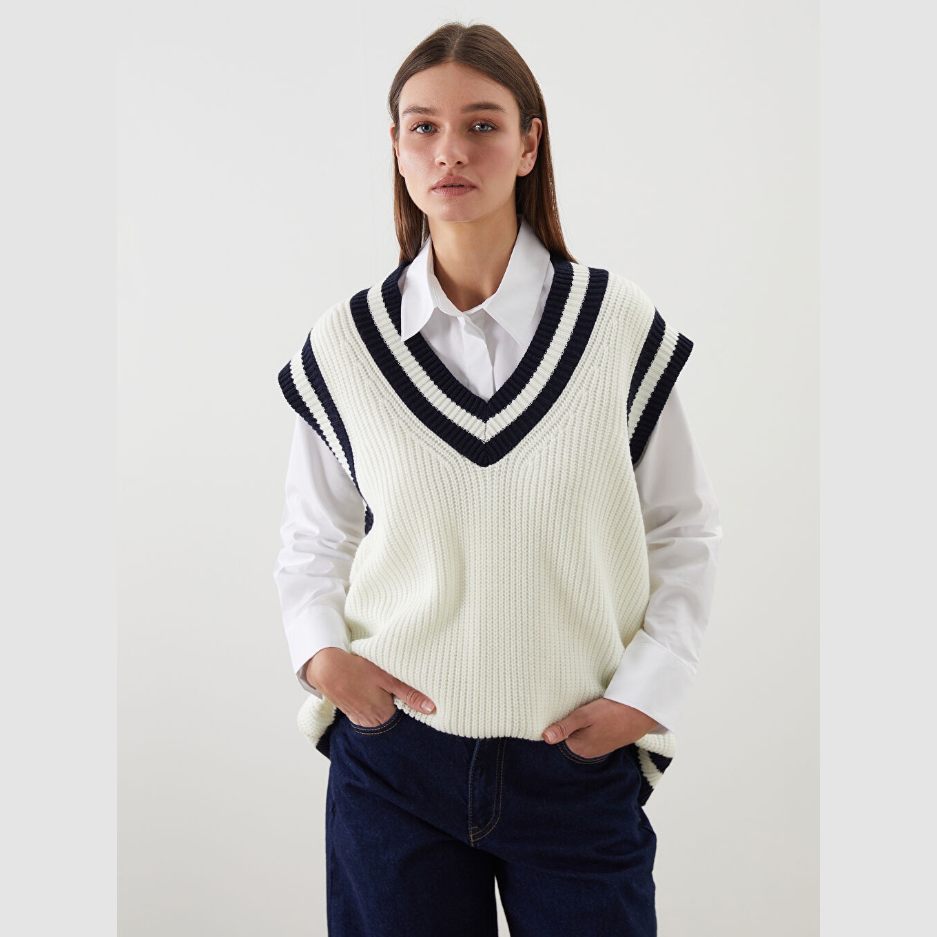سويتر نسائي بياقة V من LCW Modest – إكرو (قصة فضفاضة، خامة تريكو متوسطة السماكة، تصميم سادة، بدون أكمام، 100% أكرليك)