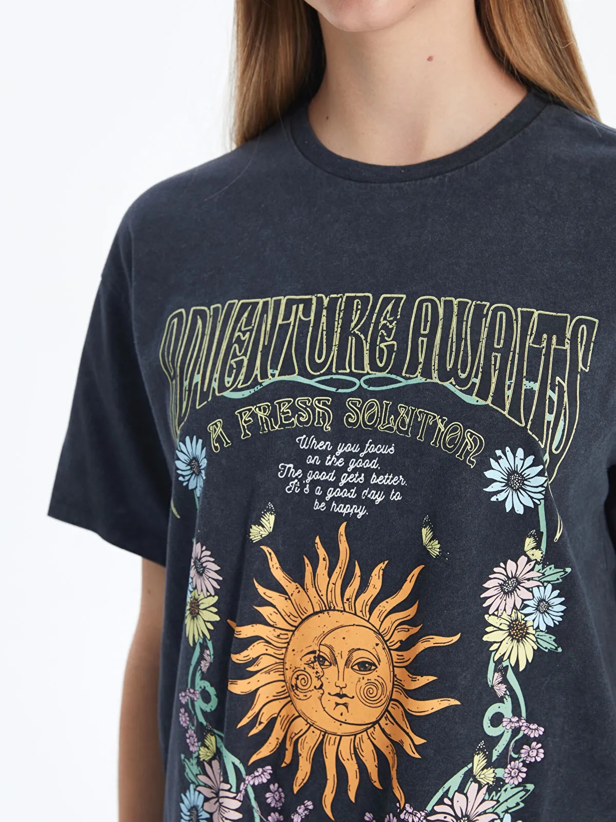 تيشيرت نسائي بلون أنثرسيت (رمادي داكن) أنيق، بياقة دائرية قصيرة وأكمام قصيرة، مزين بطبعة مرحة وعصرية تضفي لمسة شبابية وأنثوية. تصميم Loose & Bol يمنح حرية حركة تامة وراحة طوال اليوم، مناسب لإطلالة كاجوال أننيقة ومريحة.