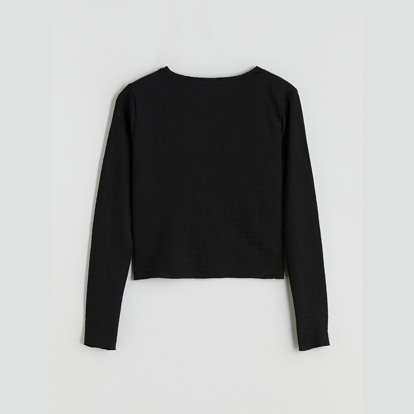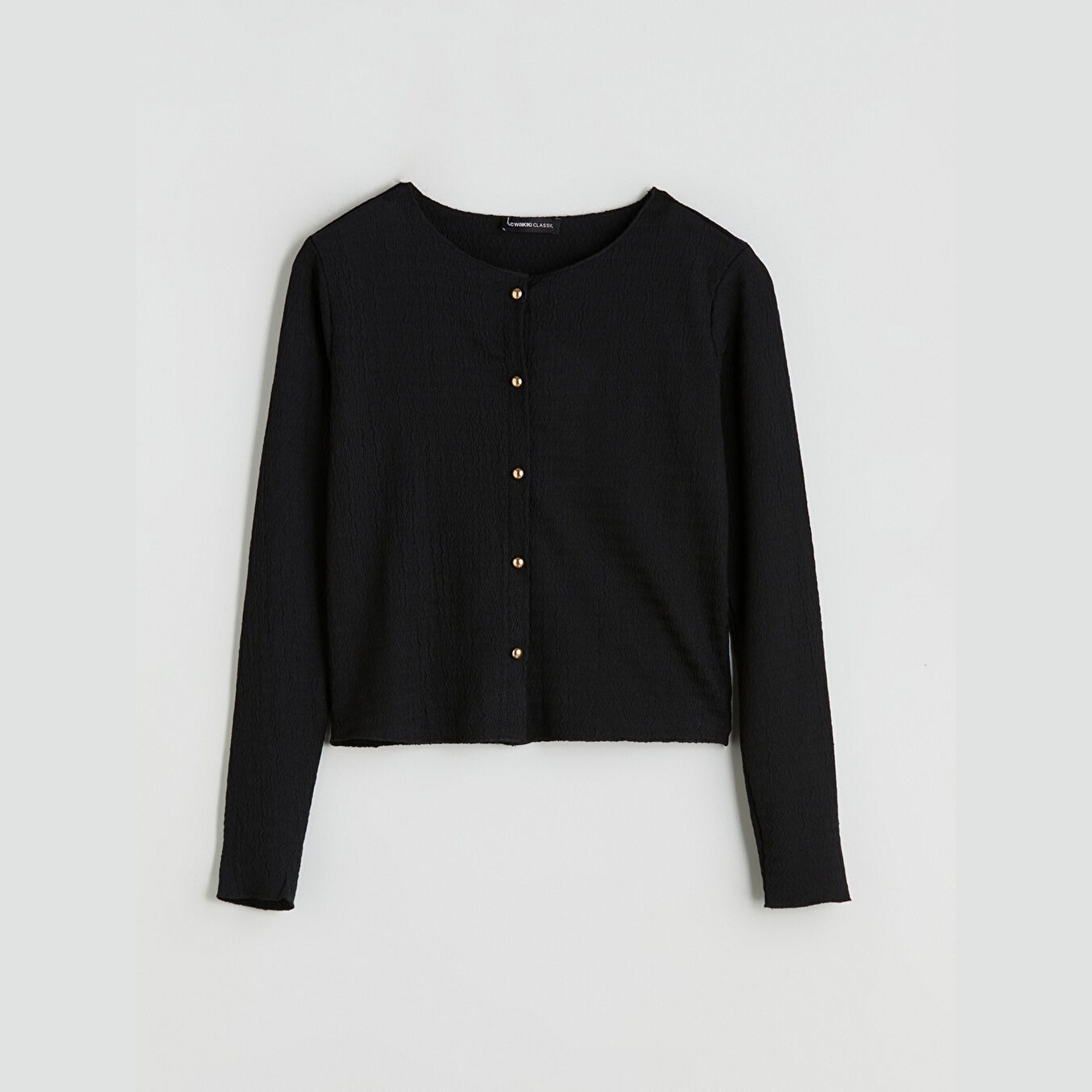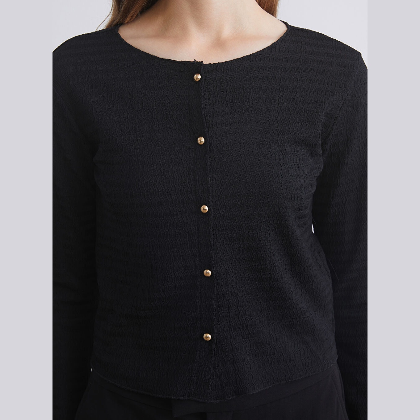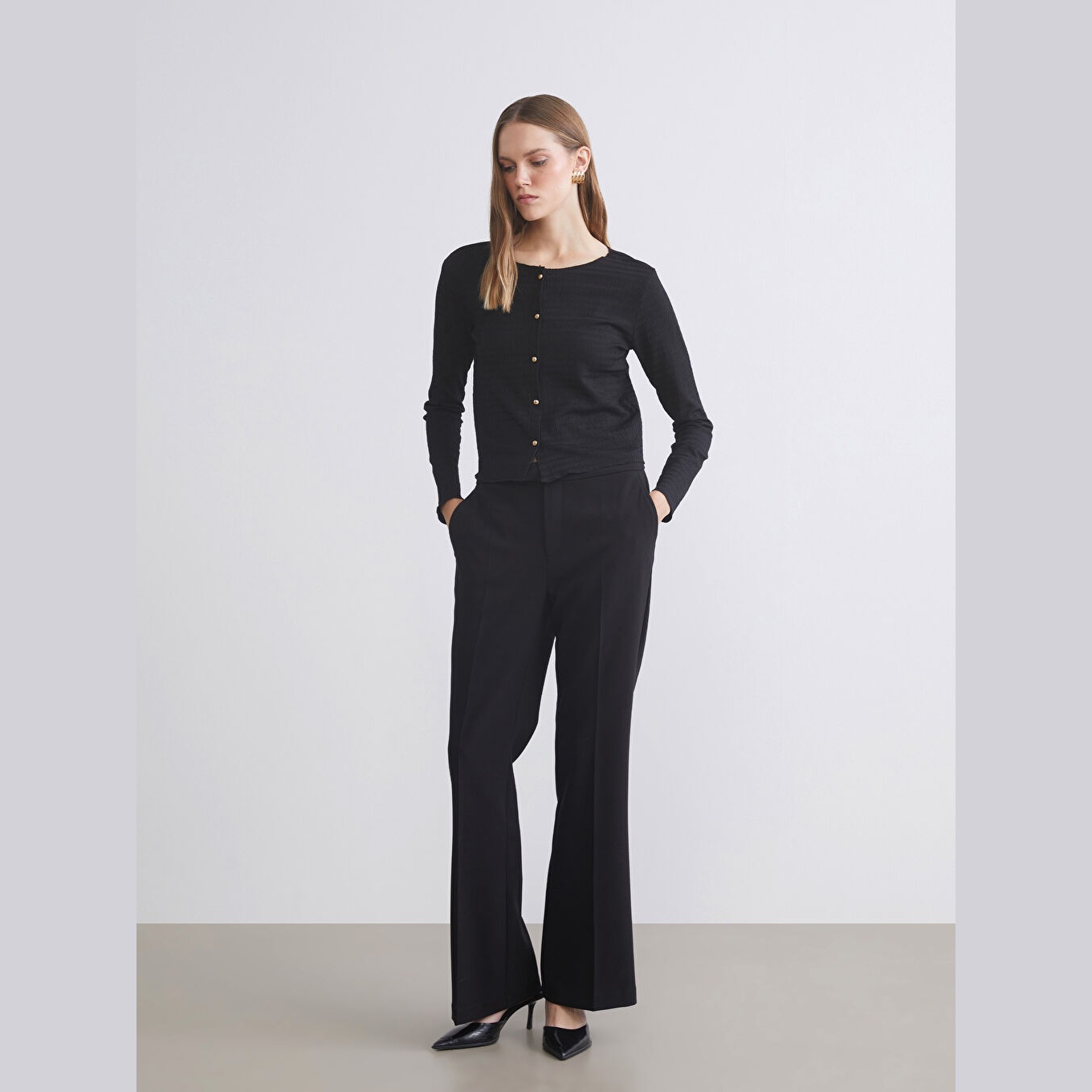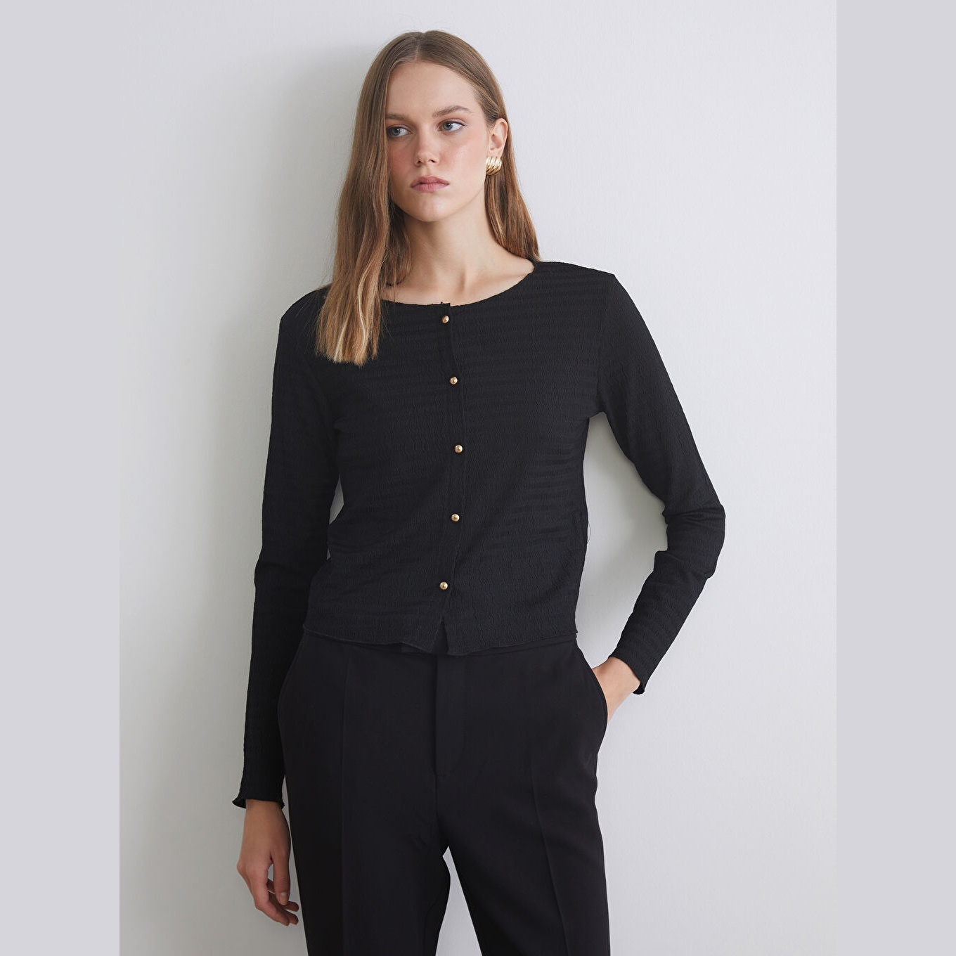 كارديغان نسائي بياقة دائرية من LCWAIKIKI Basic – أسود (قصة ضيقة، خامة راشيل خفيفة، تصميم سادة، أكمام طويلة، بأزرار أمامية)