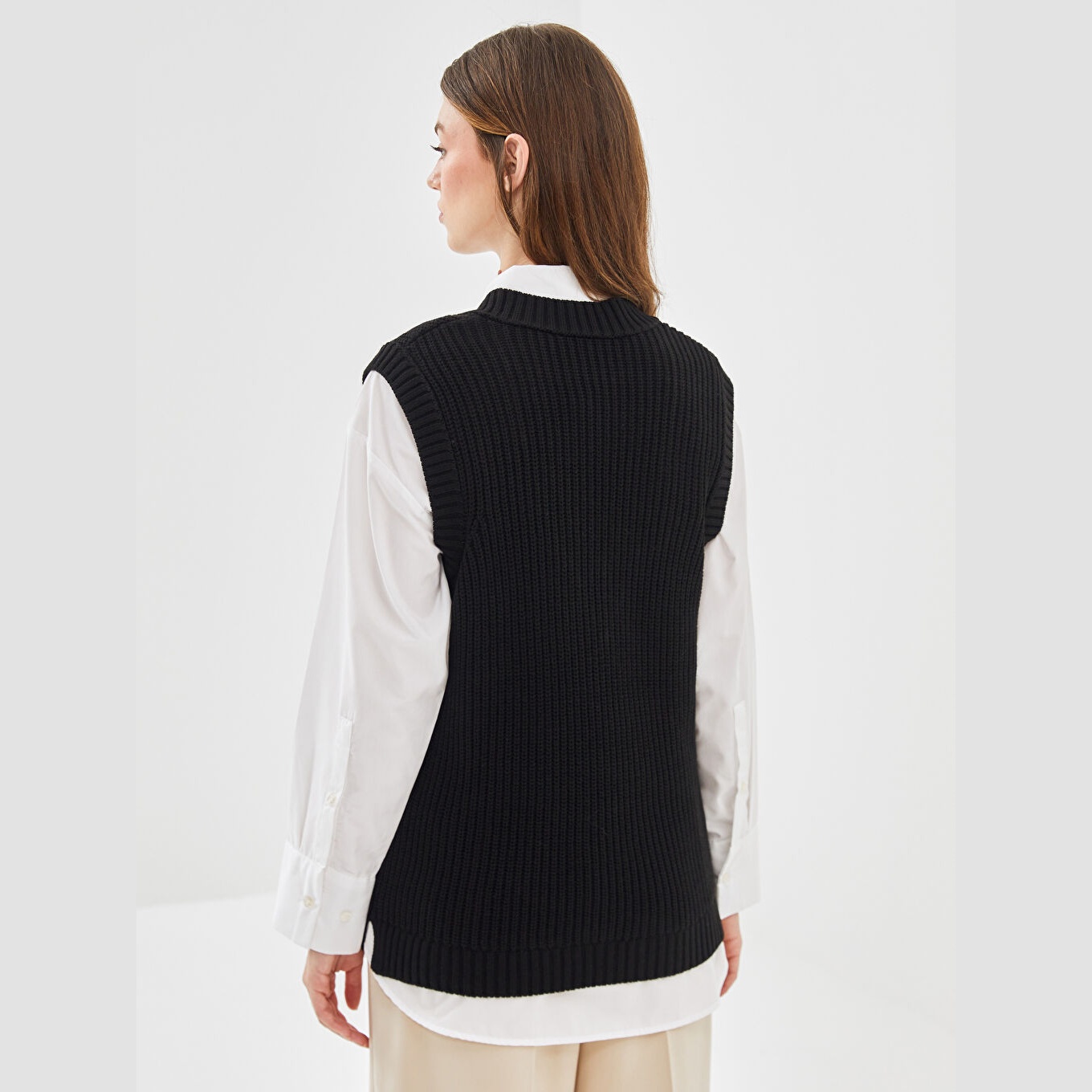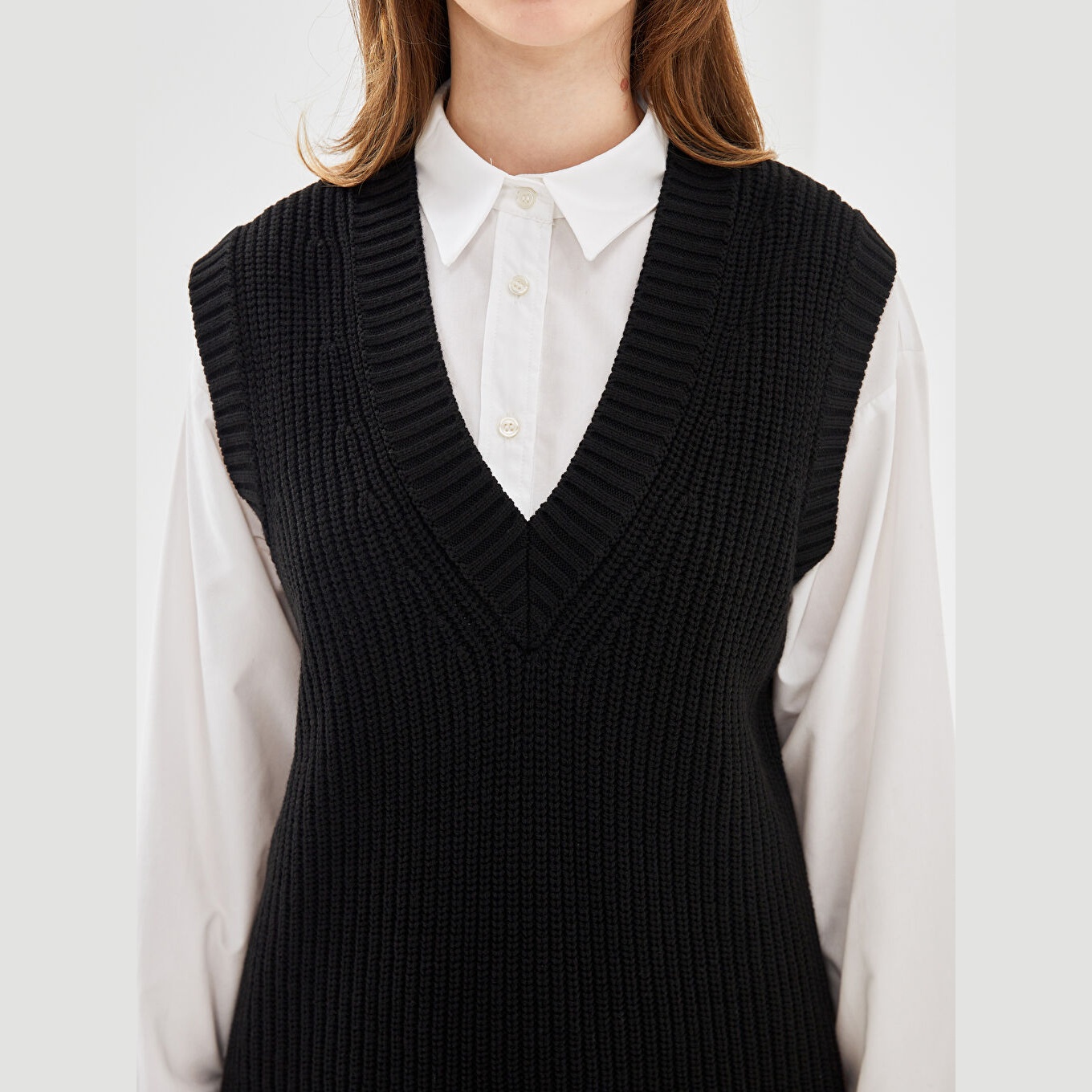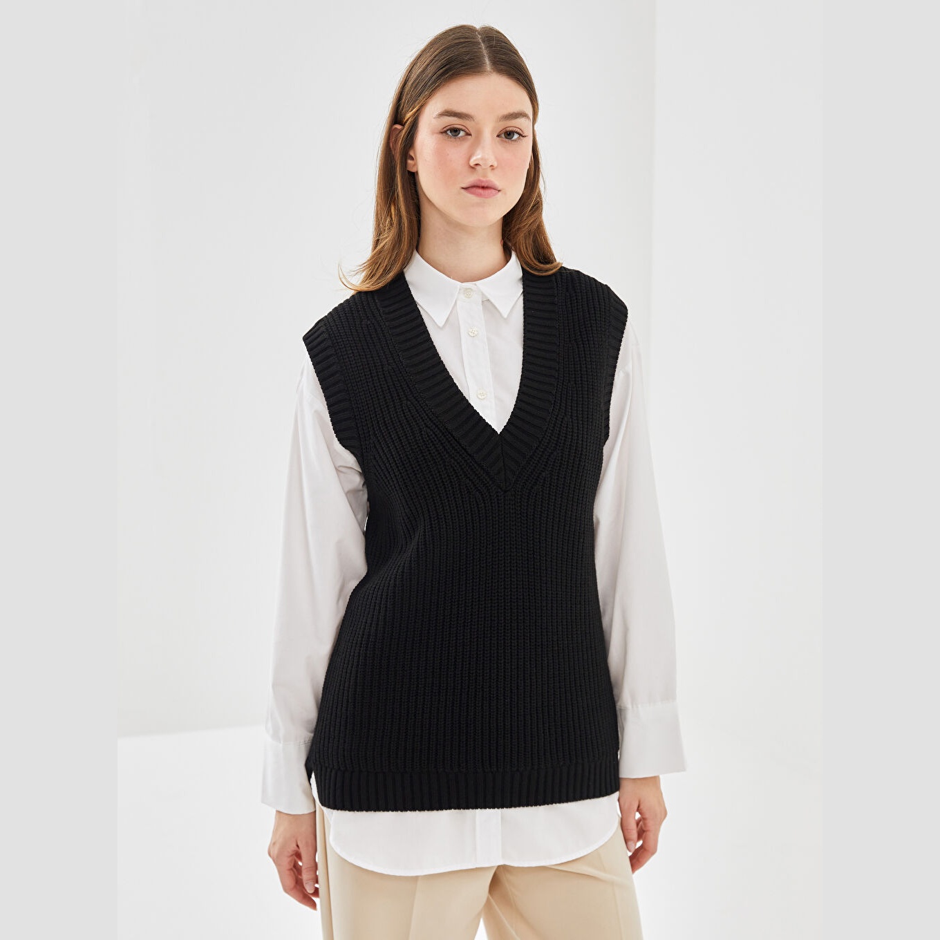 سويتر تريكو أنيق من LCW Modest بلون أسود كلاسيكي، مصمم بياقة V أنثوية، بدون أكمام، قصة Oversize واسعة تمنحك مظهرًا مريحًا وانسيابيًا، تصميم سادة بدون نقوش، مصنوع من خامة Triko متوسطة السماكة بتركيبة 100% أكرليك، بطول يُقاس من الكتف، جزء من مجموعة Tesettür Giyim المحتشمة، مثالي للتنسيق مع قمصان بياقة عالية أو بلوزات ناعمة لإطلالة عملية وعصرية.