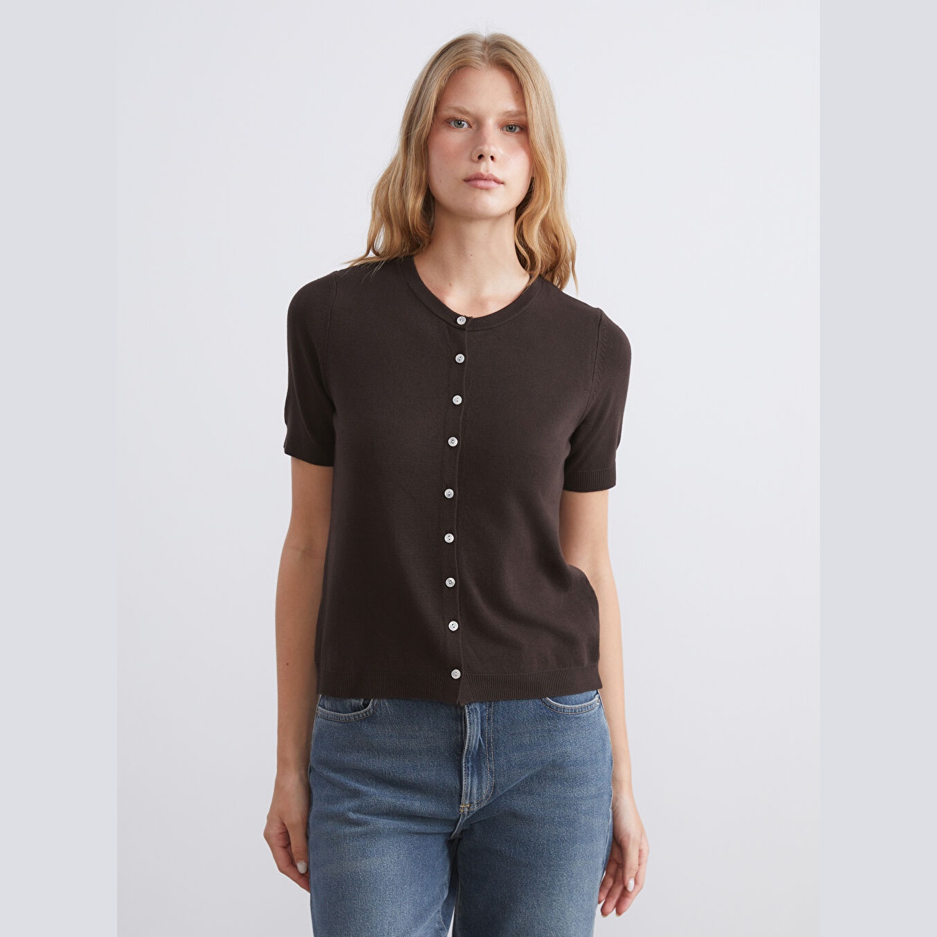كارديغان نسائي بياقة دائرية من LCW Vision – أخضر (قصة ضيقة، خامة تريكو خفيفة، تصميم سادة، أكمام قصيرة، بأزرار أمامية)
