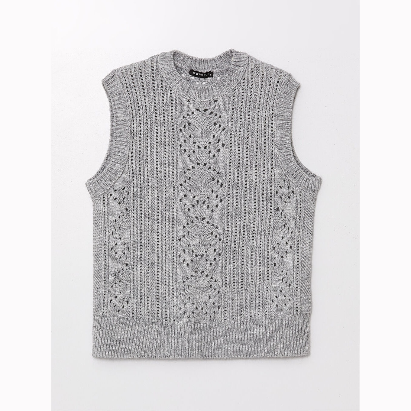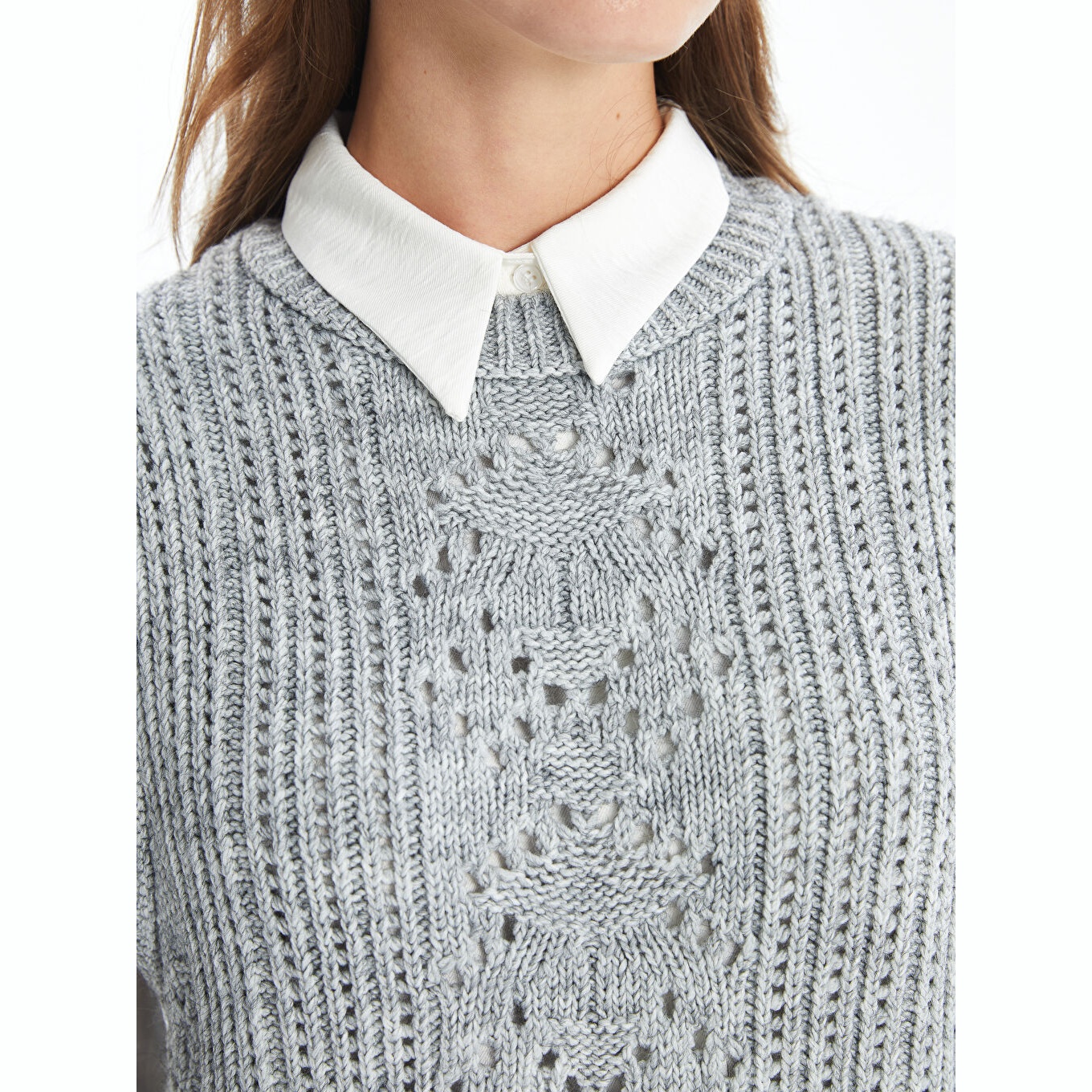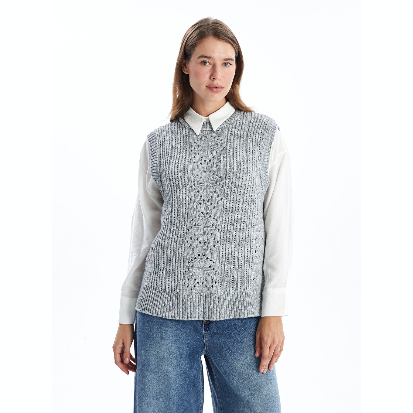 سويتر نسائي بياقة دائرية من LCW Modest – رمادي (قصة واسعة، خامة تريكو متوسطة السماكة، تصميم Ajurlu مفرغ، بدون أكمام، من مجموعة Tesettür Giyim)