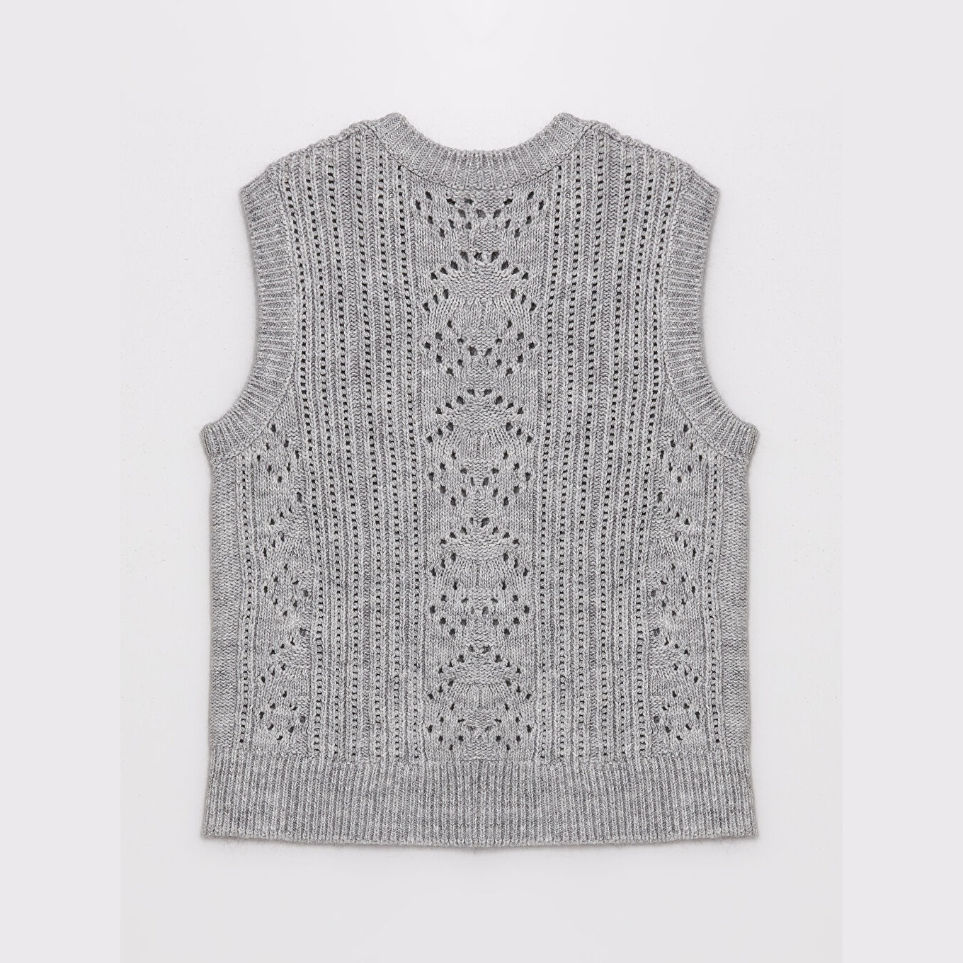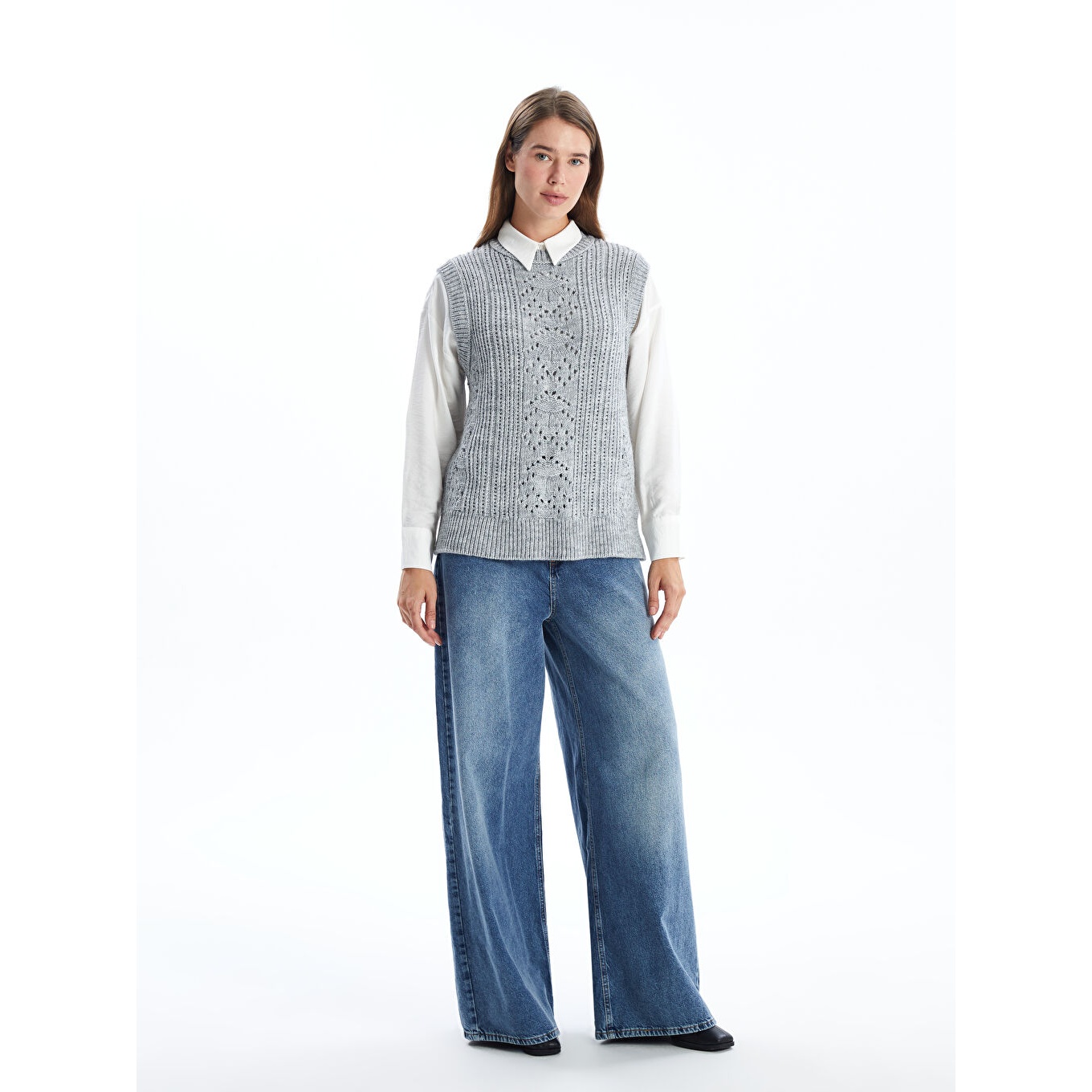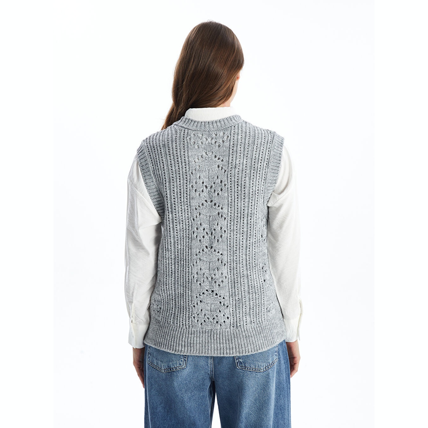 سويتر نسائي بياقة دائرية من LCW Modest – رمادي (قصة واسعة، خامة تريكو متوسطة السماكة، تصميم Ajurlu مفرغ، بدون أكمام، من مجموعة Tesettür Giyim)