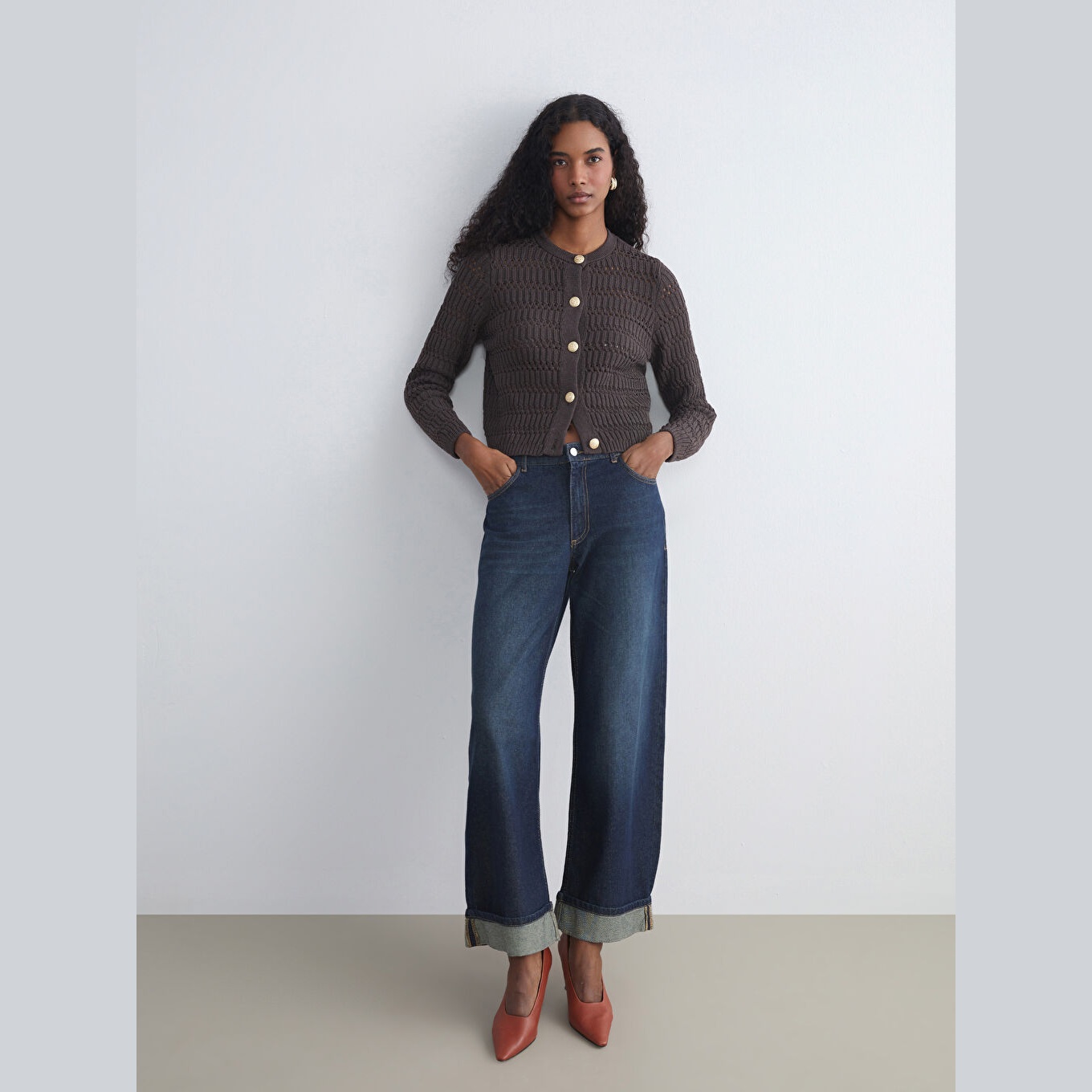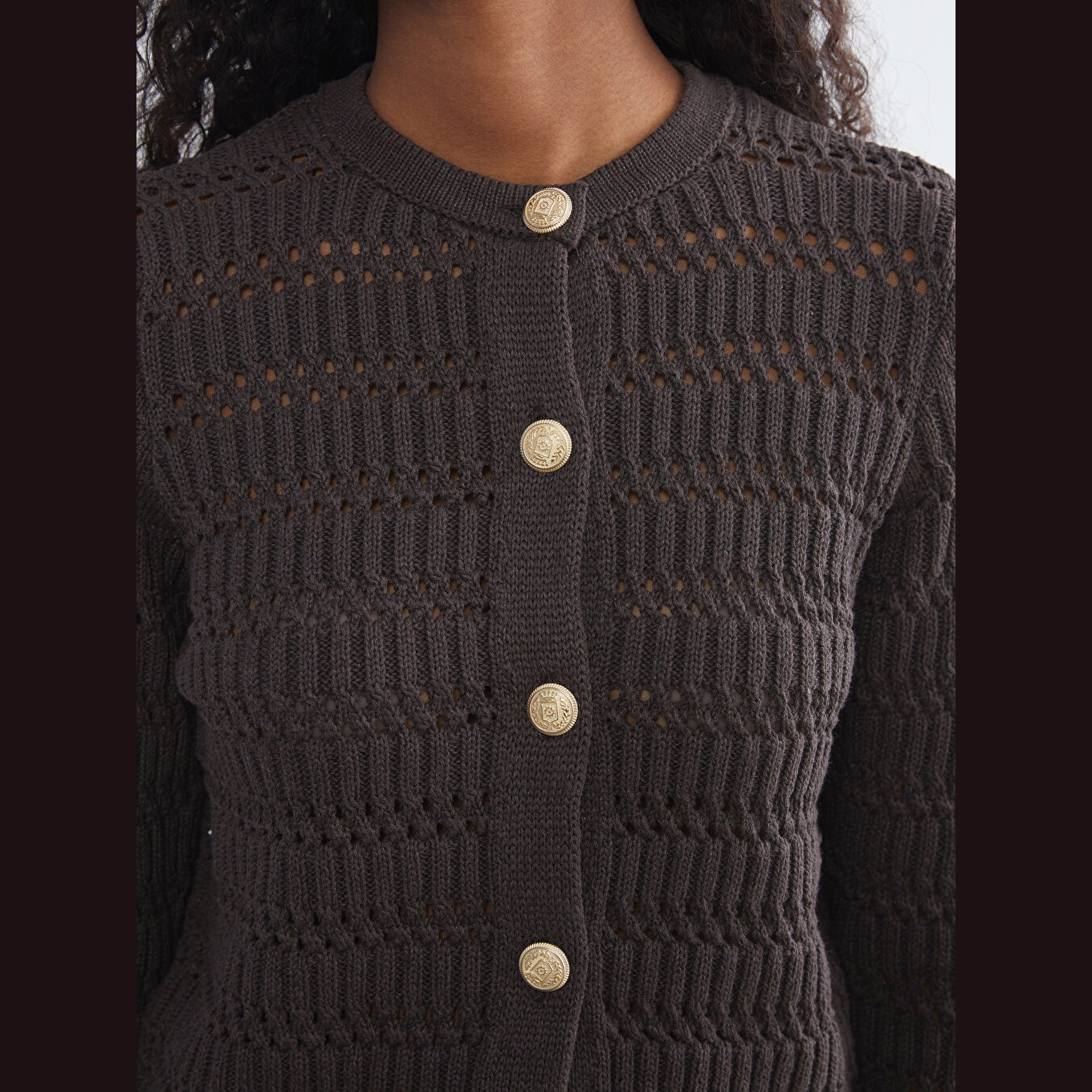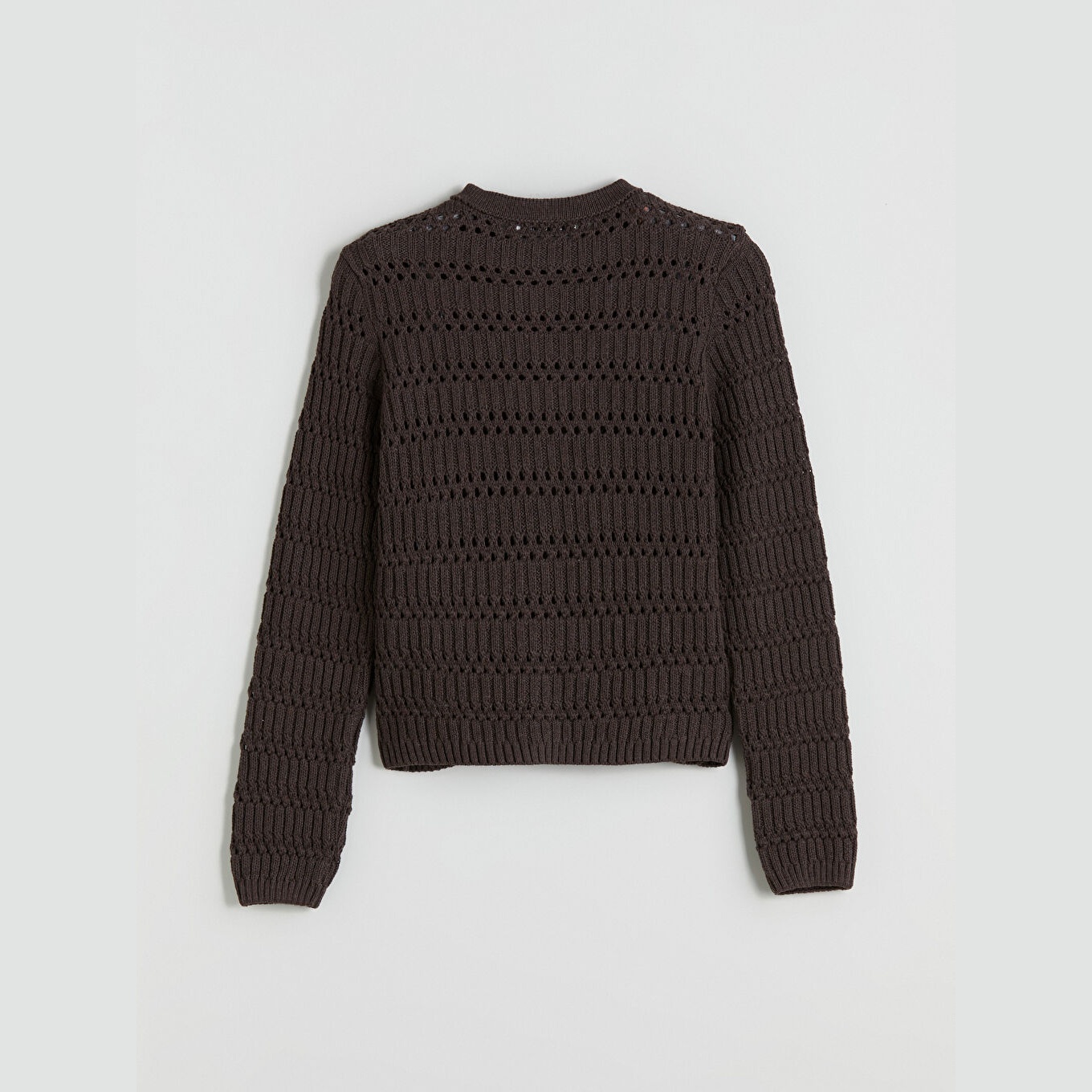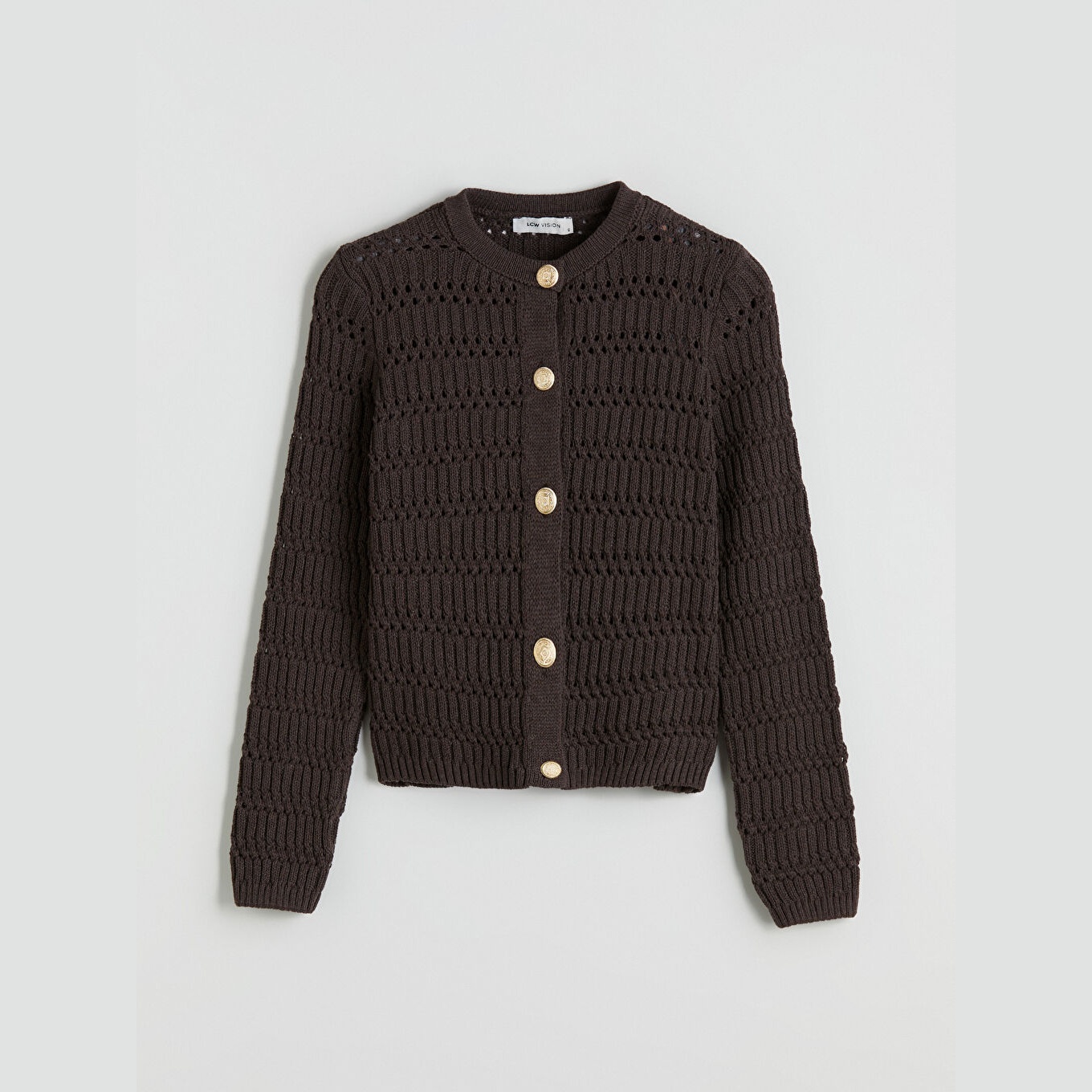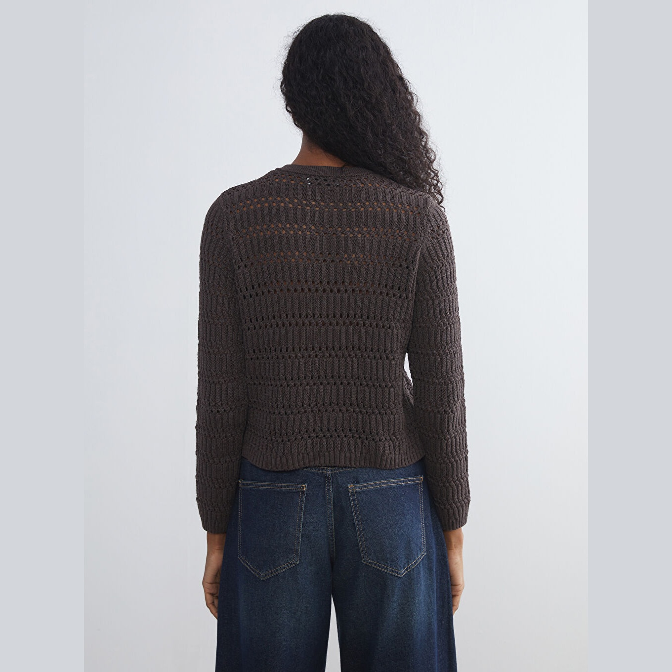 كارديغان نسائي بياقة دائرية من LCW Vision – بني (قصة ضيقة، خامة تريكو متوسطة السماكة، تصميم Ajurlu مفرغ، أكمام طويلة، مزيج قطن وبوليستر)