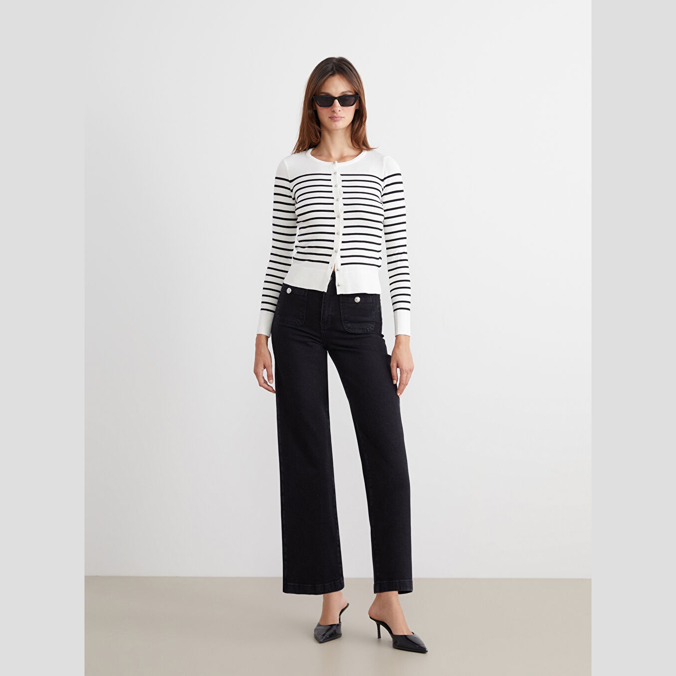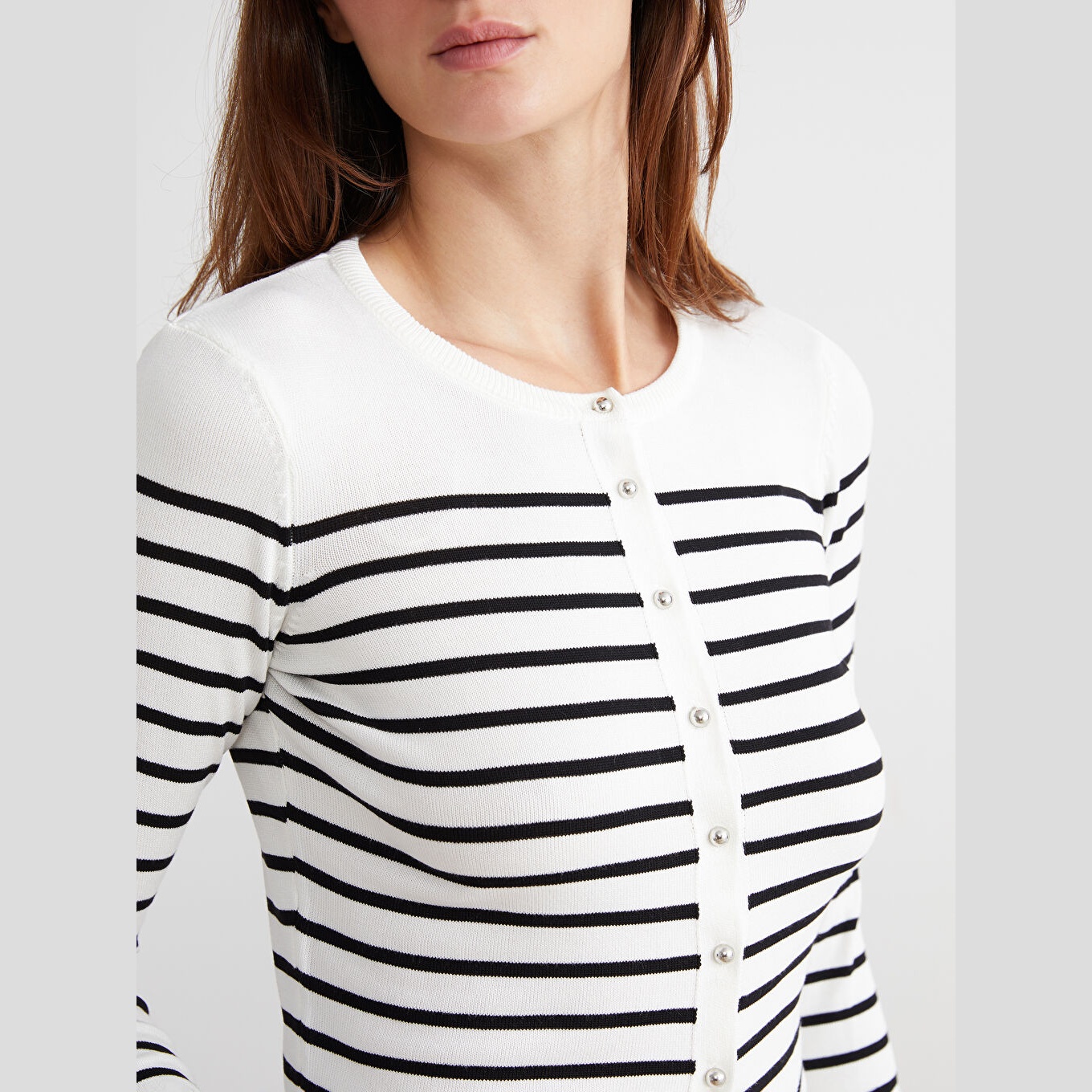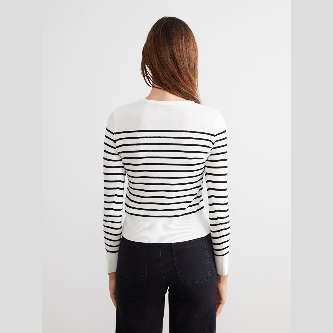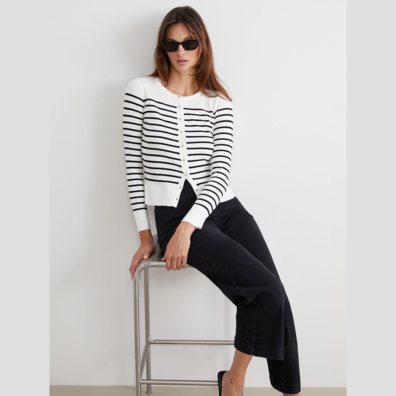 كارديغان نسائي بياقة دائرية من LCW Vision – إكرو مخطط (قصة ضيقة، خامة تريكو خفيفة، تصميم بخطوط، أكمام طويلة)