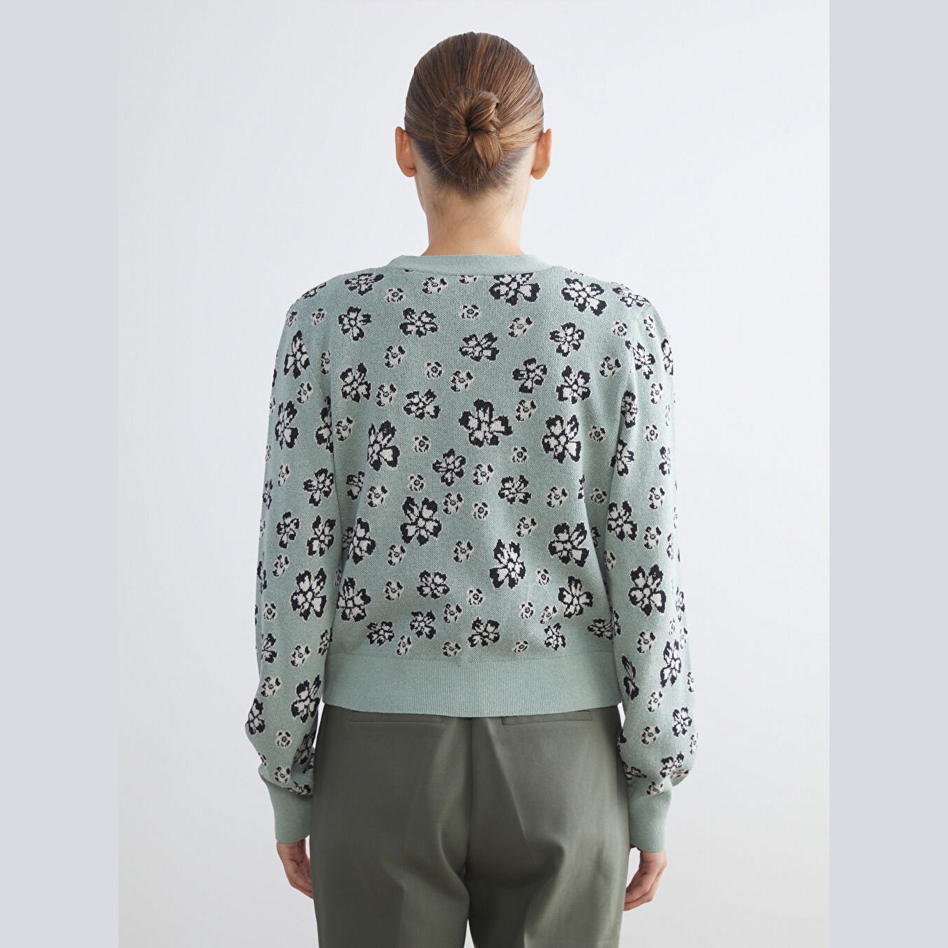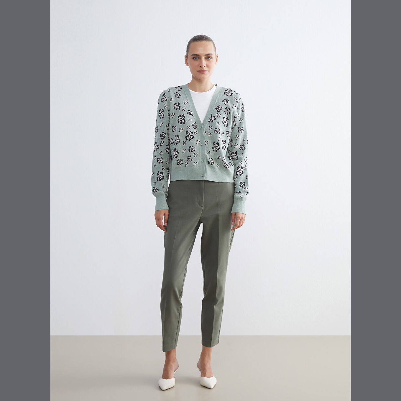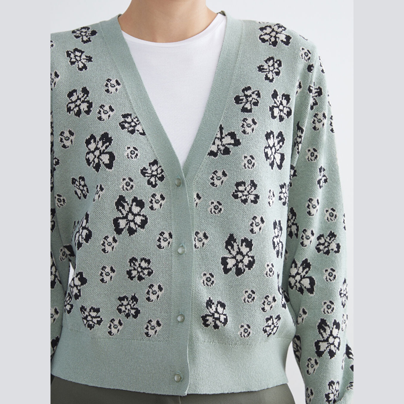 كارديغان نسائي بياقة V من LCW ECO – أخضر مزهر (قصة قياسية، خامة تريكو متوسطة السماكة، تصميم مطبوع بالزهور، أكمام طويلة، مزيج قطن وبوليستر، بزر أمامي)