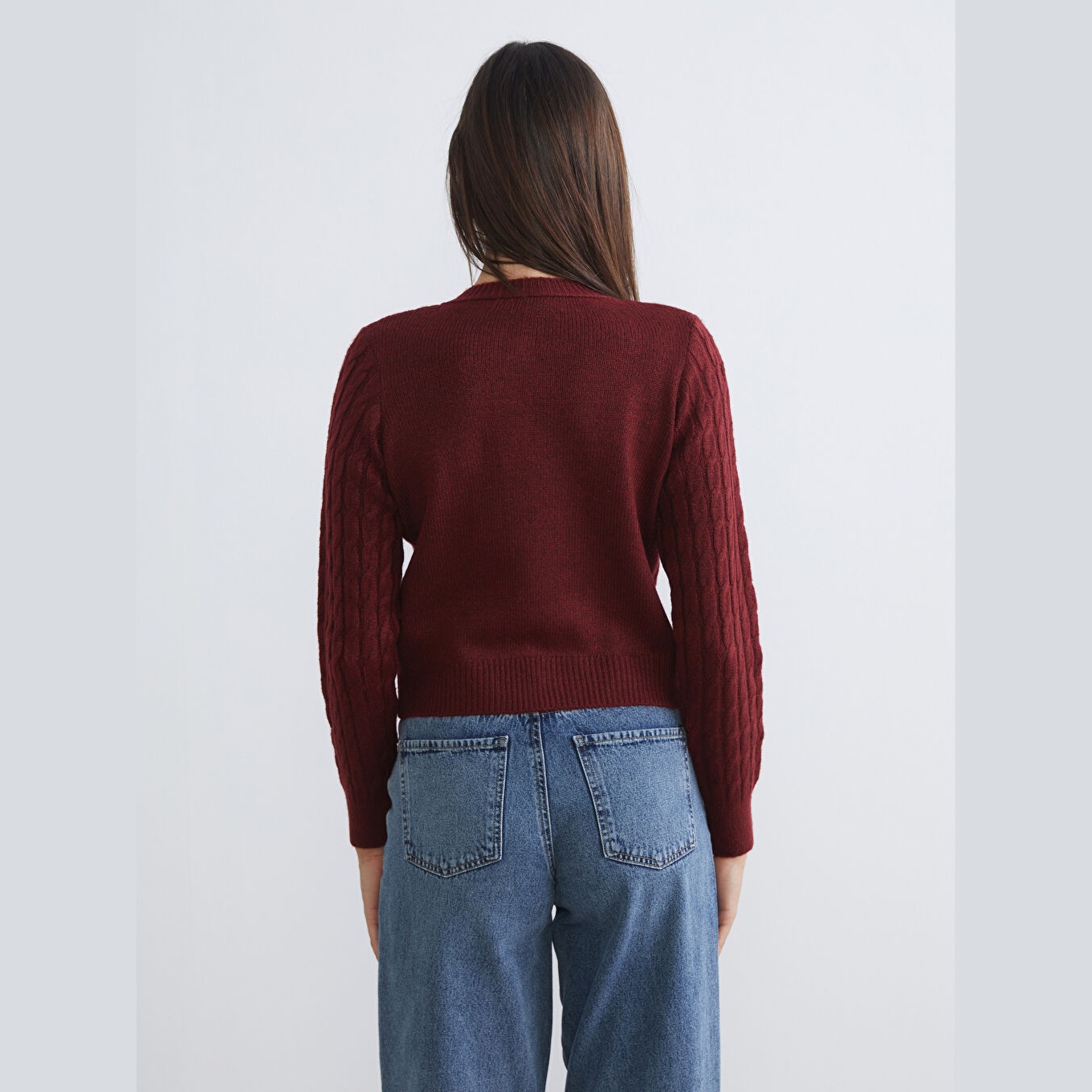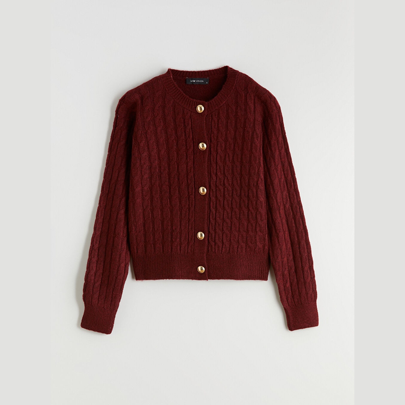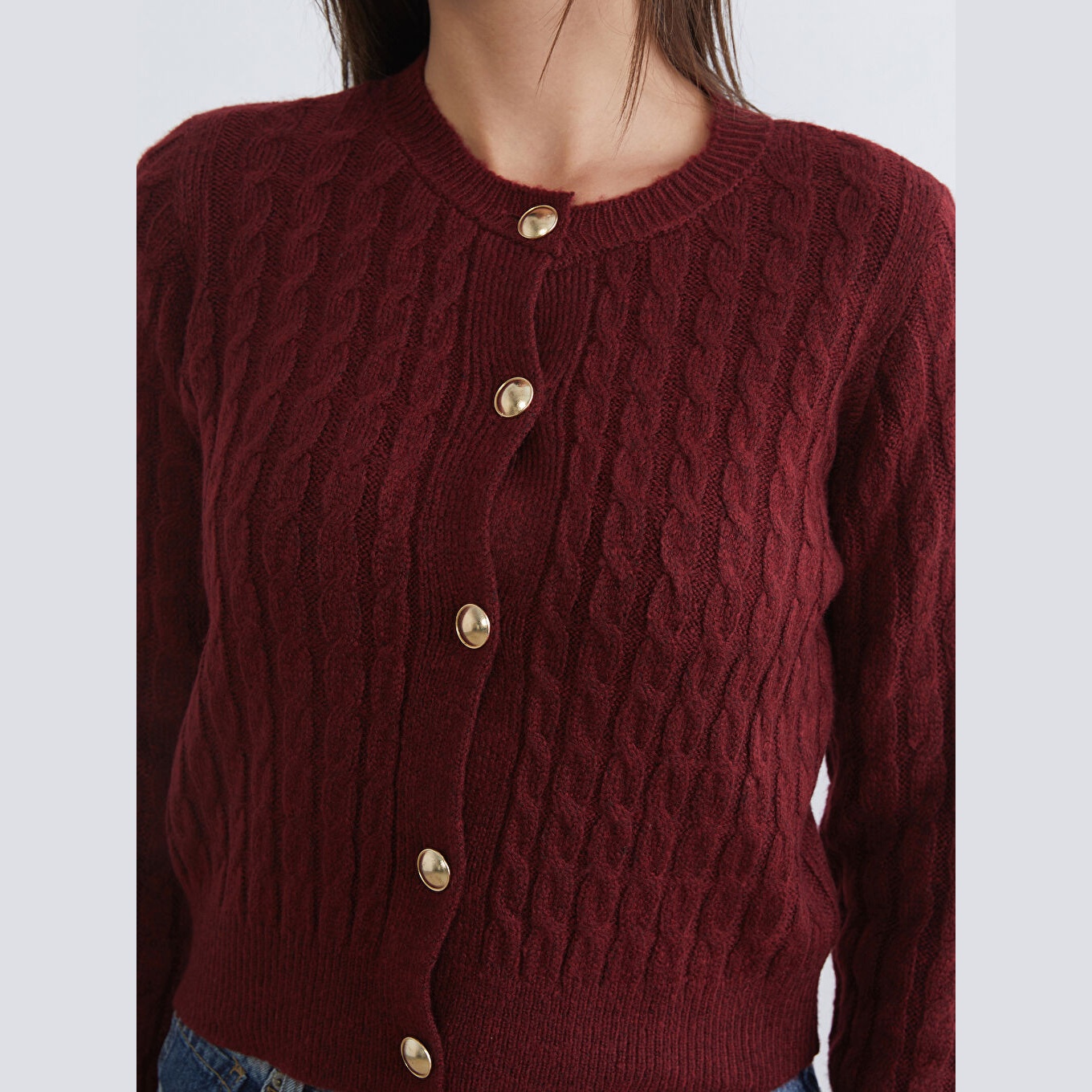 كارديغان نسائي بياقة دائرية من LCW Vision – بوردو مزخرف (قصة قياسية، خامة تريكو متوسطة السماكة، تصميم بنقشة ذاتية، أكمام طويلة، مزيج أكريليك وبوليستر، بزر أمامي)