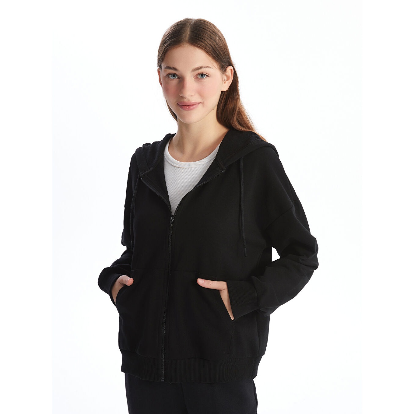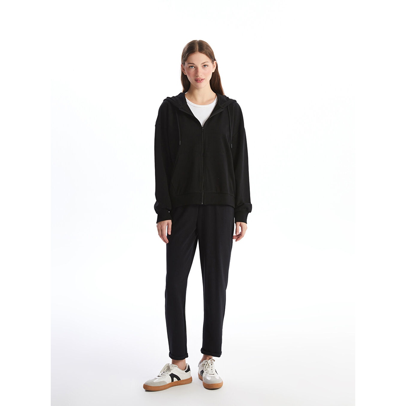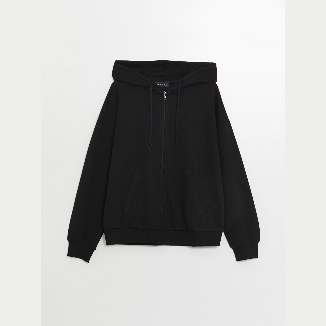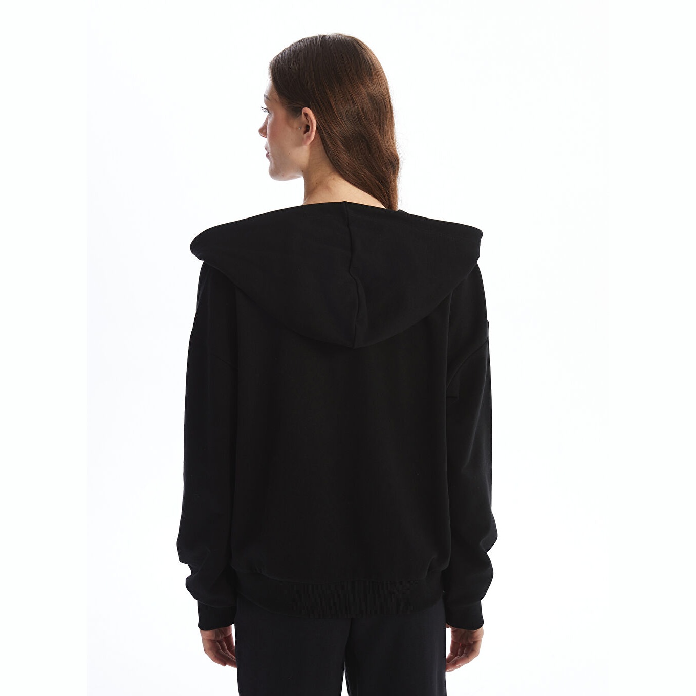 سويت شيرت نسائي بسحاب وغطاء رأس من LCW Vision – أسود (قصة واسعة، خامة ثلاثية الخيوط متوسطة السماكة، تصميم سادة، أكمام طويلة، مزيج قطن وبوليستر، ضمن مجموعة المقاسات الكبيرة)