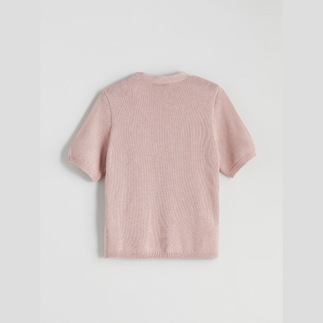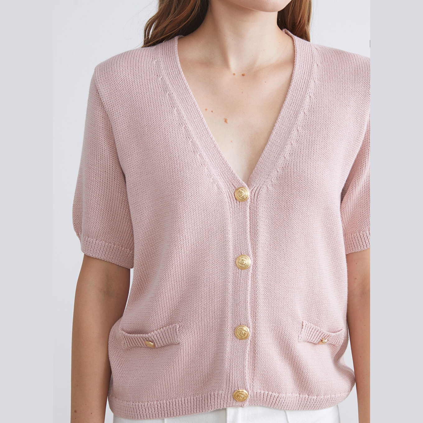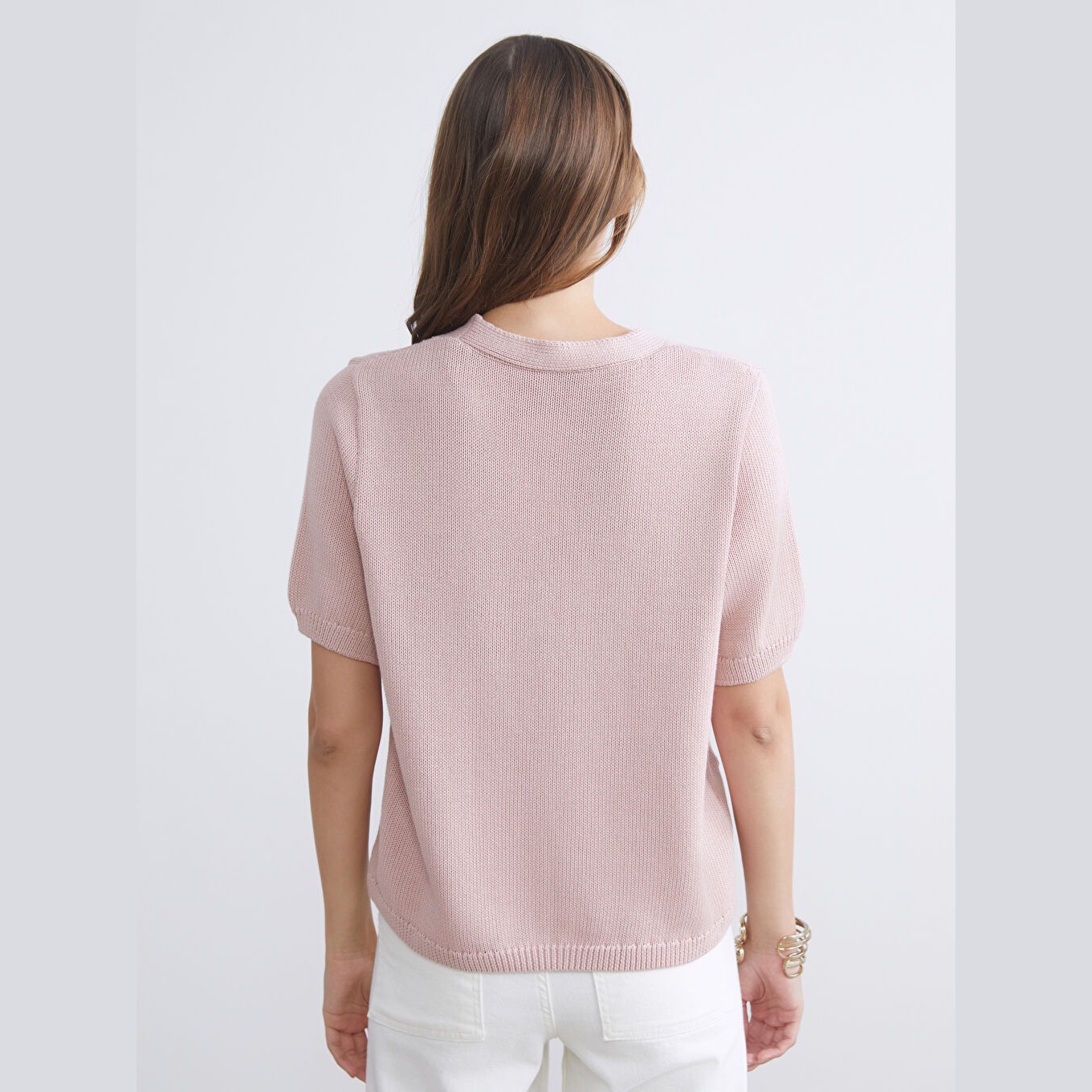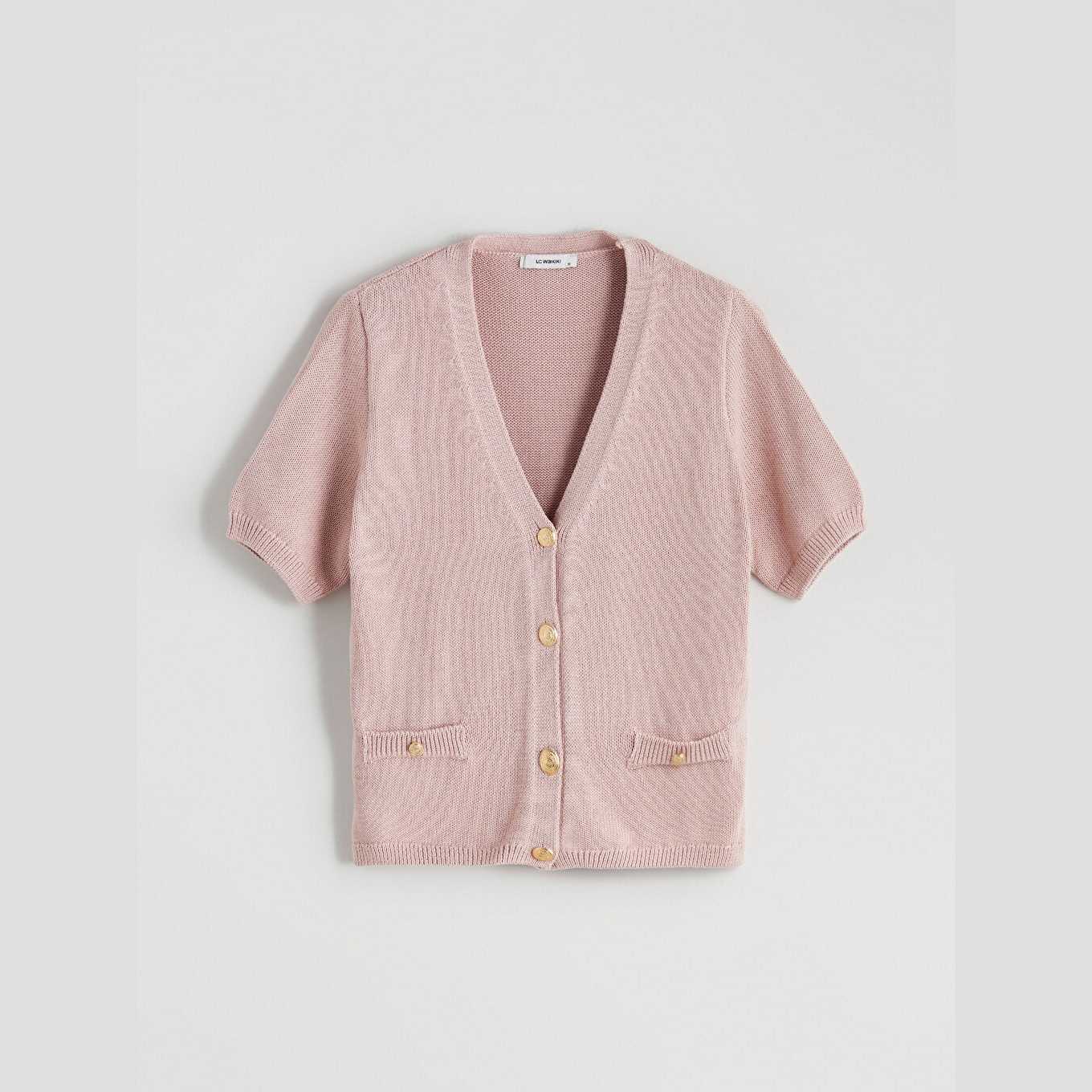 كارديغان نسائي بياقة V من LCW ECO – وردي (قصة قياسية، خامة تريكو متوسطة السماكة، تصميم سادة، أكمام قصيرة، 100% قطن، بزر أمامي، صديق للبيئة)